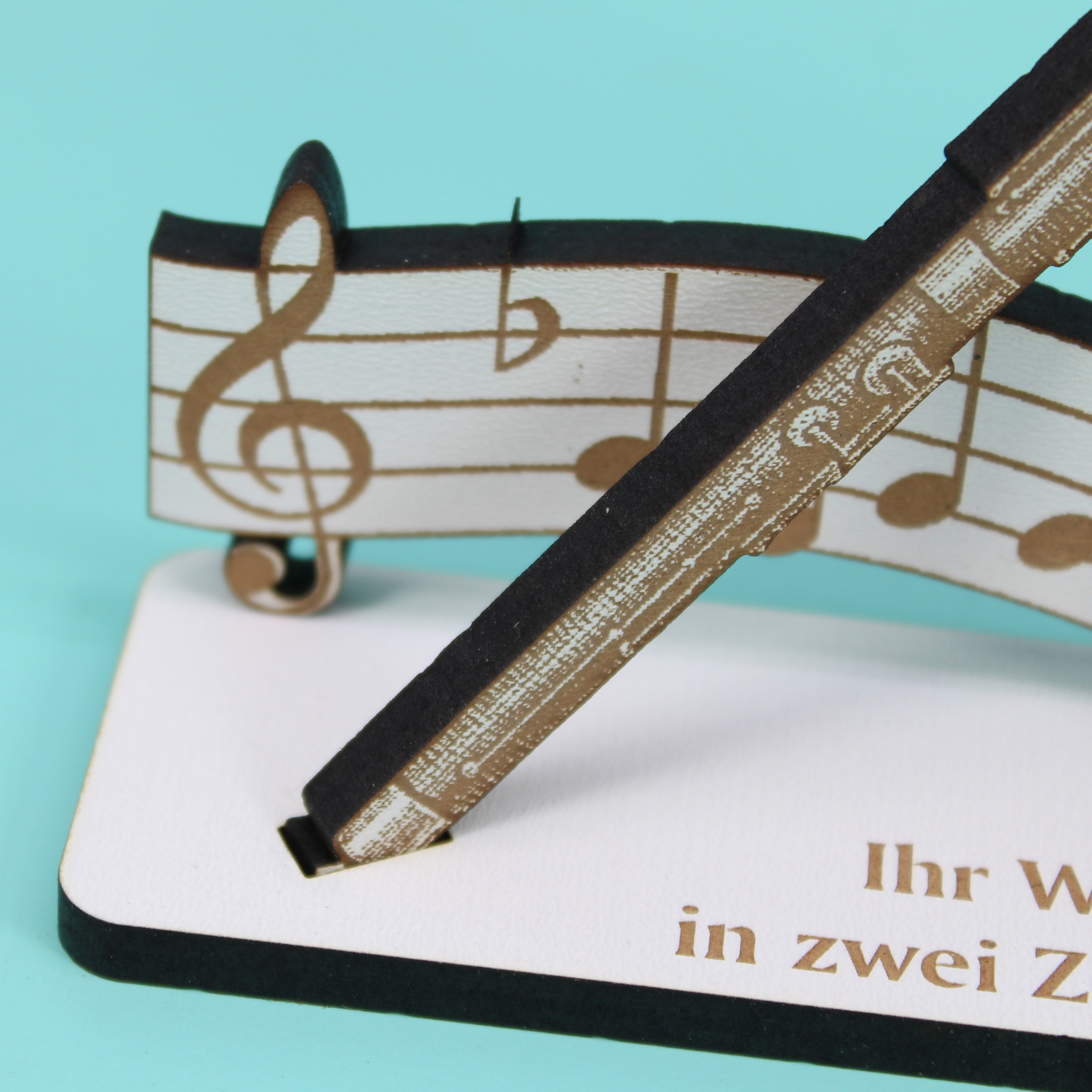 Besonders praktisch: Der Sockel ist personalisierbar. Dein Wunschtext (z. B. Name, Datum, Bandname, kurze Widmung) wird präzise eingraviert und macht den Aufsteller zum persönlichen Geschenk für Musiker, Hobbymusiker, Musiklehrer oder die Lieblingsband. So eignet sich das Stück hervorragend als Geldgeschenk (für Instrumenten-Anschaffungen, Unterricht, Konzerttrip) oder als Geschenk zum Geburtstag, Abschluss, Konzert oder Jubiläum.