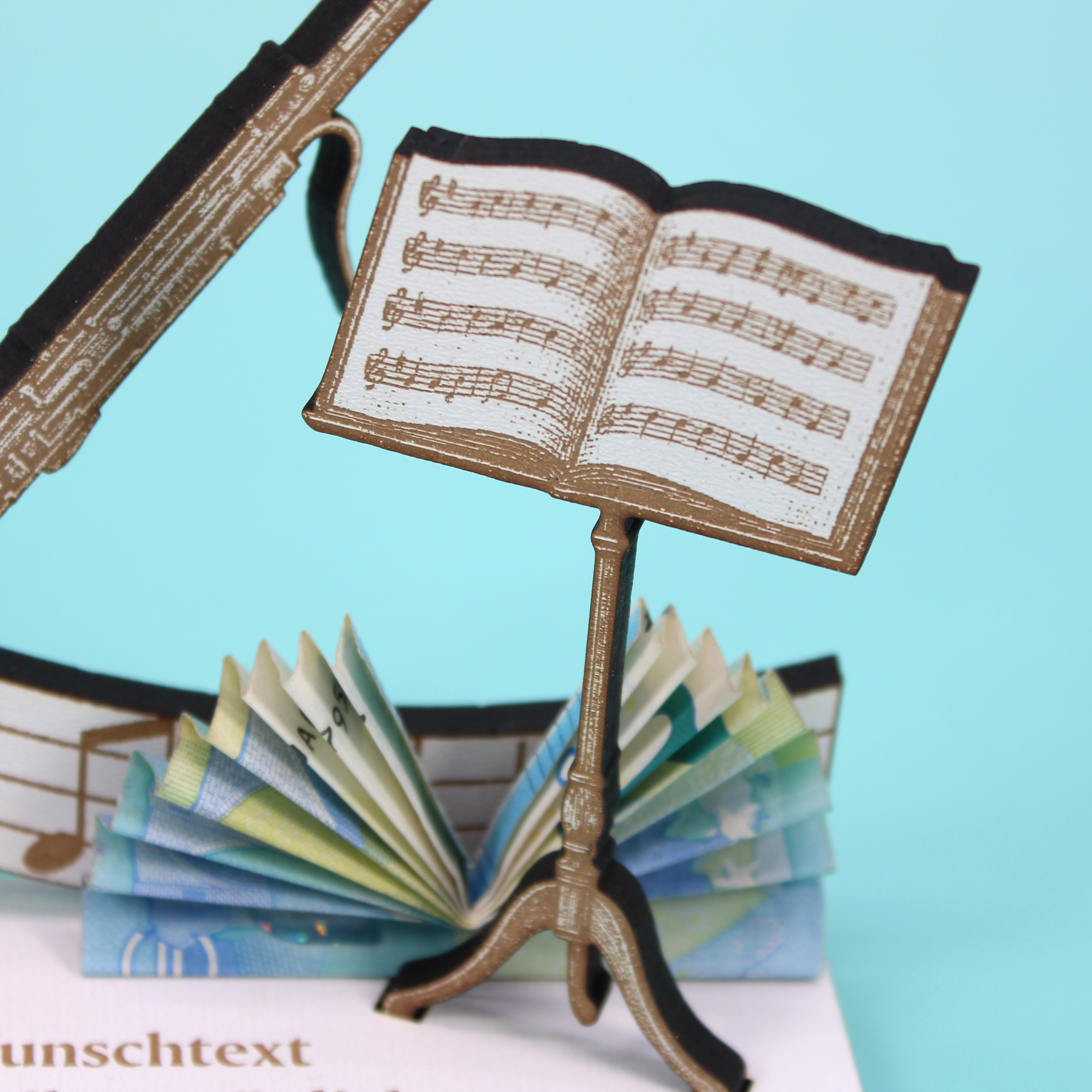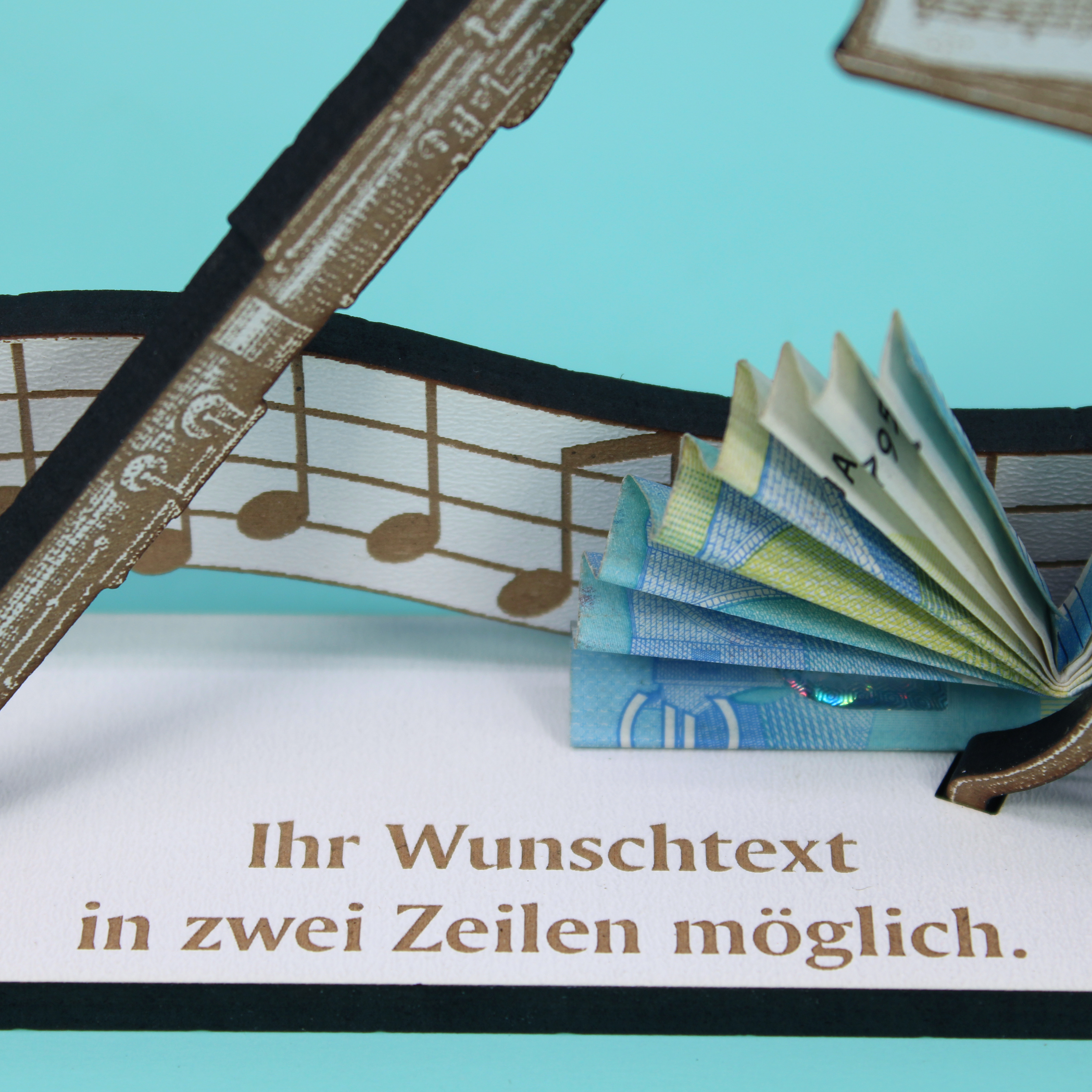 Freistehend platziert auf Regal, Sideboard, Schreibtisch oder Fensterbank wird er zum Blickfang – solo oder kombiniert mit Vinyls, Noten, Plektren, Drumsticks oder Kopfhörerständer. Ideal, um Geldscheine, Gutscheine oder Karten dekorativ beizulegen und so ein wertiges Geldgeschenk mit persönlicher Note zu überreichen.