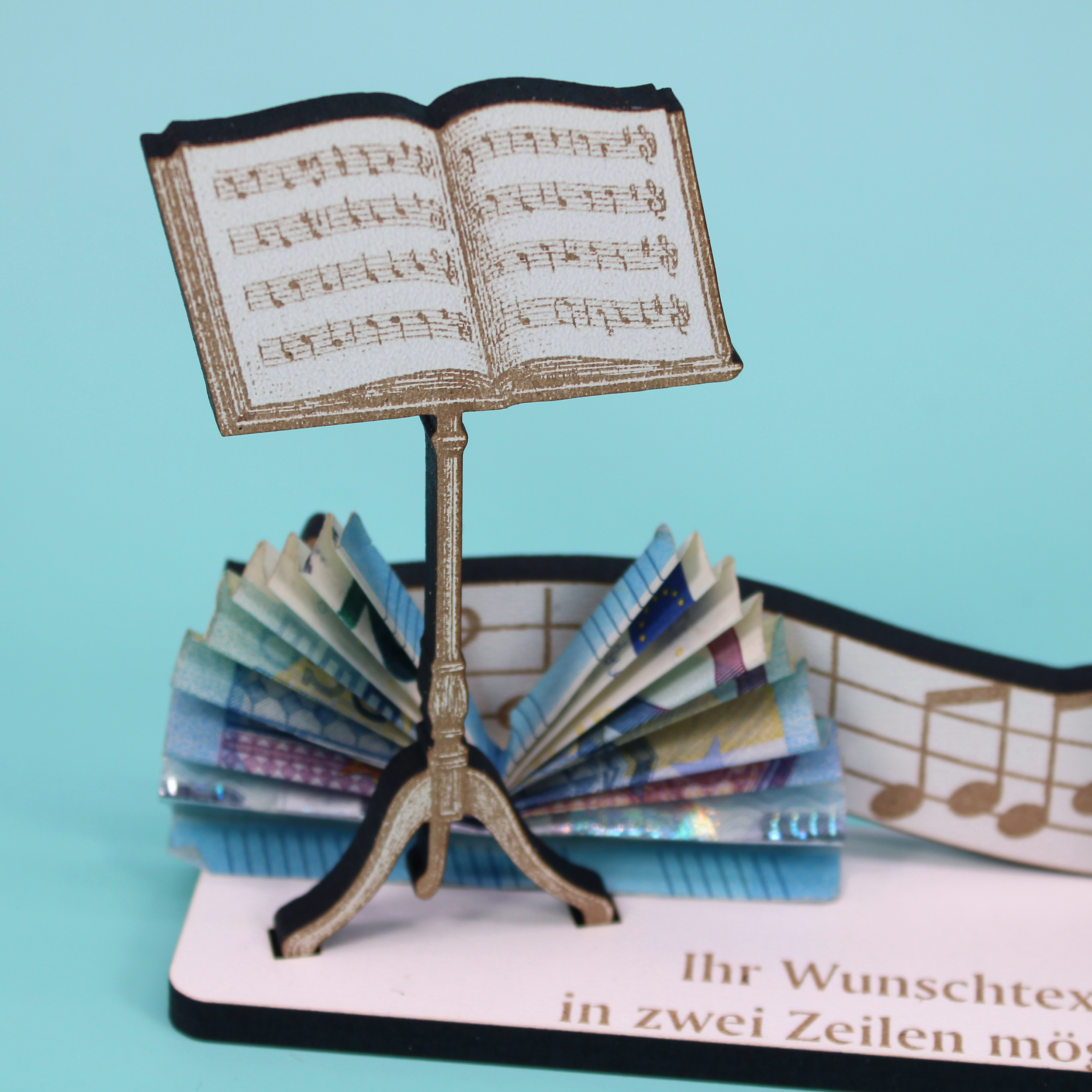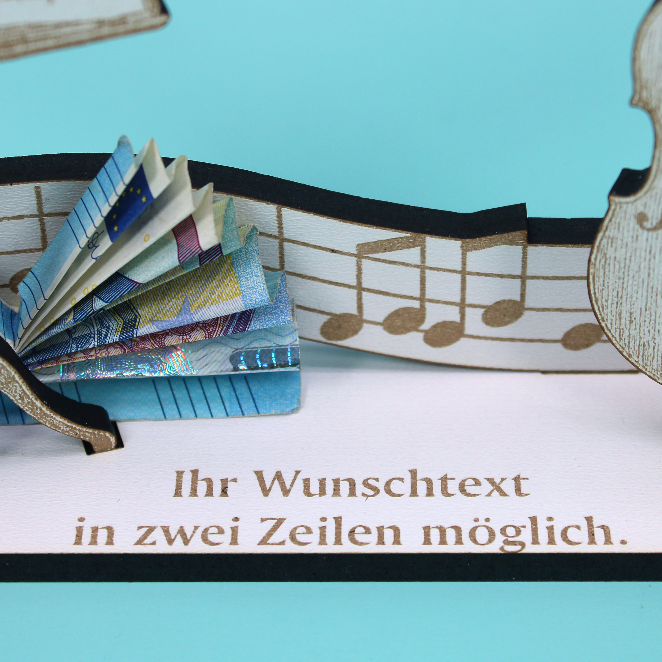Freistehend platziert auf Regal, Sideboard, Schreibtisch oder Fensterbank wird er zum Blickfang – solo oder kombiniert mit Vinyls, Noten, Plektren, Drumsticks oder Kopfhörerständer. Ideal, um Geldscheine, Gutscheine oder Karten dekorativ beizulegen und so ein wertiges Geldgeschenk mit persönlicher Note zu überreichen.