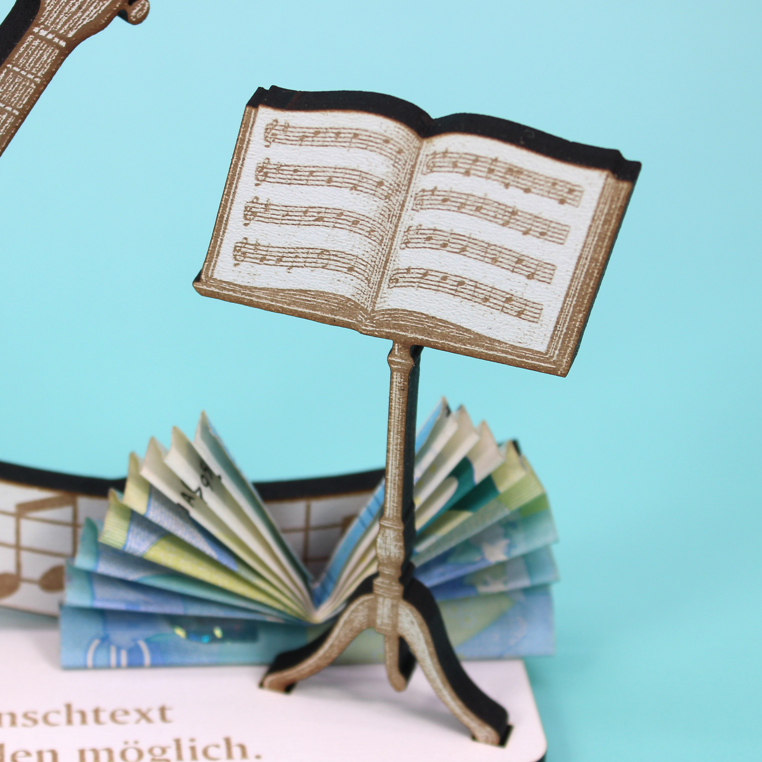 Freistehend platziert auf Regal, Sideboard, Schreibtisch oder Fensterbank wird er zum Blickfang – solo oder kombiniert mit Vinyls, Noten, Plektren, Drumsticks oder Kopfhörerständer. Ideal, um Geldscheine, Gutscheine oder Karten dekorativ beizulegen und so ein wertiges Geldgeschenk mit persönlicher Note zu überreichen.