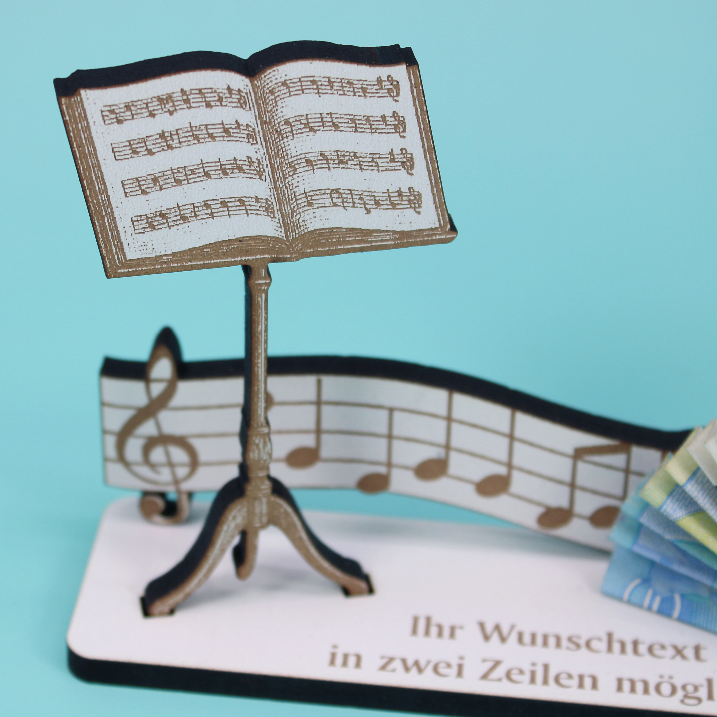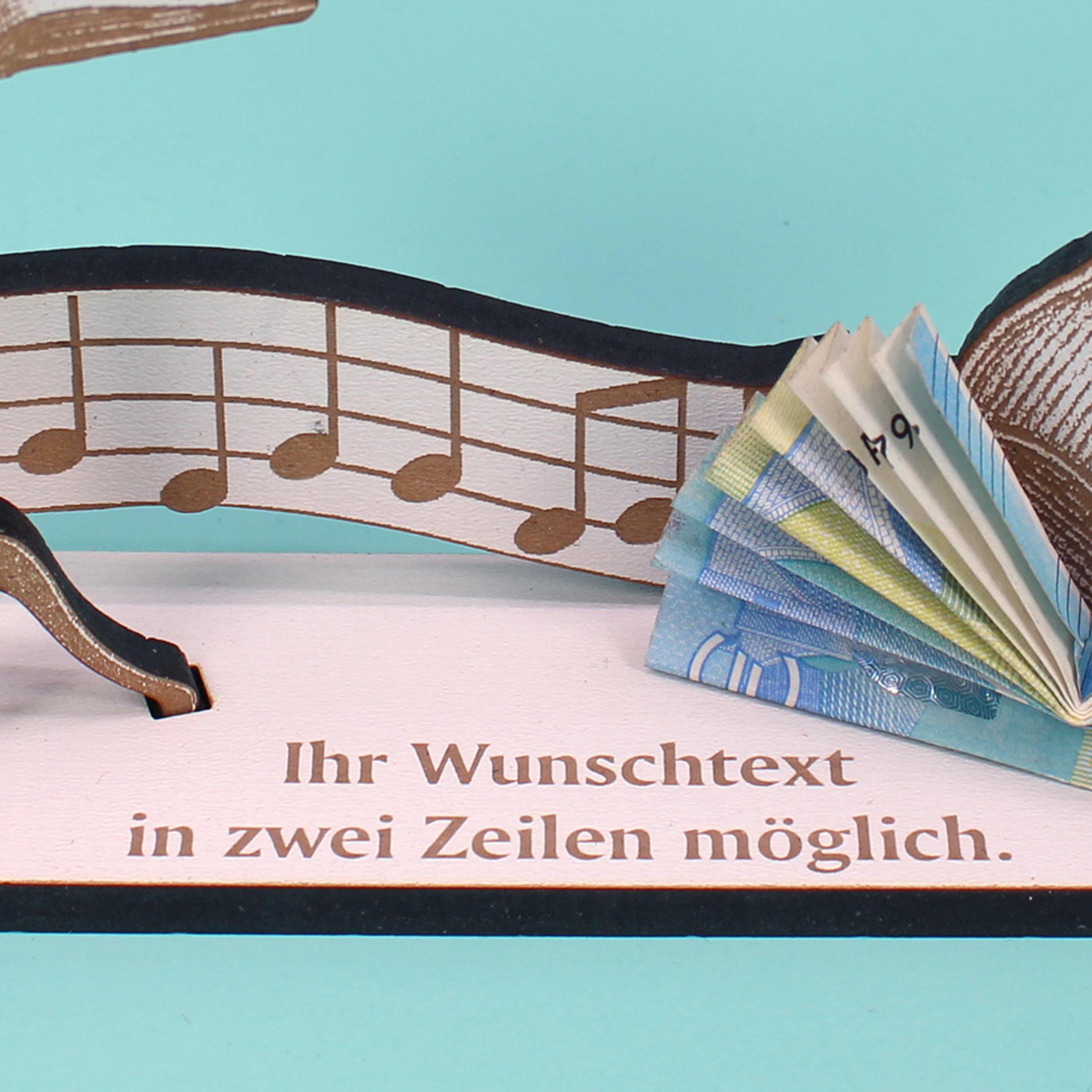 Freistehend platziert auf Regal, Sideboard, Schreibtisch oder Fensterbank wird er zum Blickfang – solo oder kombiniert mit Vinyls, Noten, Plektren, Drumsticks oder Kopfhörerständer. Ideal, um Geldscheine, Gutscheine oder Karten dekorativ beizulegen und so ein wertiges Geldgeschenk mit persönlicher Note zu überreichen.