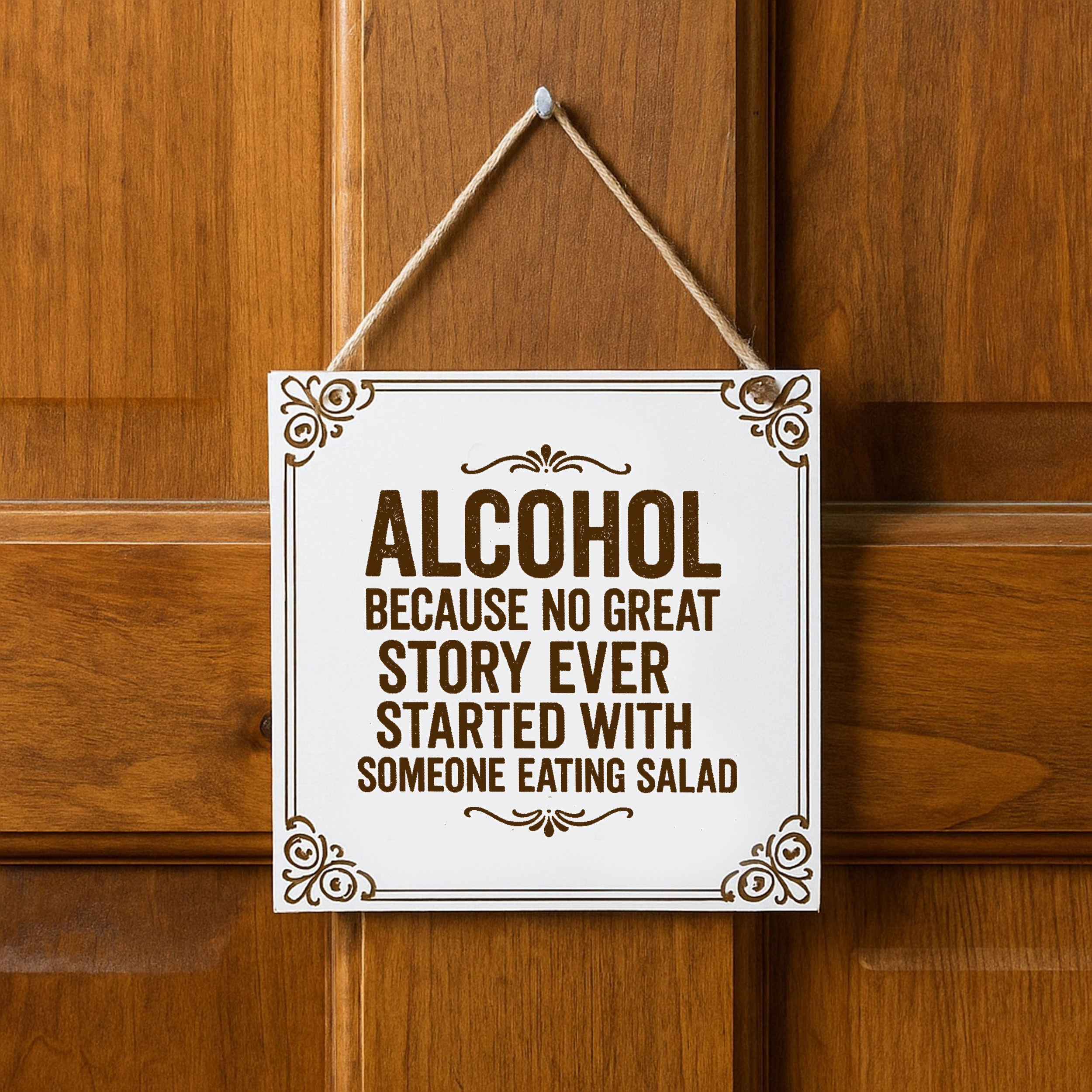 Dekoschild Alcohol because no great Story 15×15 cm aus weißem HDF – Graviertes Spruchschild