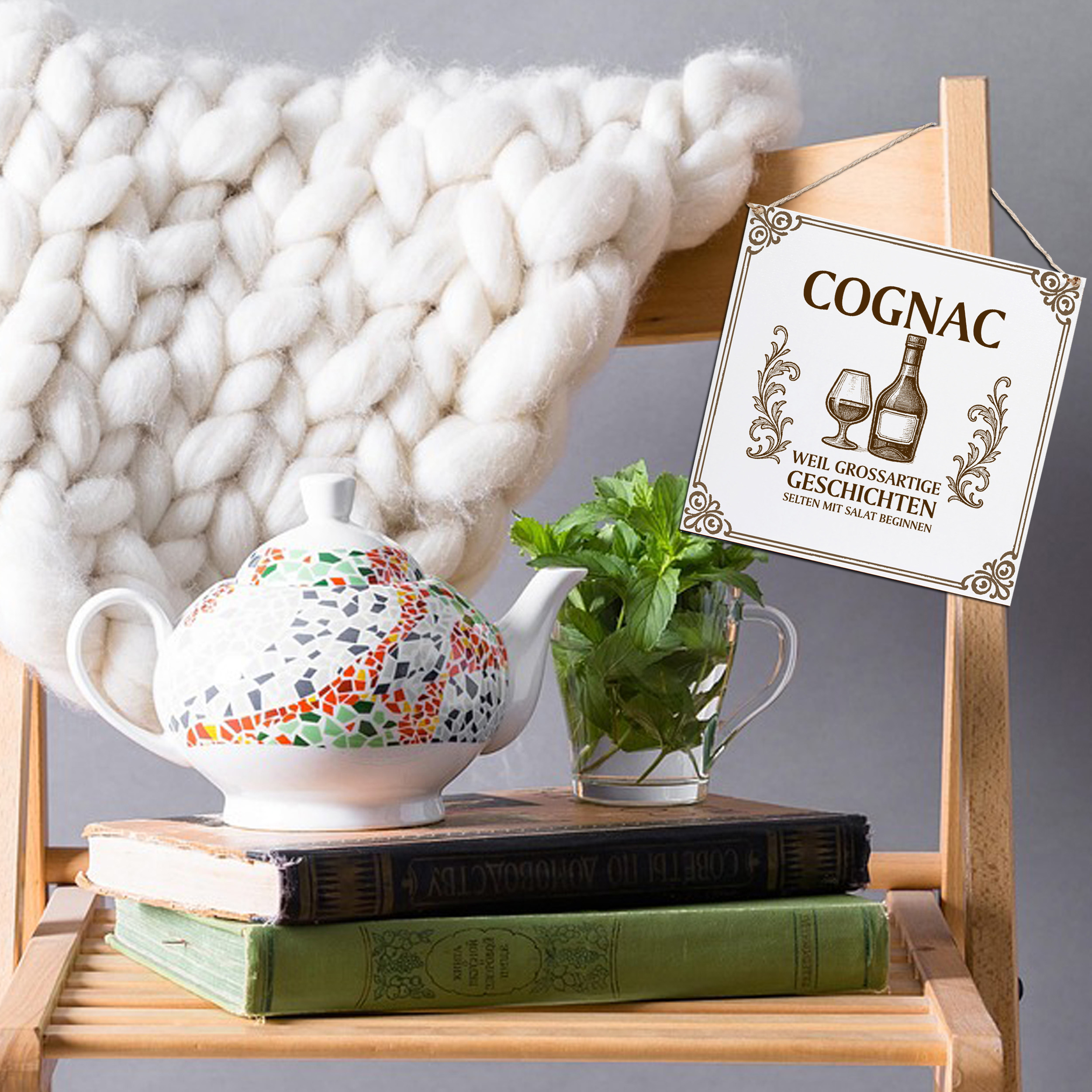Dekoschild Cognac grossartige Geschichten 15×15 cm aus weißem HDF – Graviertes Spruchschild