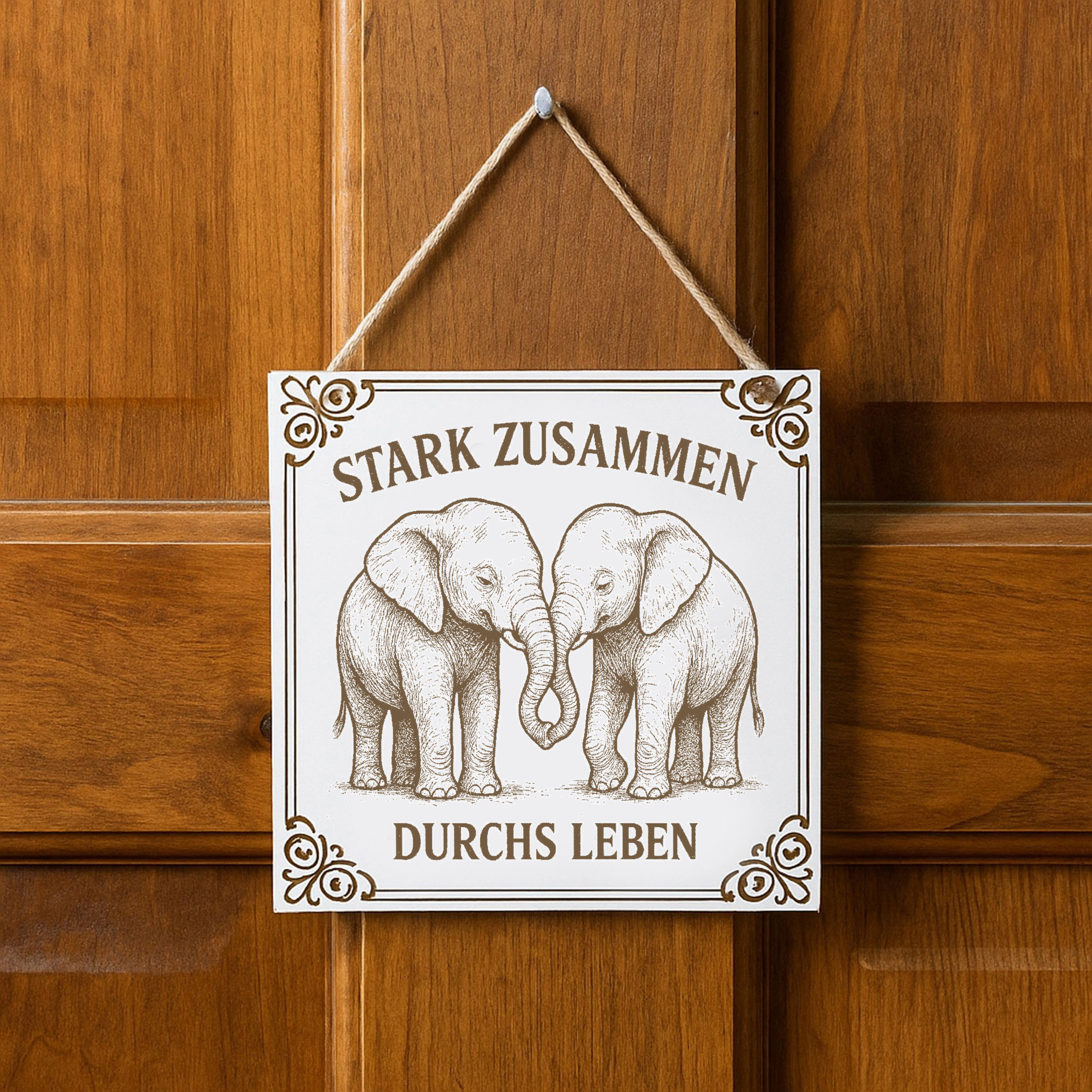 Dekoschild Elefanten Stark zusammen durchs Leben 15×15 cm aus weißem HDF – Graviertes Spruchschild