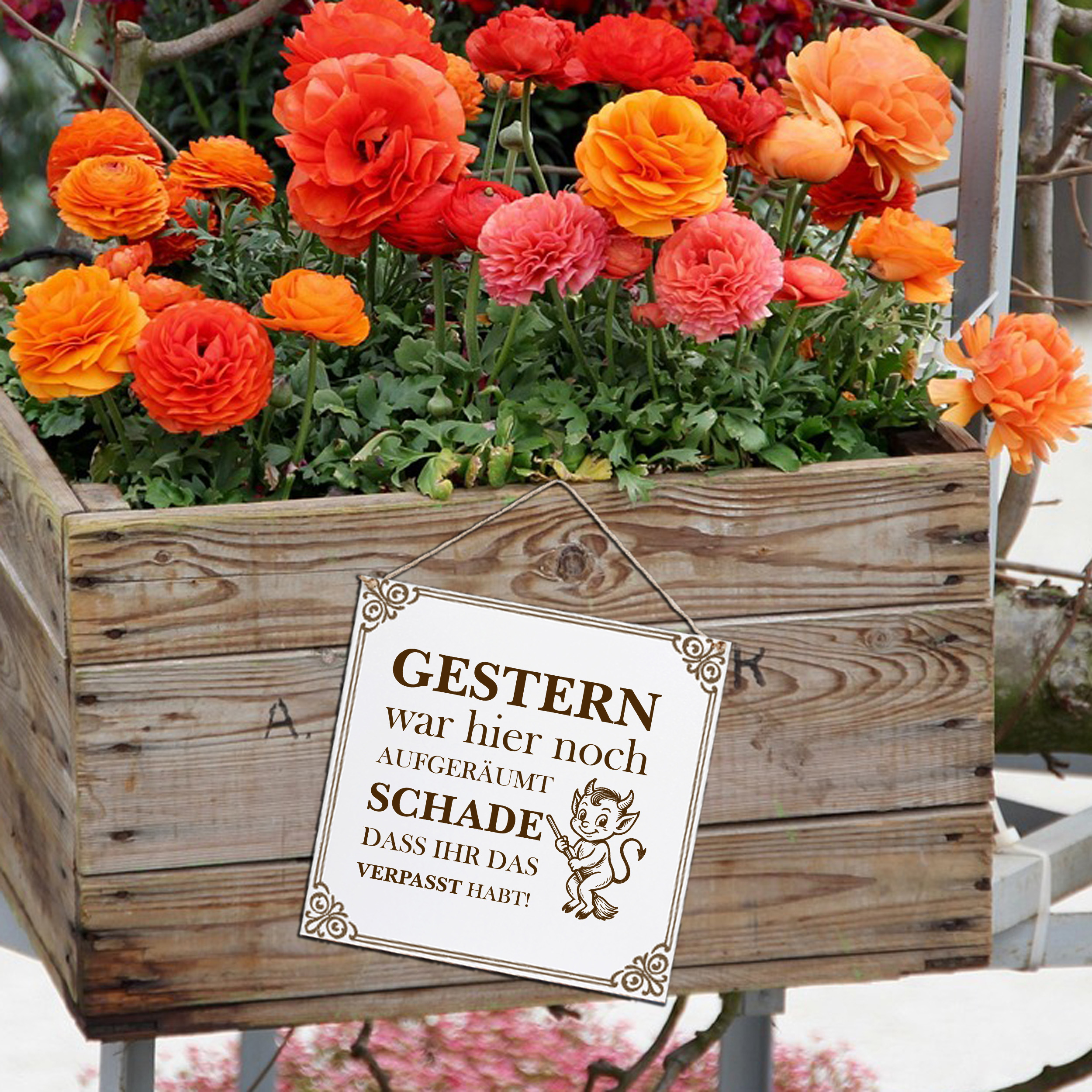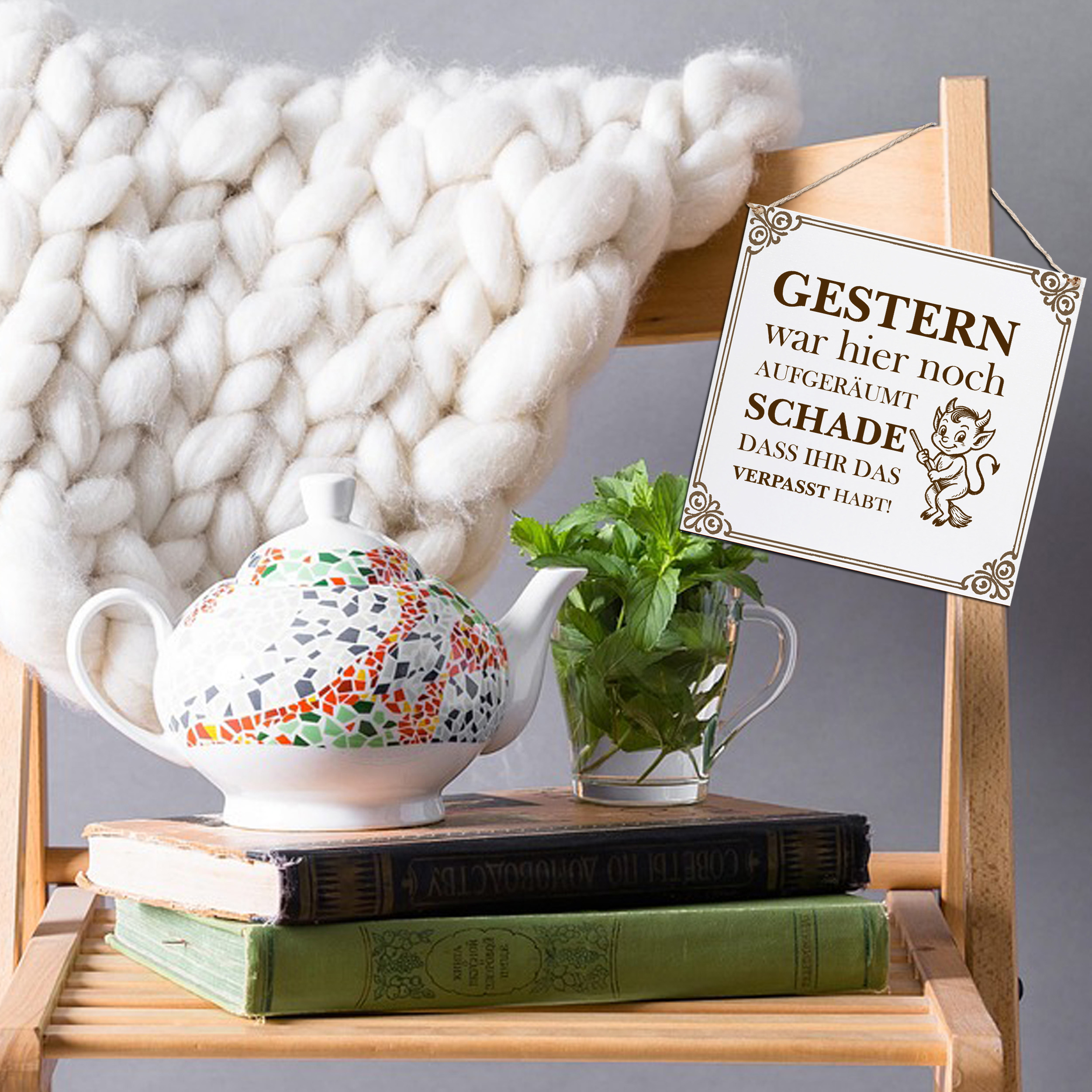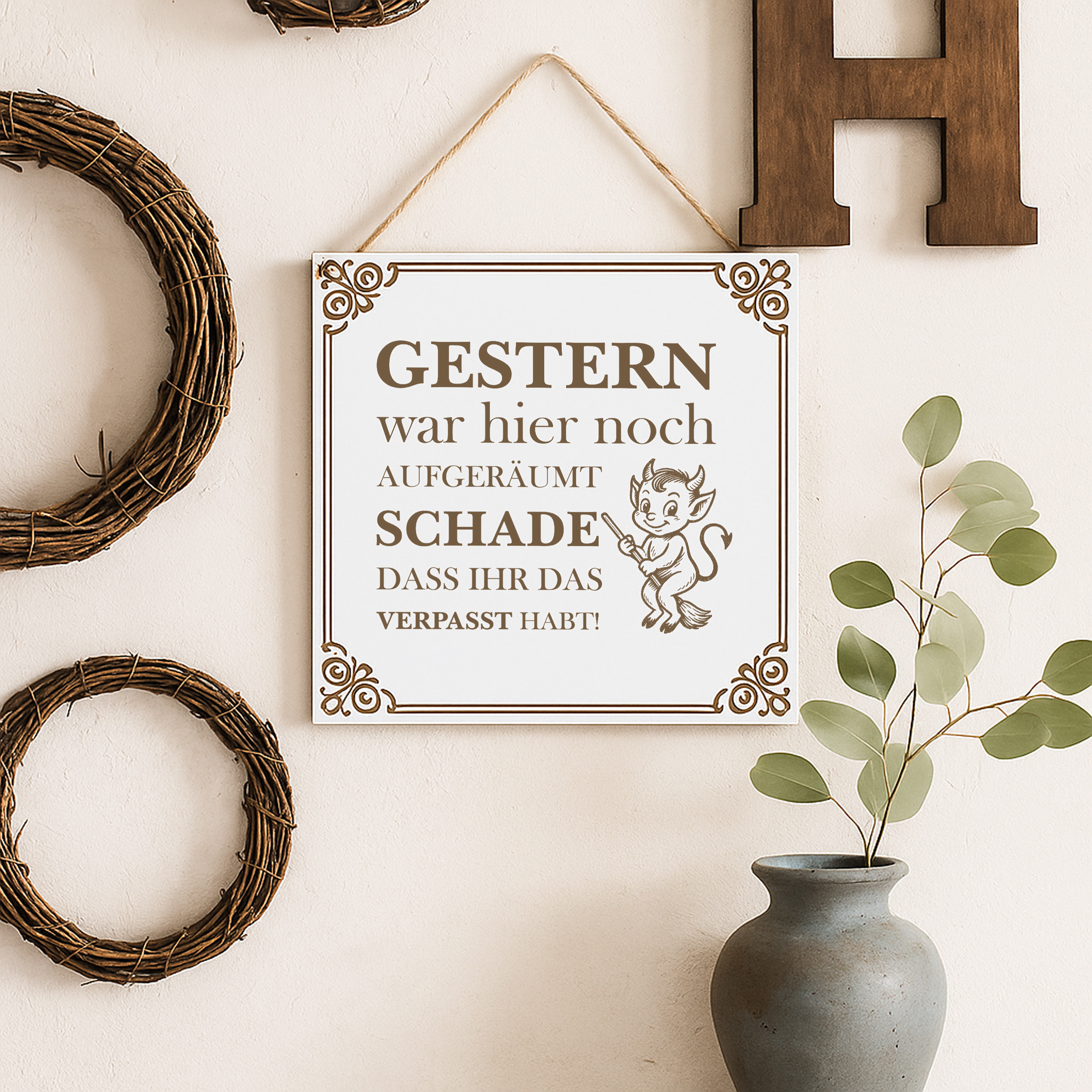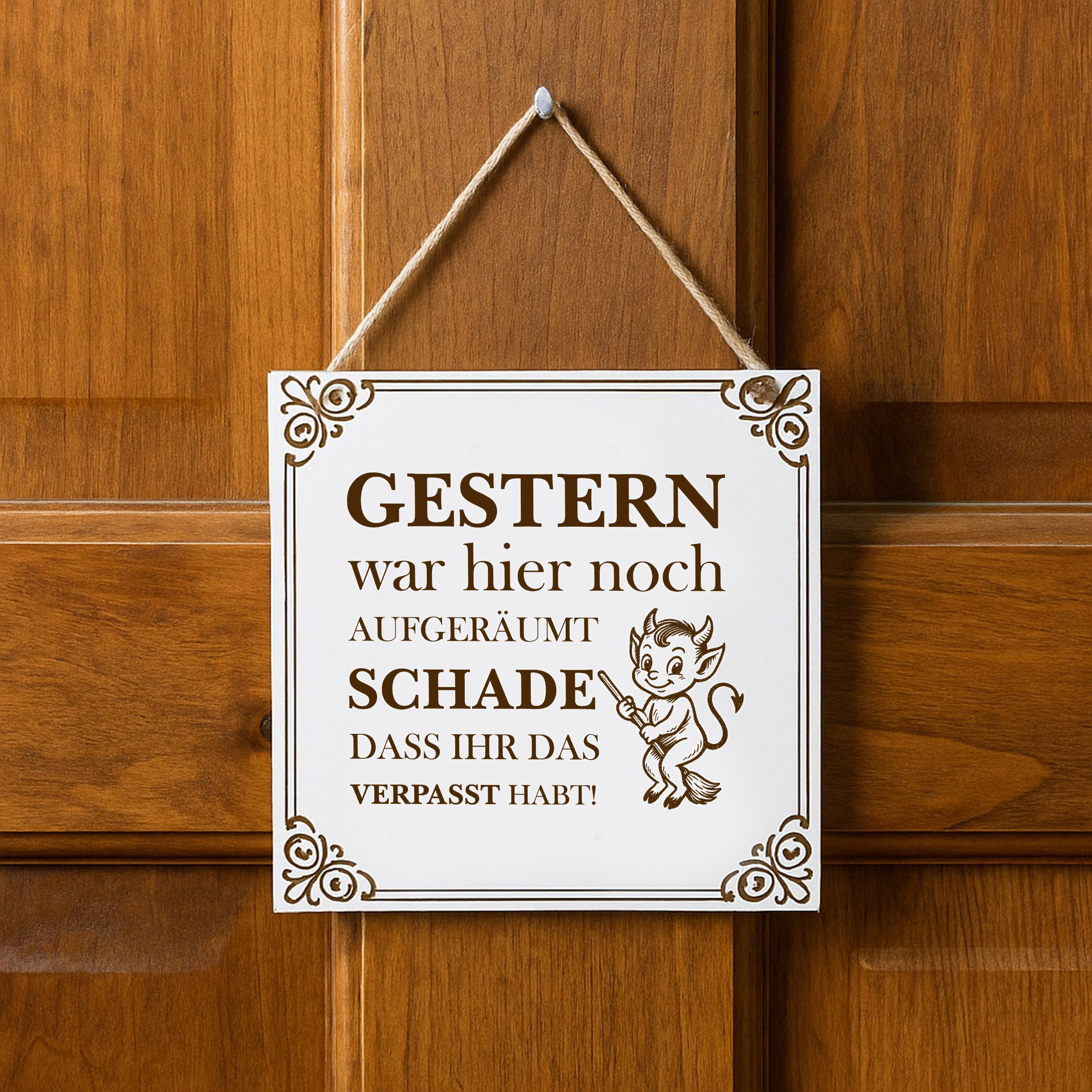 Dekoschild Gestern war hier noch aufgeräumt 15×15 cm aus weißem HDF – Graviertes Spruchschild