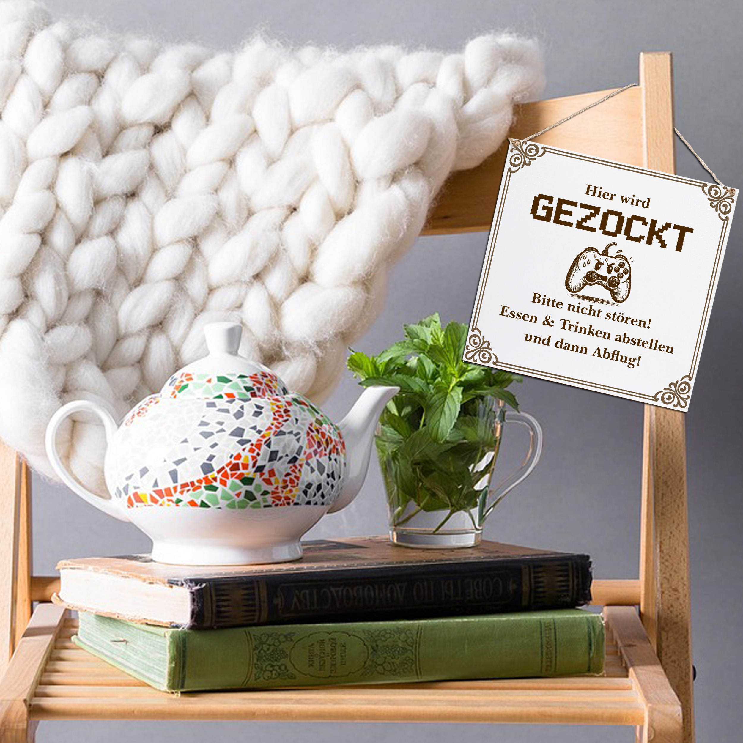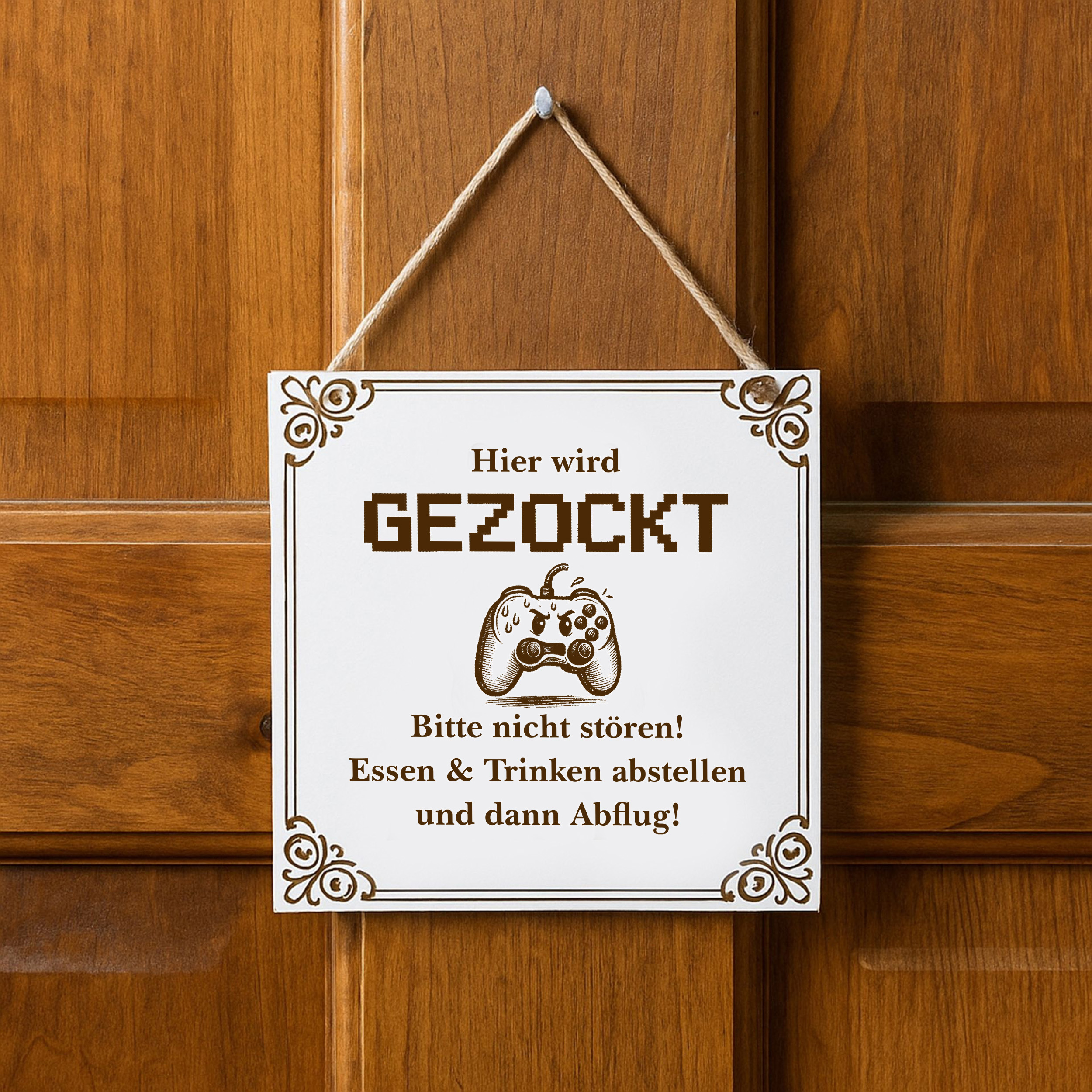 Dekoschild Hier wird gezockt 15×15 cm aus weißem HDF – Graviertes Spruchschild