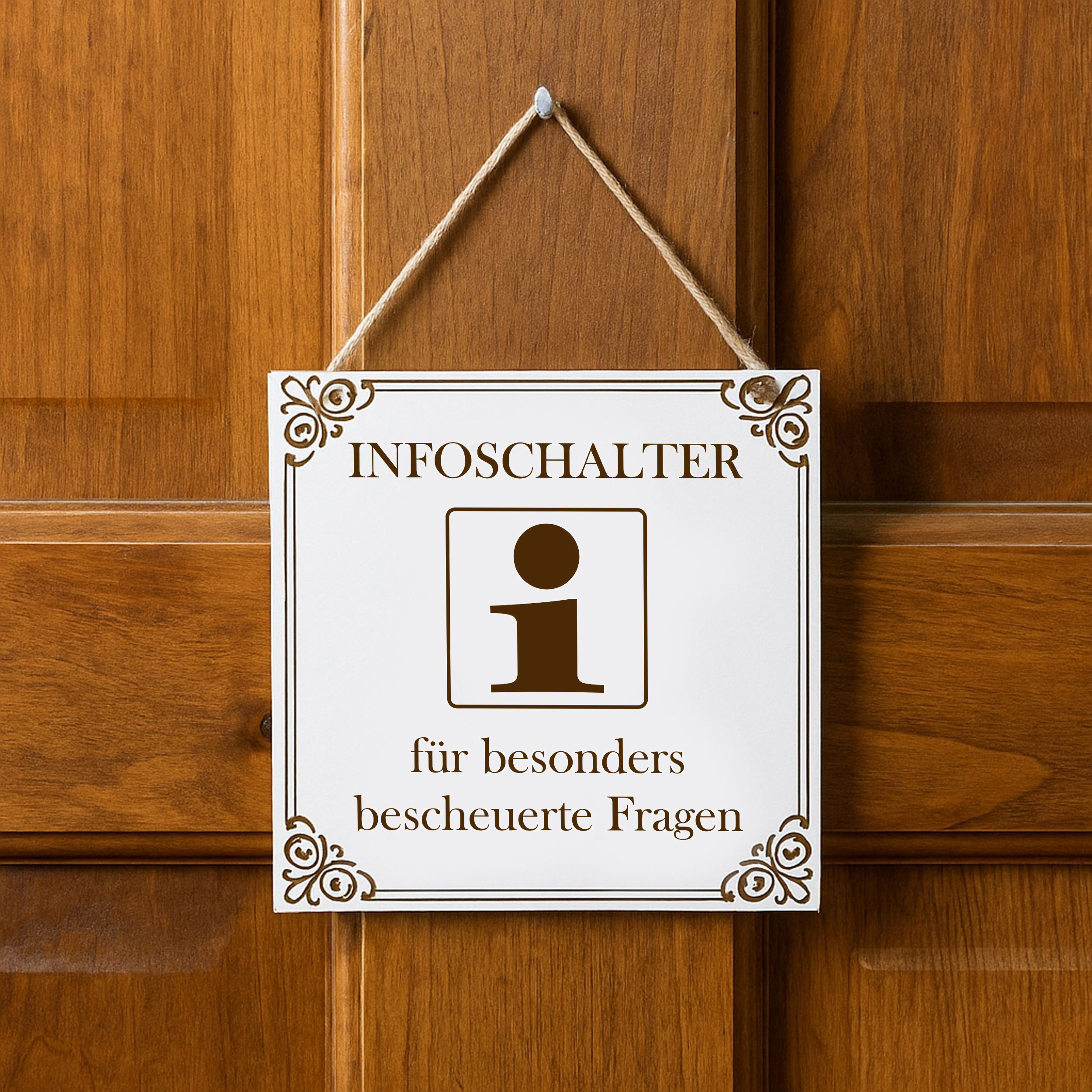 Dekoschild Infoschalter besonders bescheuerte Fragen 15×15 cm aus weißem HDF – Graviertes Spruchschild