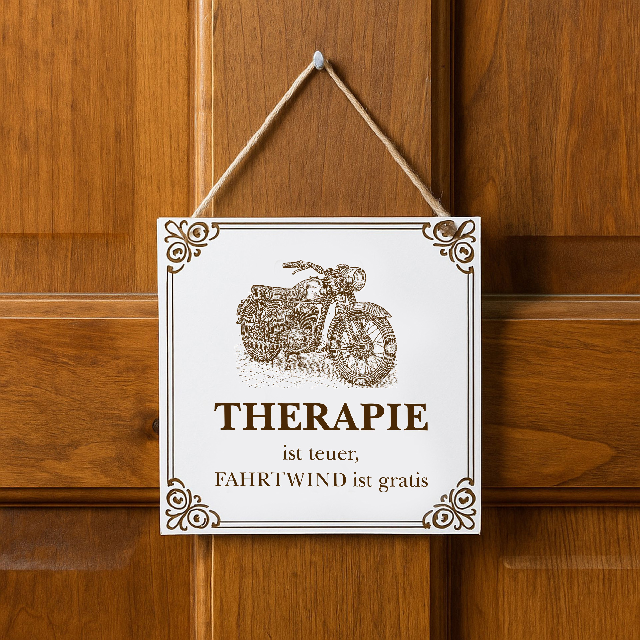Dekoschild Motorrad Therapie Fahrtwind 15×15 cm aus weißem HDF – Graviertes Spruchschild