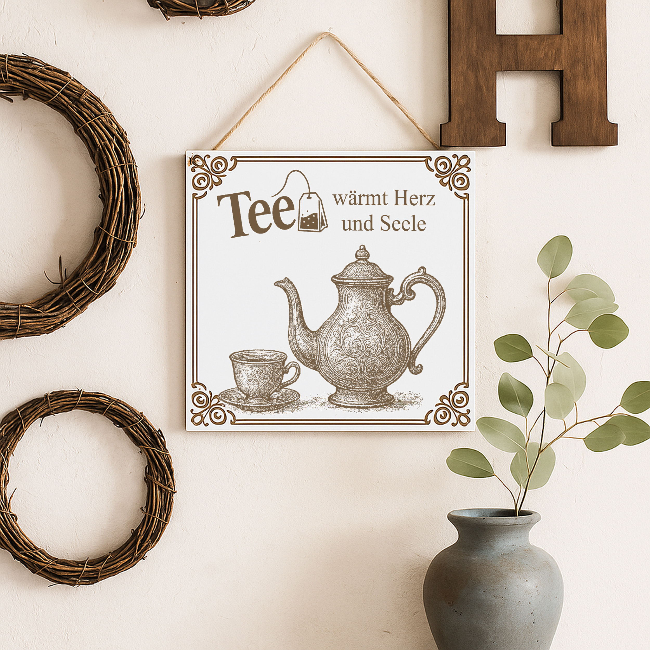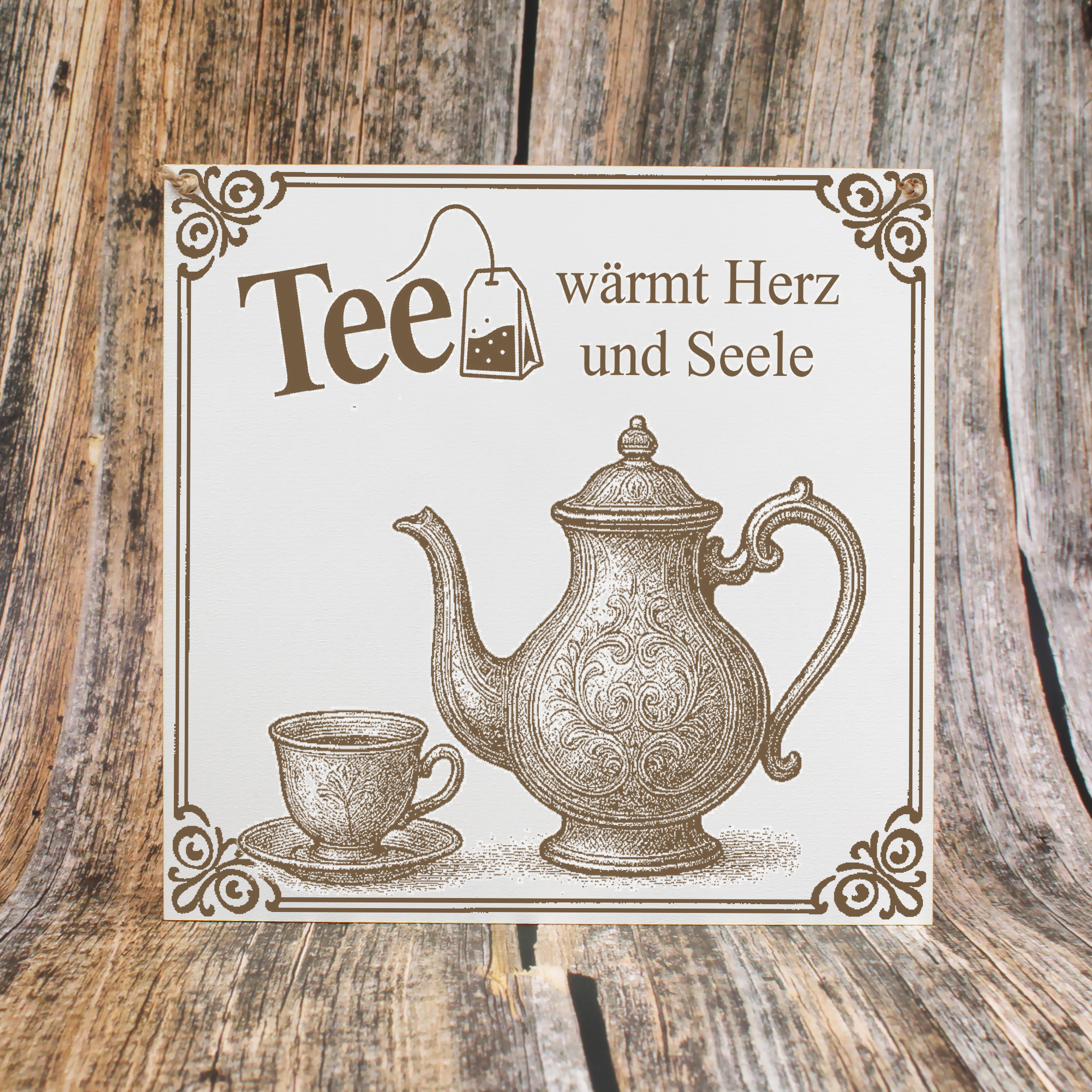 Dekoschild Tee wärmt Herz und Seele 15×15 cm aus weißem HDF – Graviertes Spruchschild