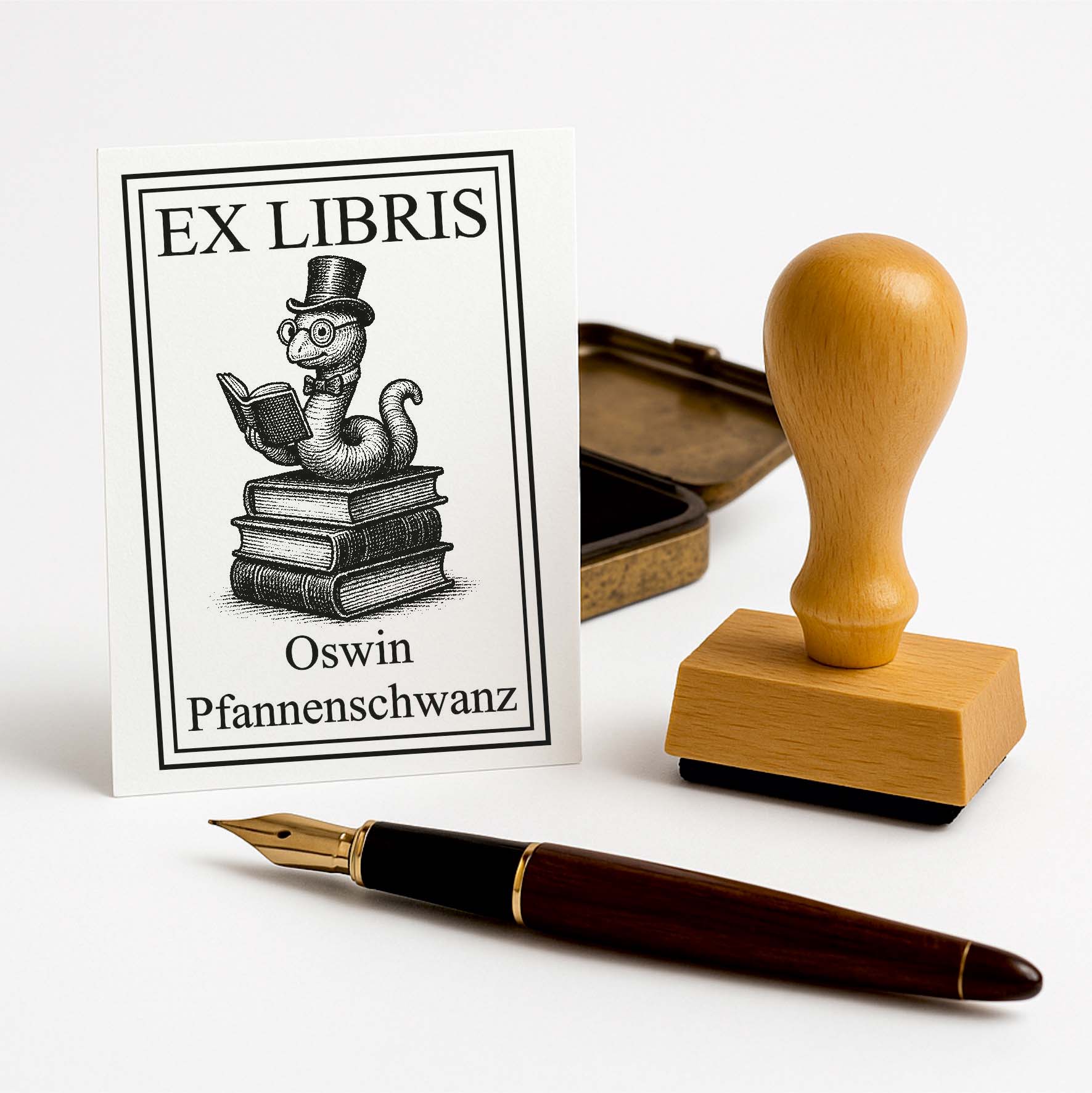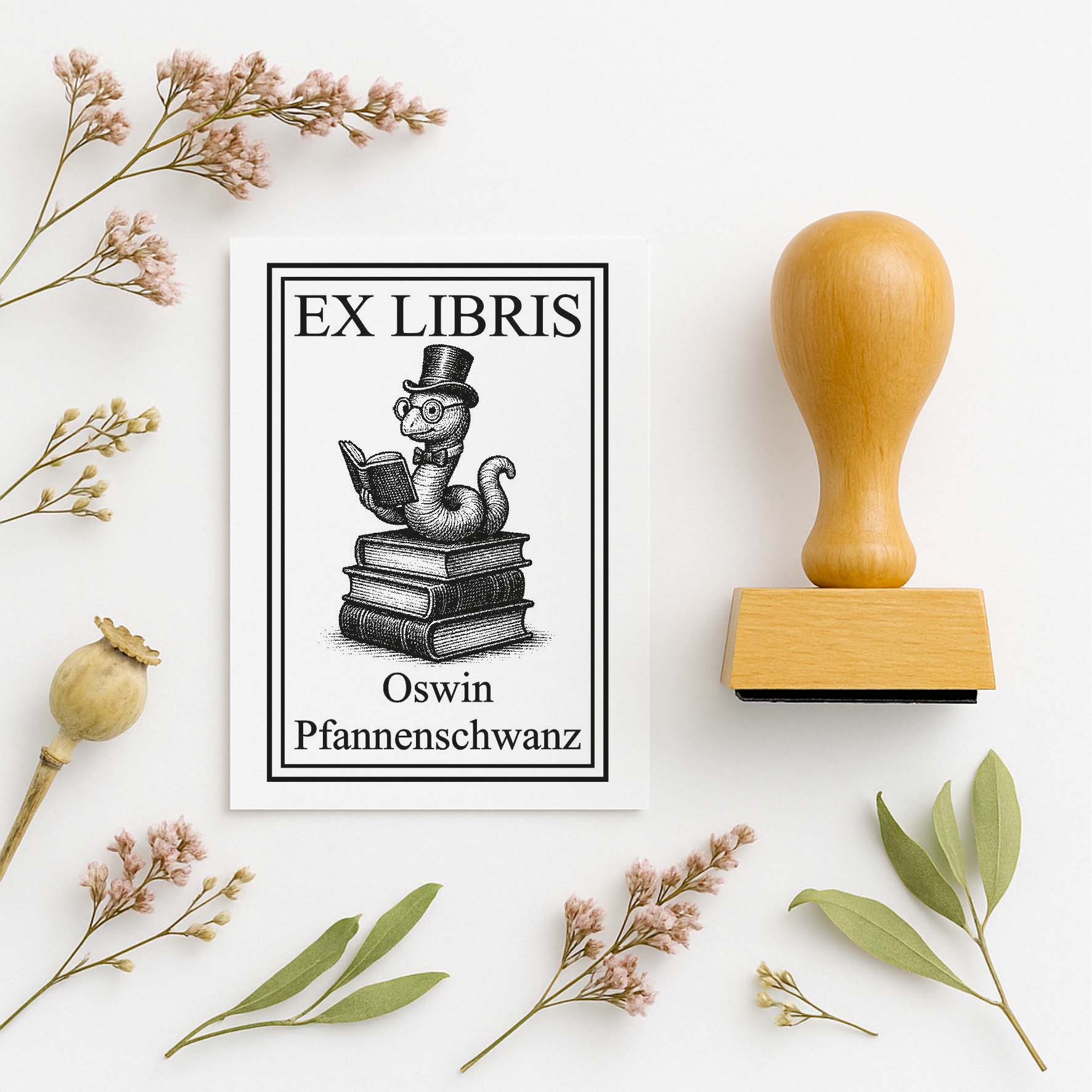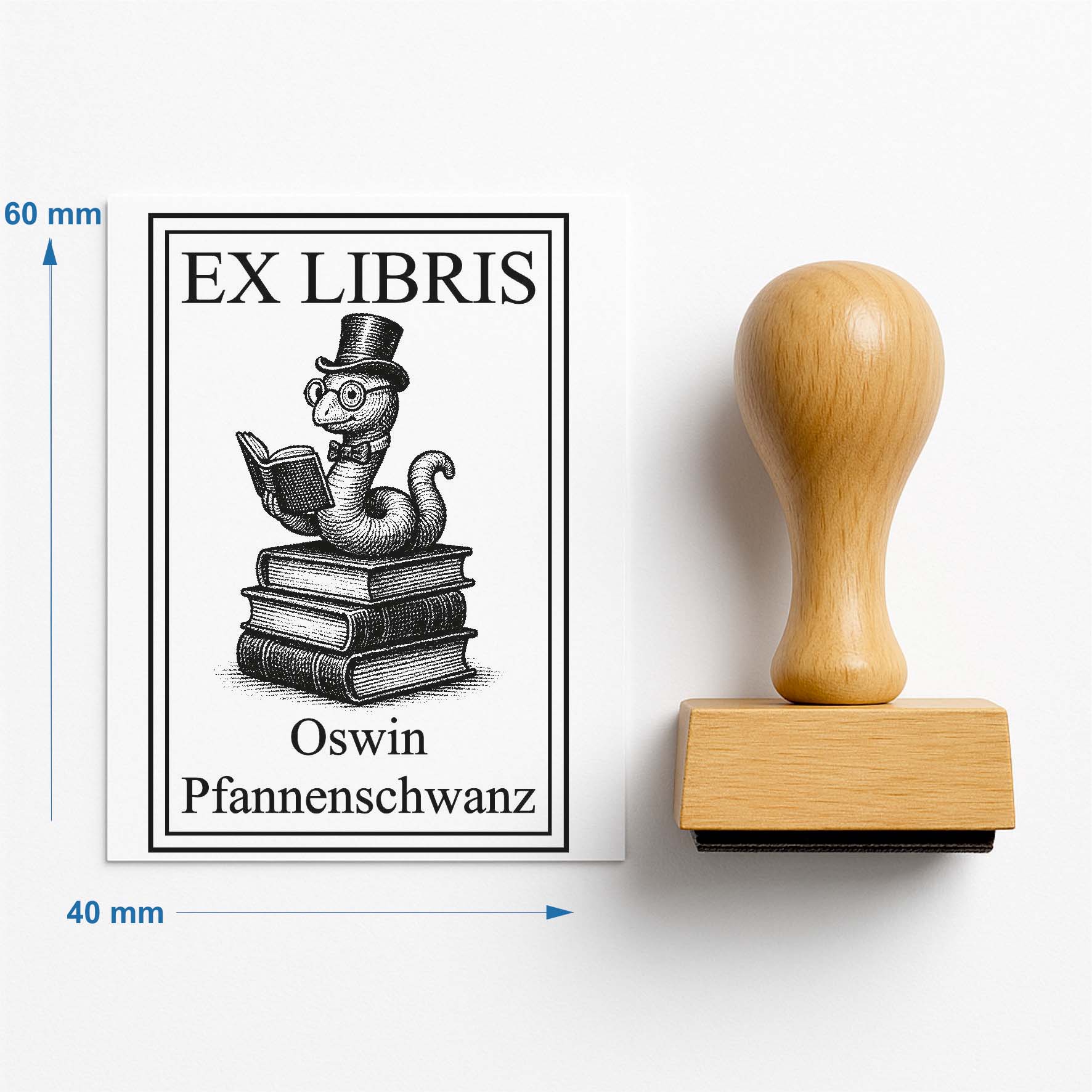 Ex Libris Stempel personalisiert mit Namen Motiv Bücherwurm - Bücherstempel individuell - 40 x 60 mm