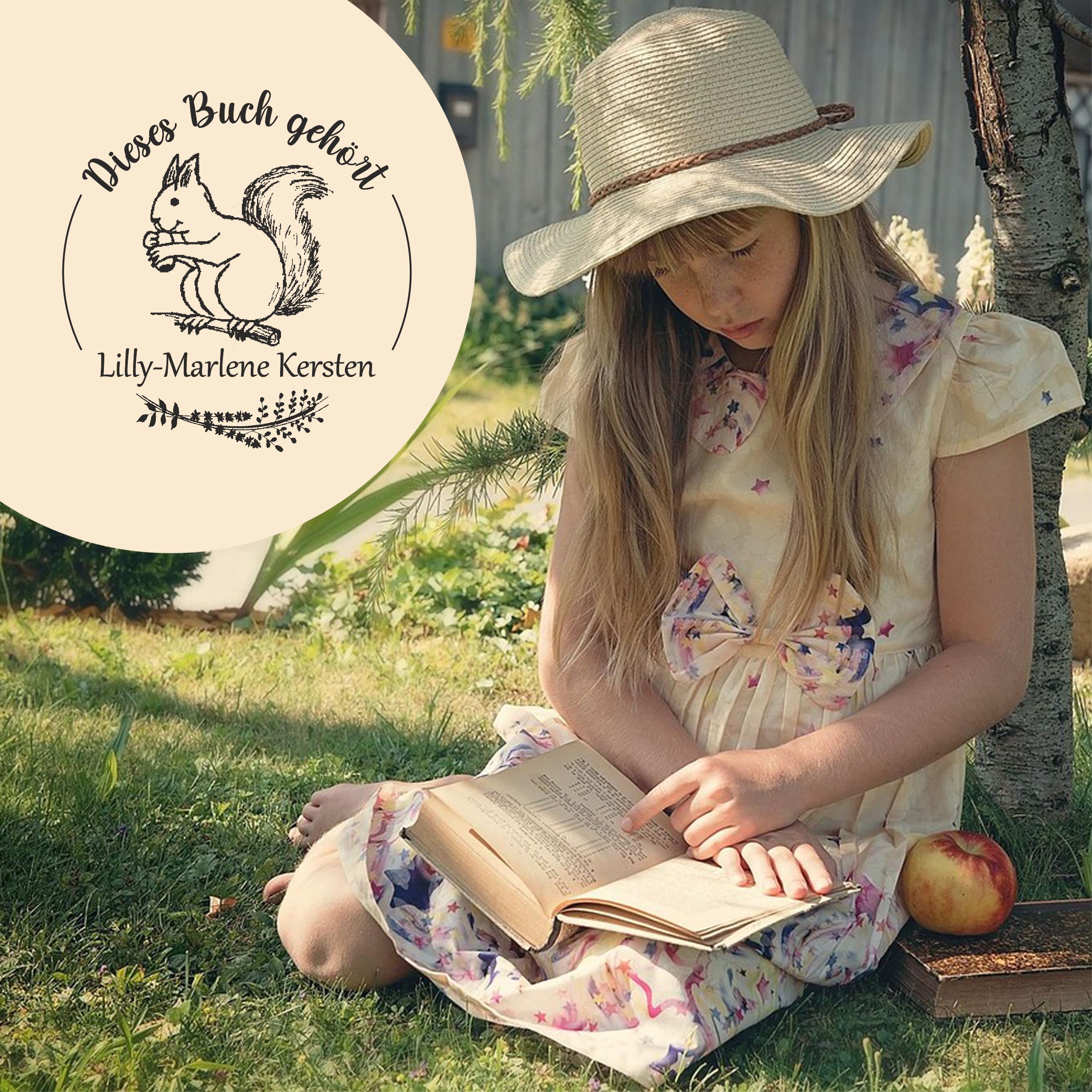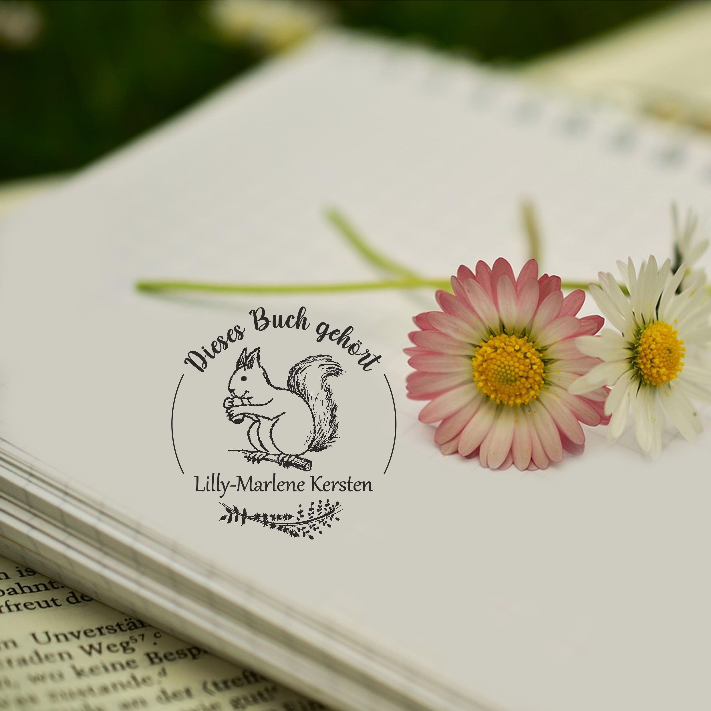 Ex Libris Stempel personalisiert mit Namen Motiv Eichhörnchen - Bücherstempel individuell - für Kinder, Schule & Lehrer - Ø 38 mm
