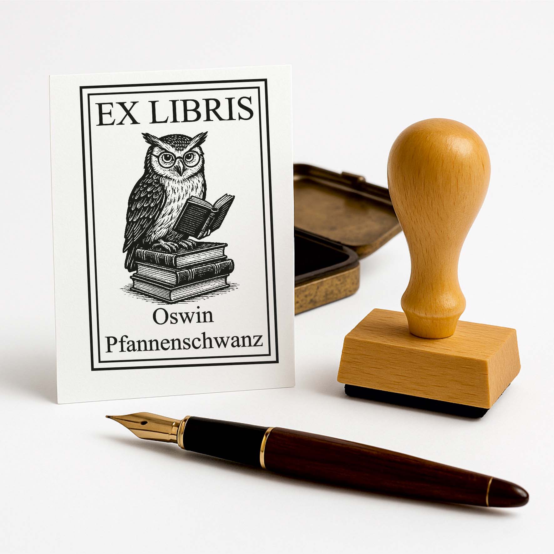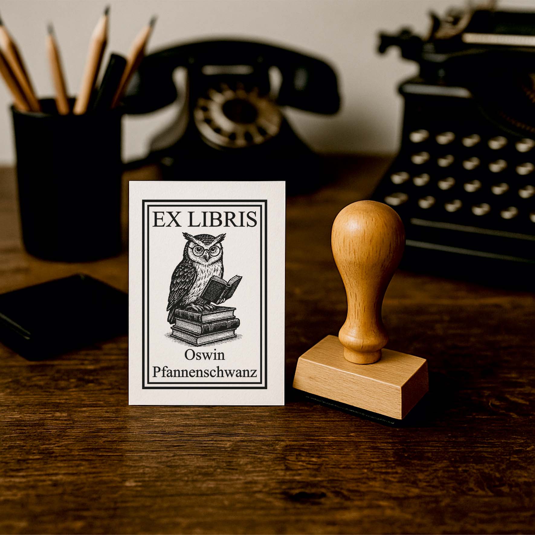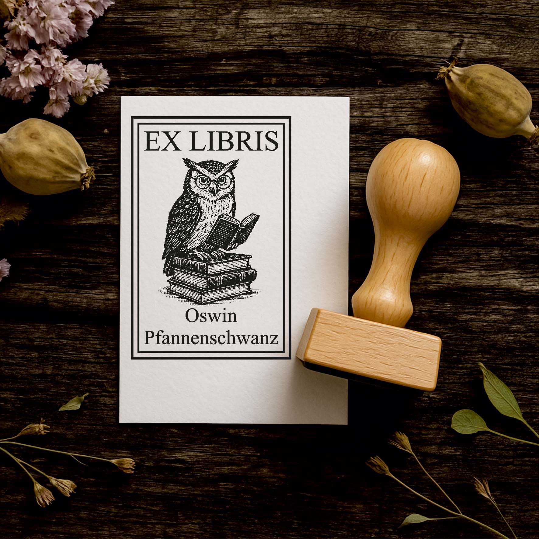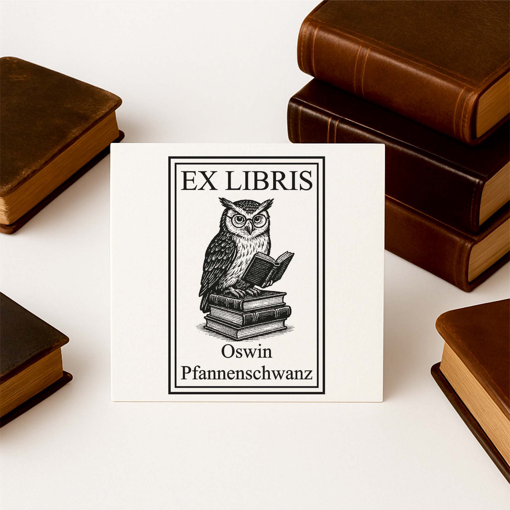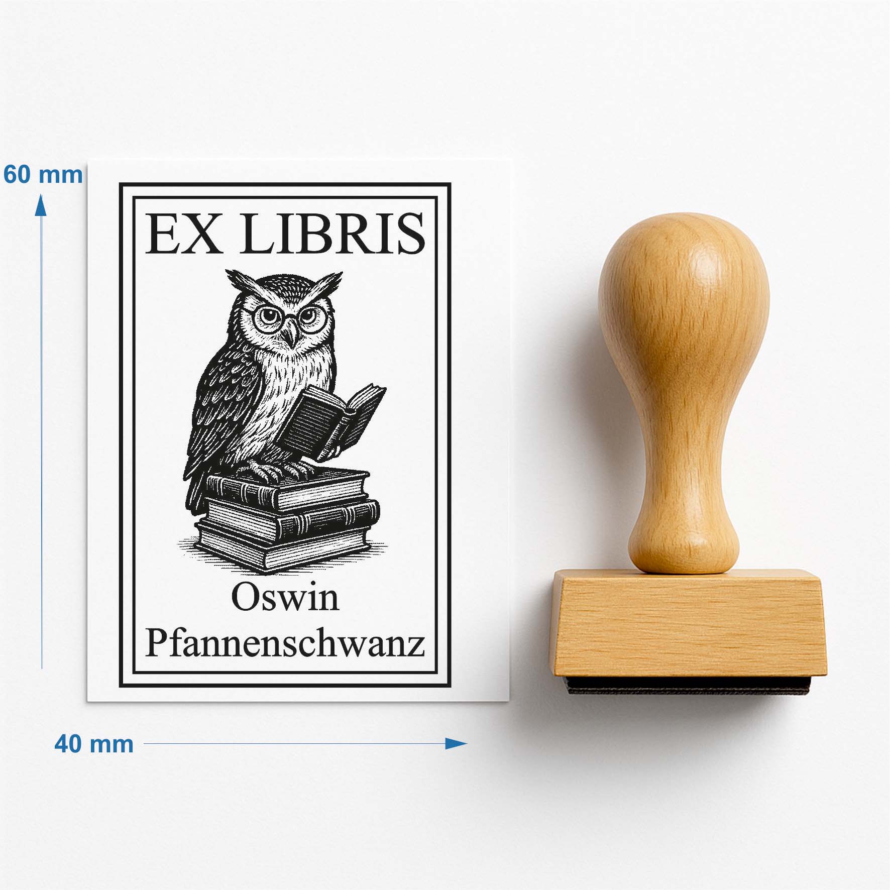 Ex Libris Stempel personalisiert mit Namen Motiv Eule mit Brille auf Bücherstapel - Bücherstempel individuell - 40 x 60 mm