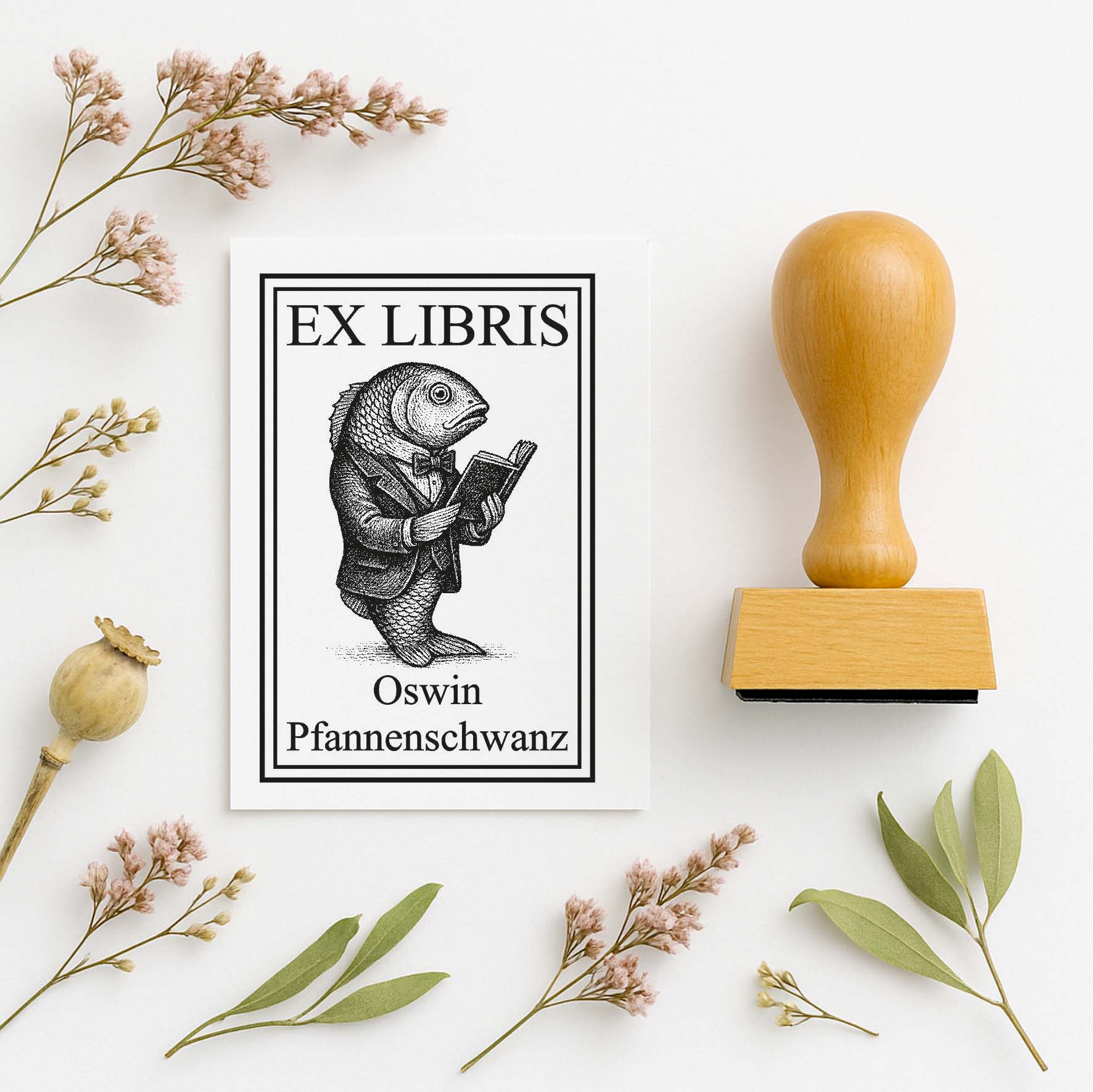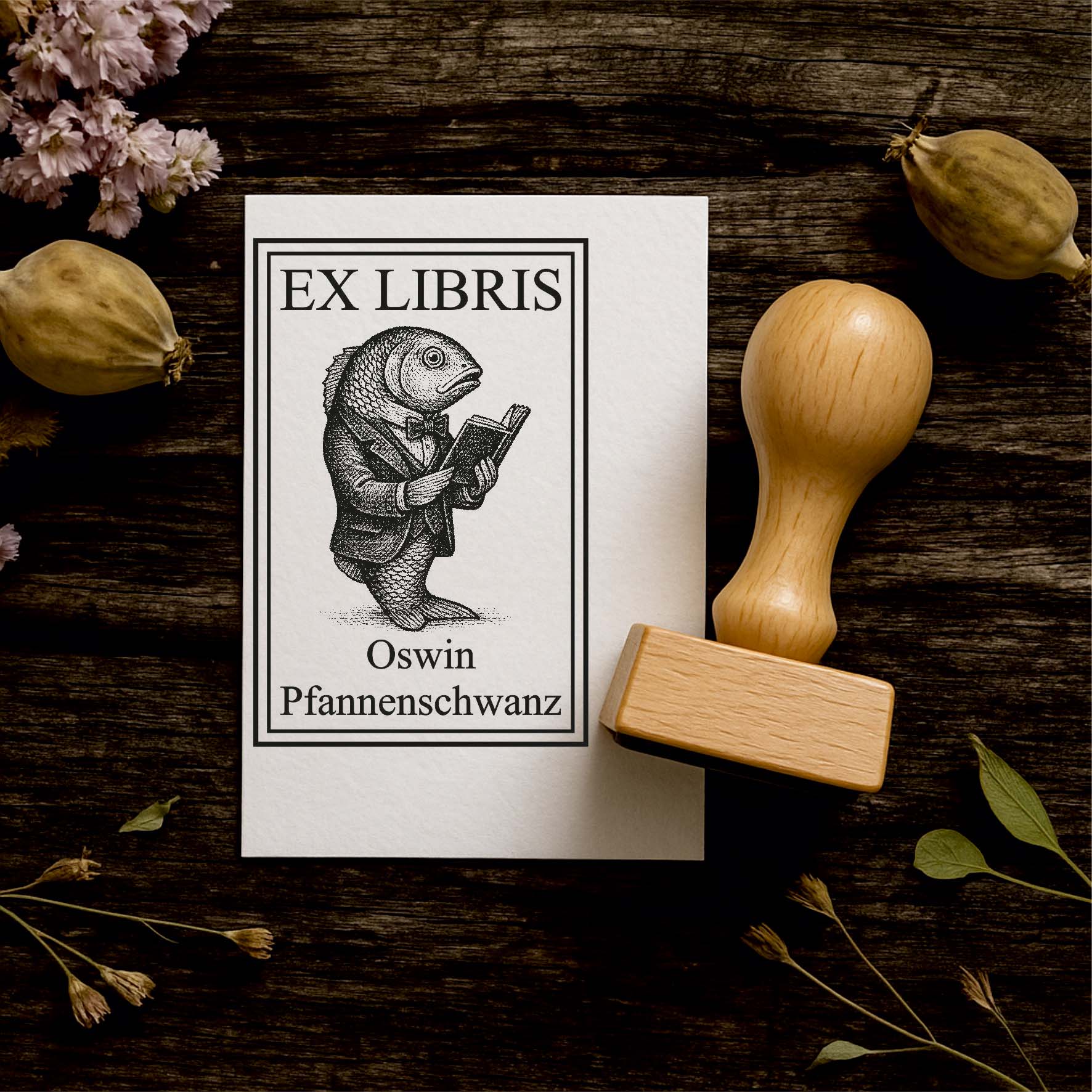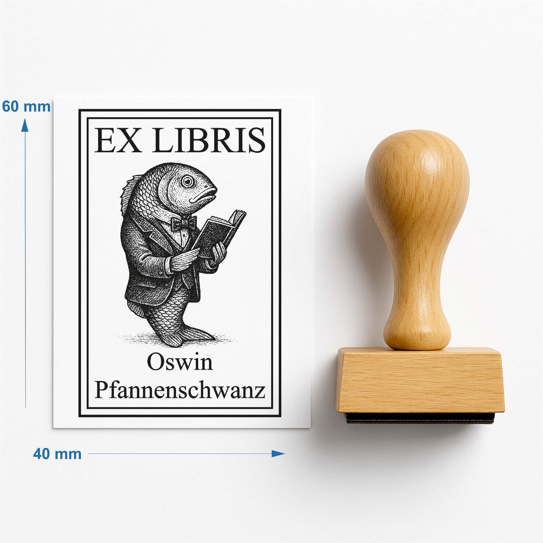 Ex Libris Stempel personalisiert mit Namen Motiv Fisch mit Buch - Bücherstempel individuell - 40 x 60 mm