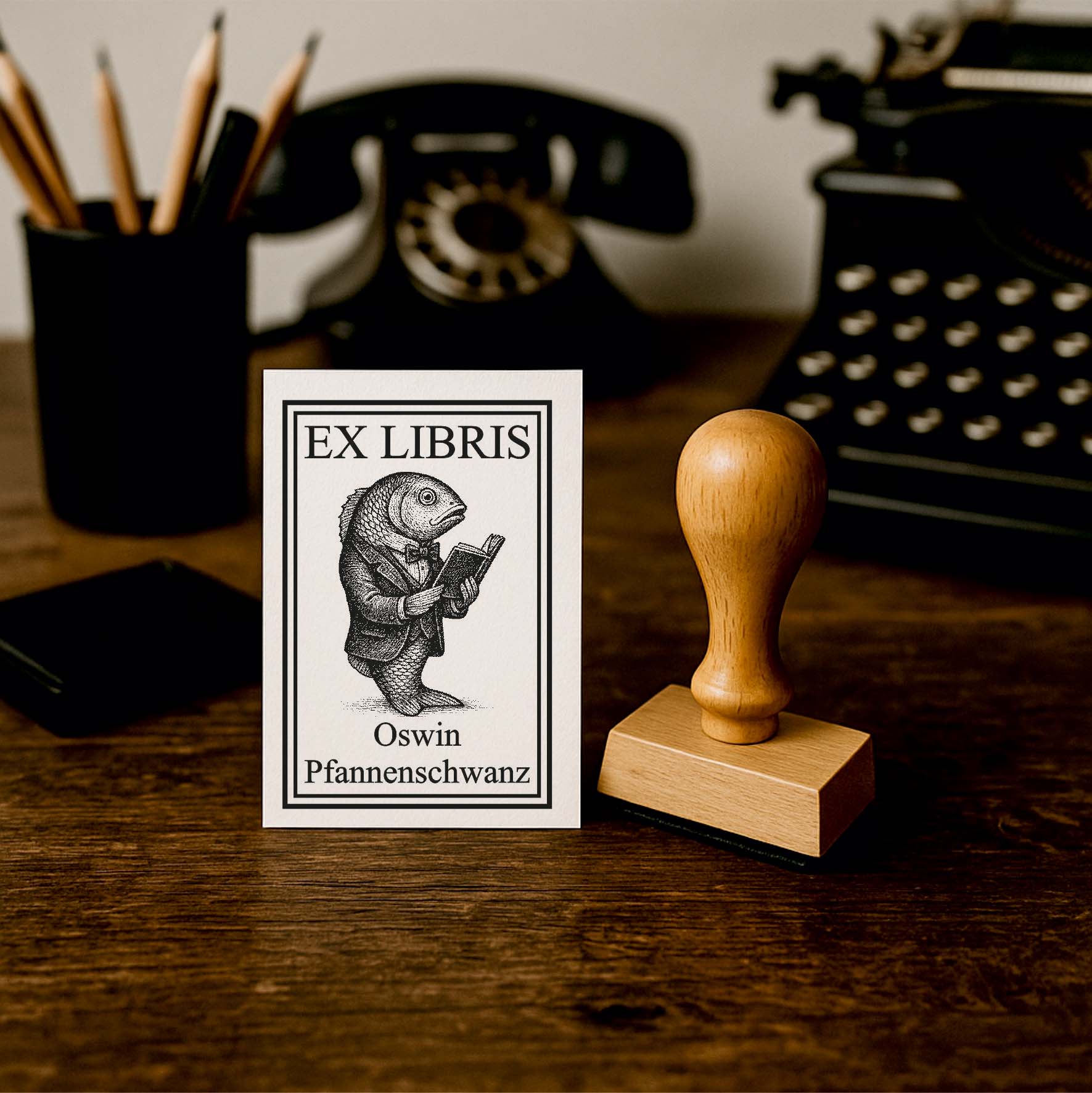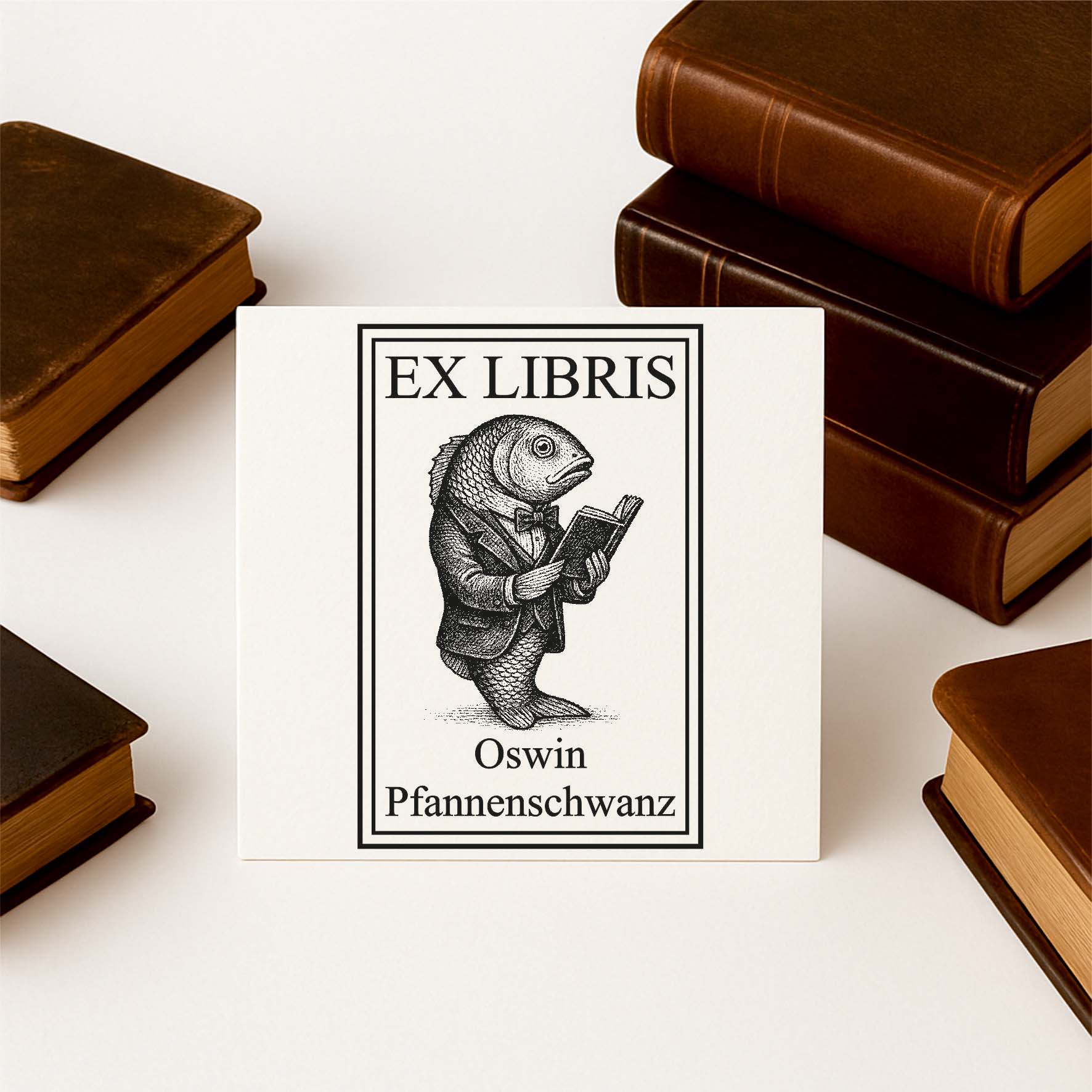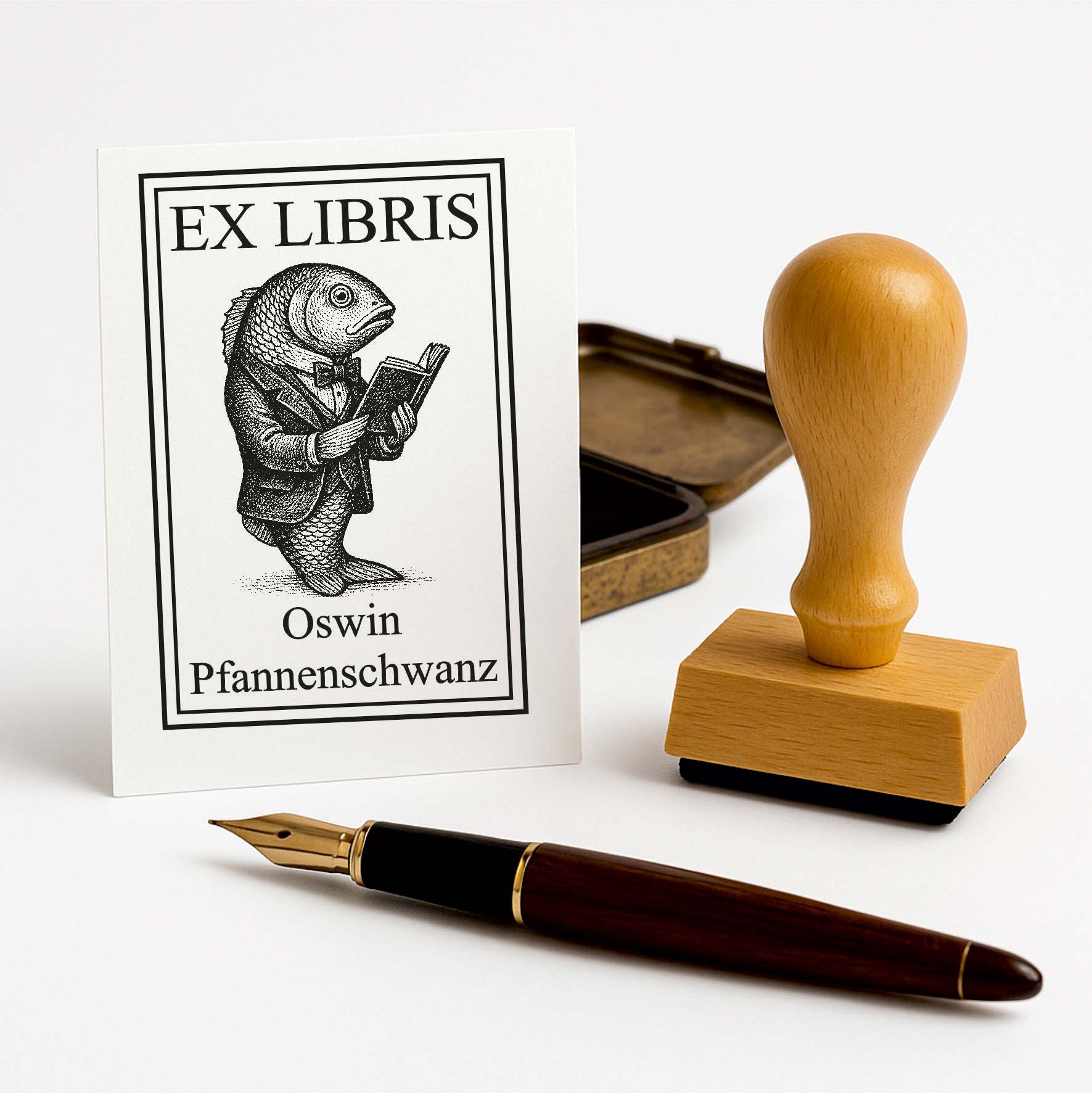 Ex Libris Stempel personalisiert mit Namen Motiv Fisch mit Buch - Bücherstempel individuell - 40 x 60 mm