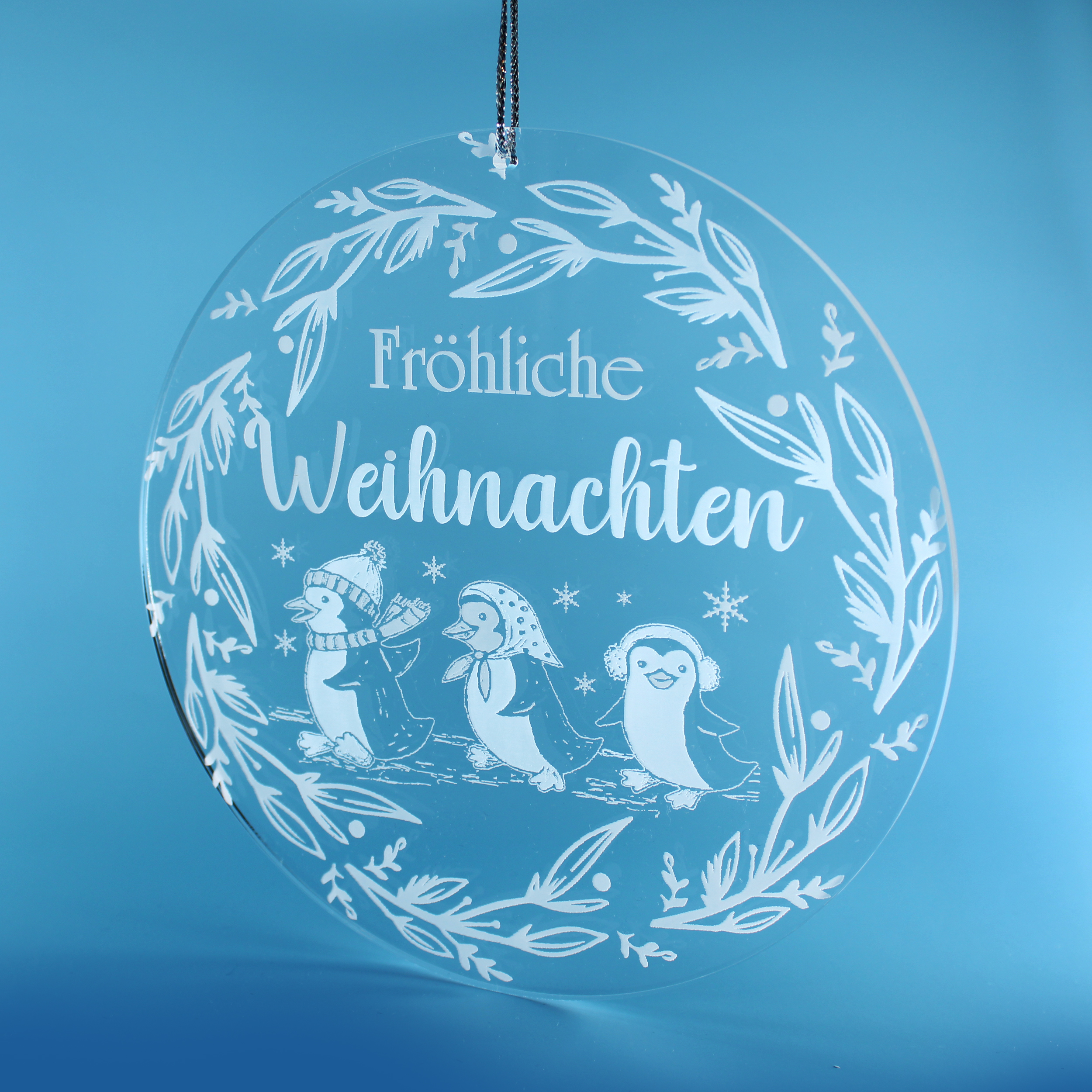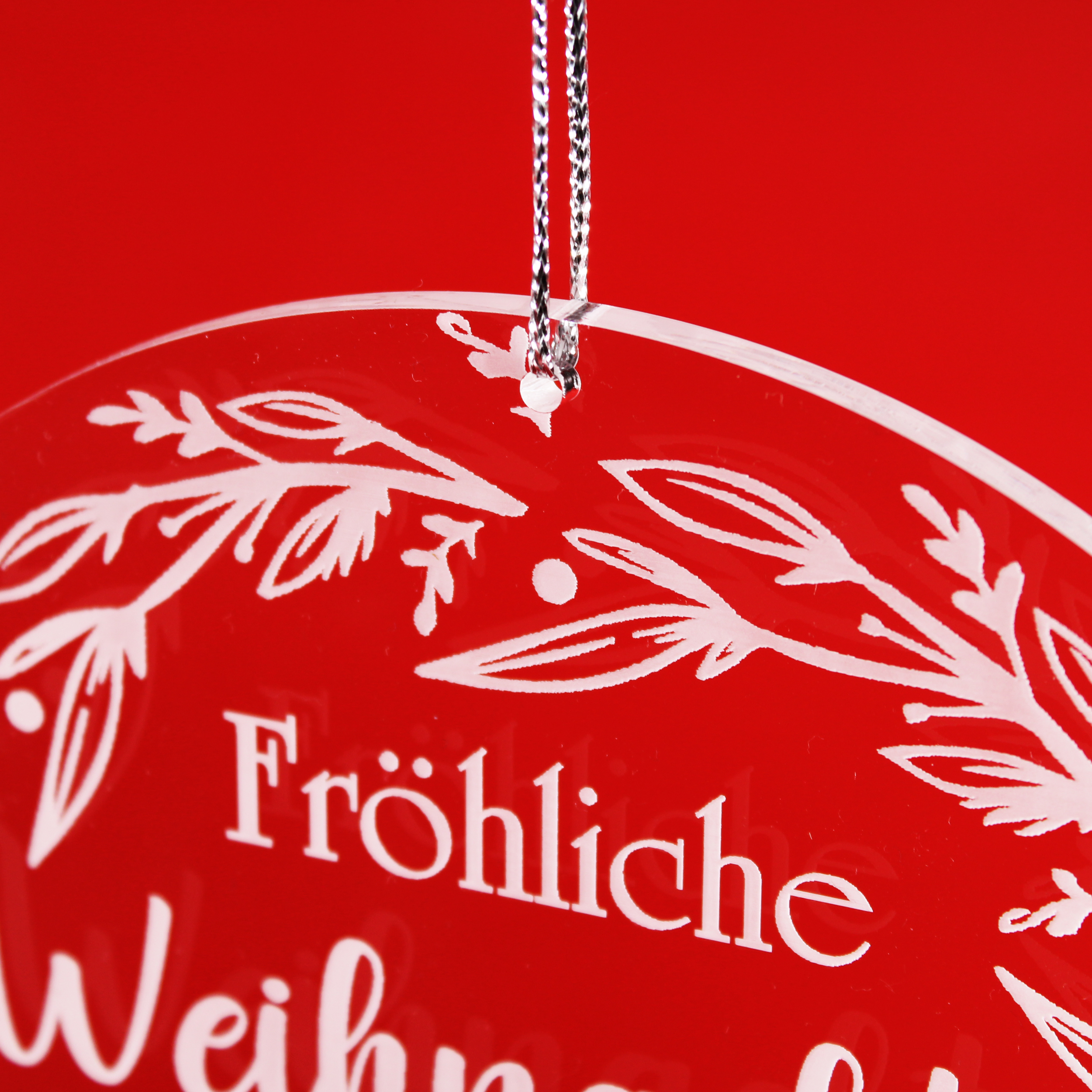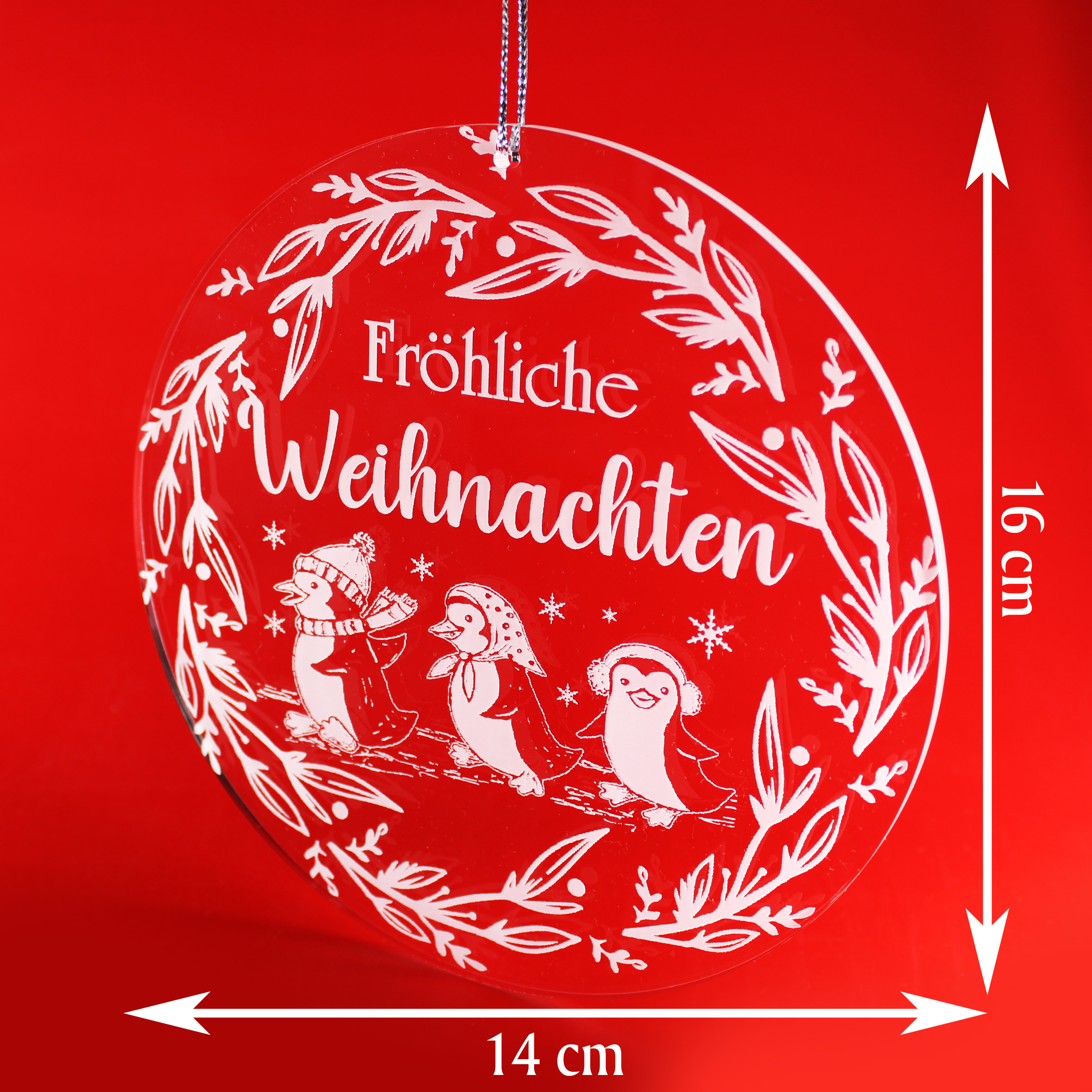 Weihnachtlicher Fensteranhänger aus Acryl – Hochwertige, runde Hängedeko (16 × 14 cm) aus glasklarem Acrylglas mit feiner weißer Gravur. Ideal als festliche Fensterdekoration oder elegante Winterdeko.