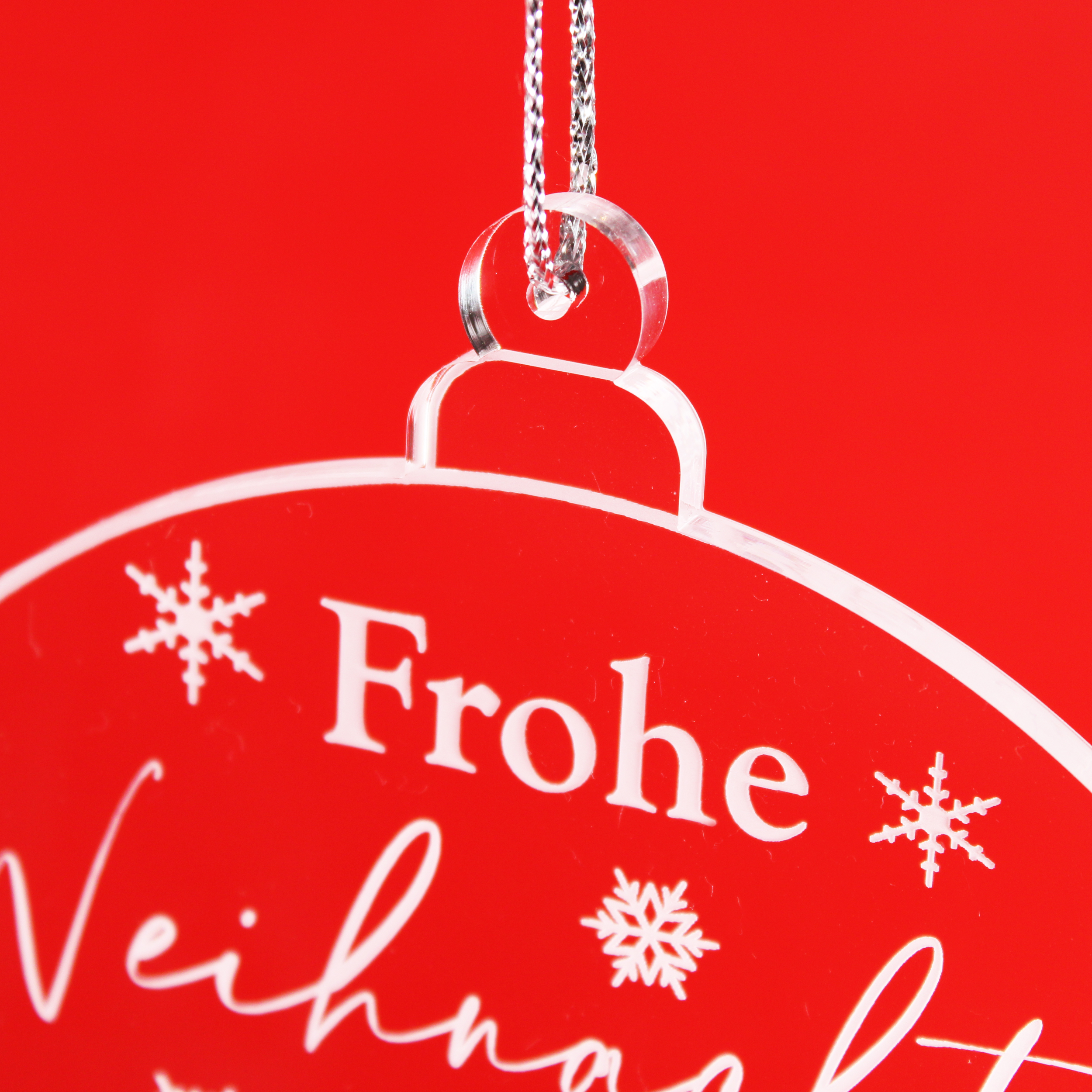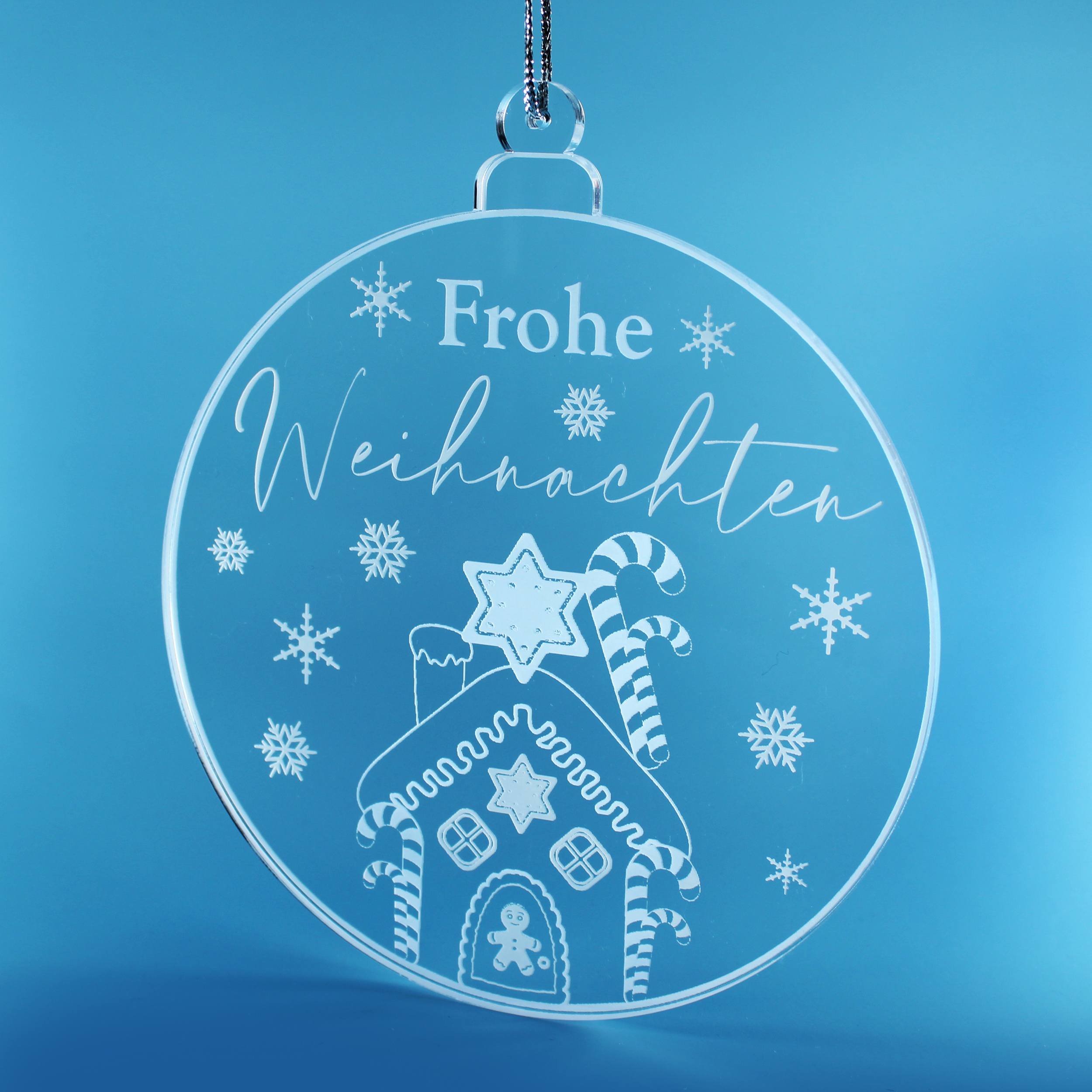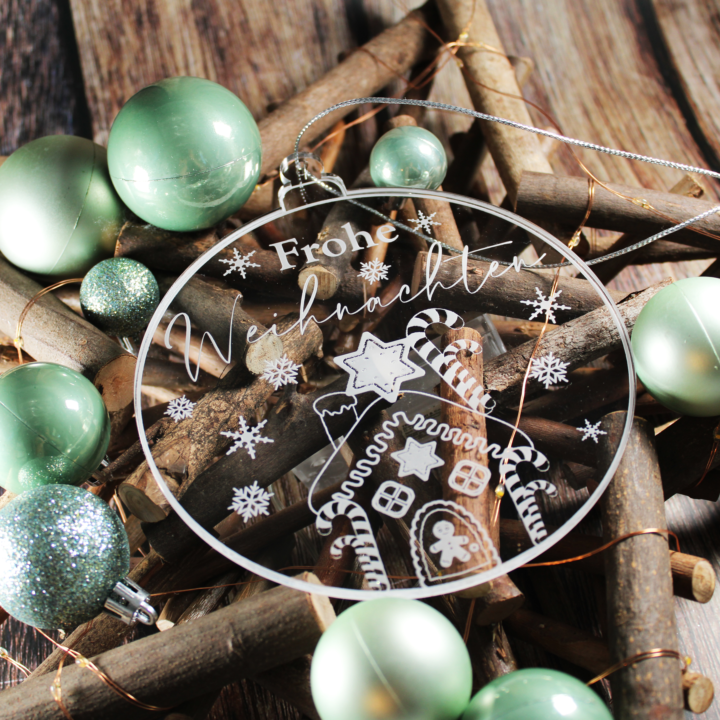 Weihnachtlicher Fensteranhänger aus Acryl – Hochwertige, runde Hängedeko (16 × 14 cm) aus glasklarem Acrylglas mit feiner weißer Gravur. Ideal als festliche Fensterdekoration oder elegante Winterdeko.