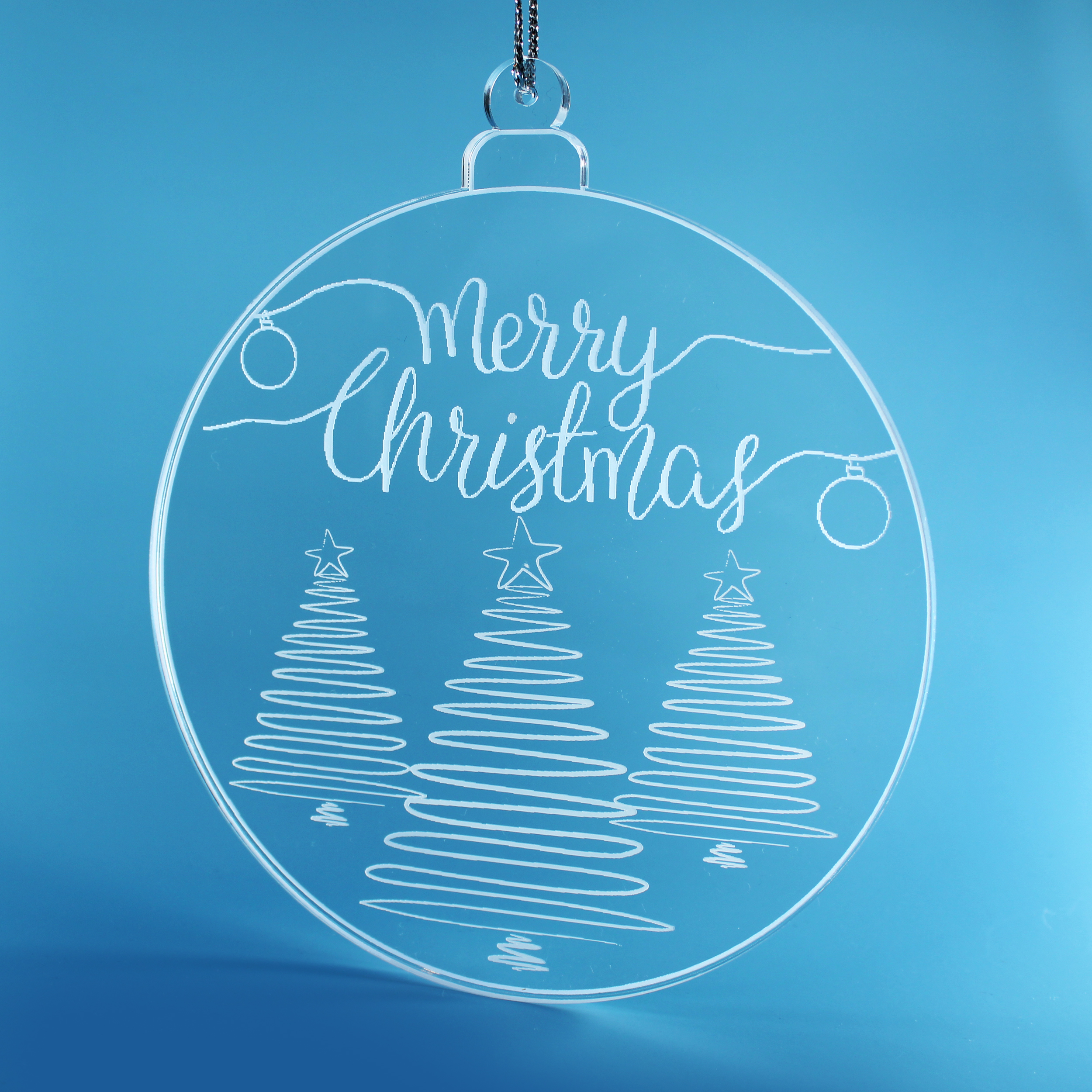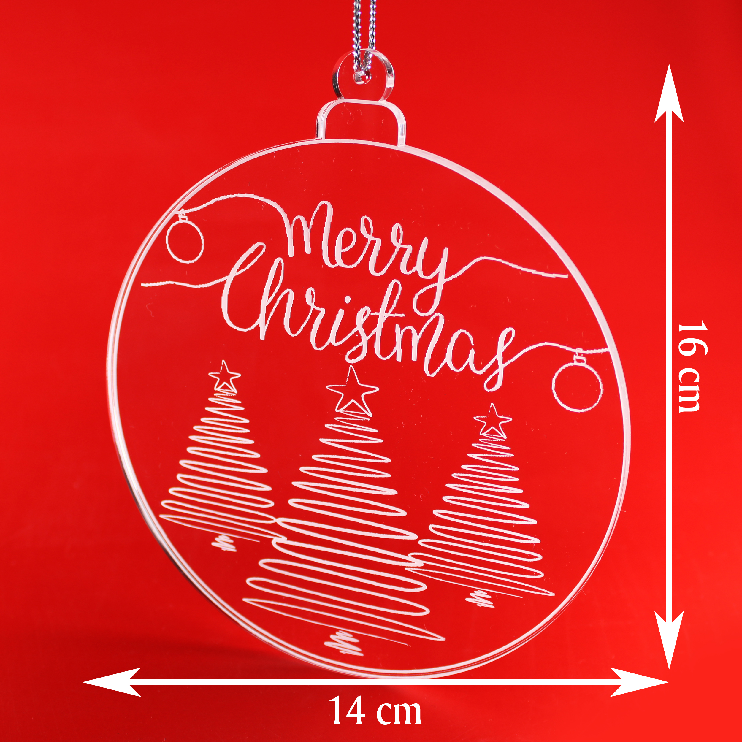 Weihnachtlicher Fensteranhänger aus Acryl – Hochwertige, runde Hängedeko (16 × 14 cm) aus glasklarem Acrylglas mit feiner weißer Gravur. Ideal als festliche Fensterdekoration oder elegante Winterdeko.