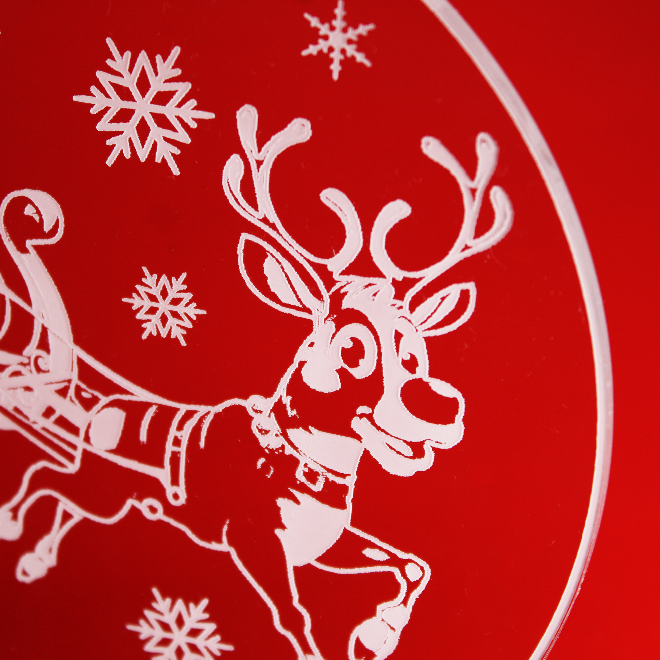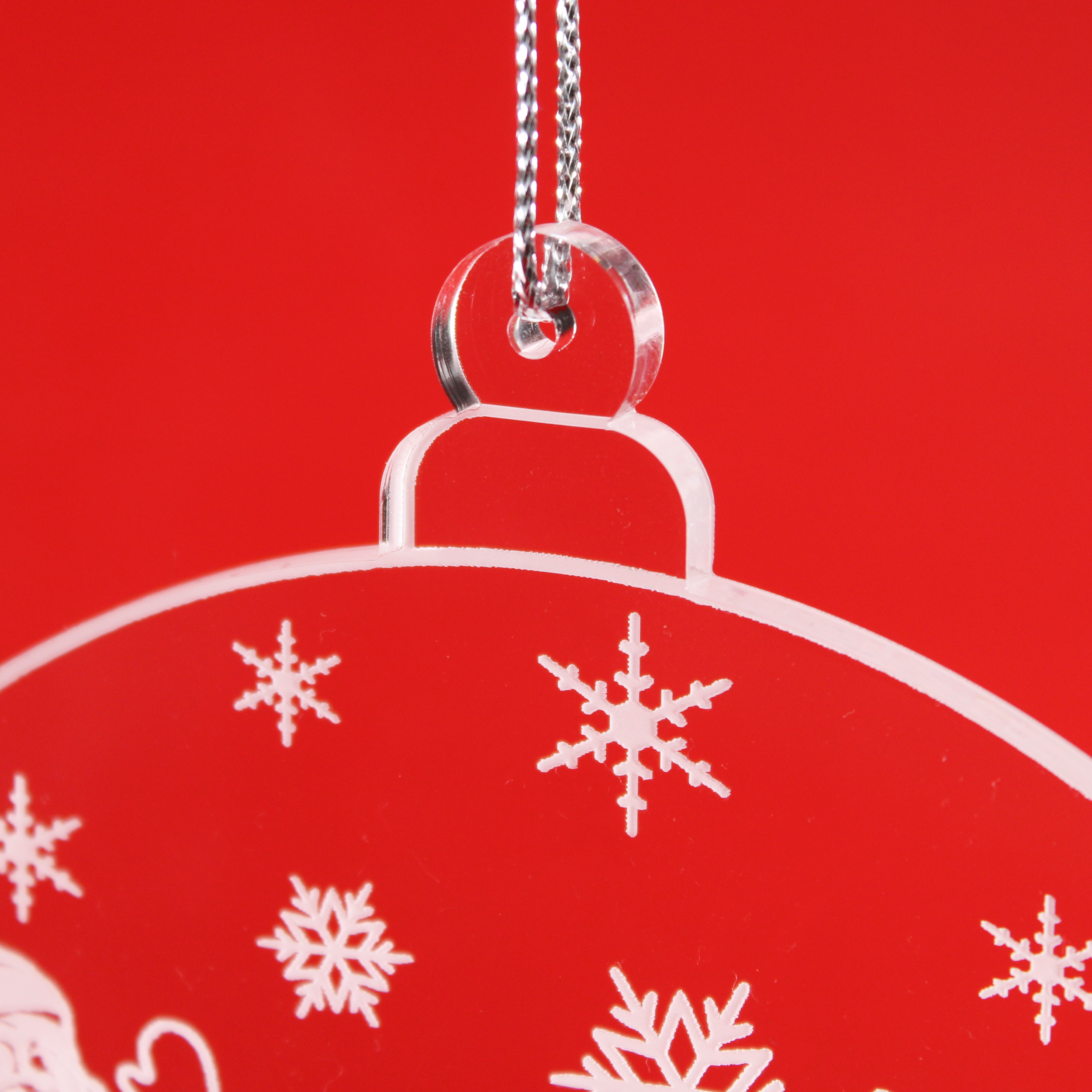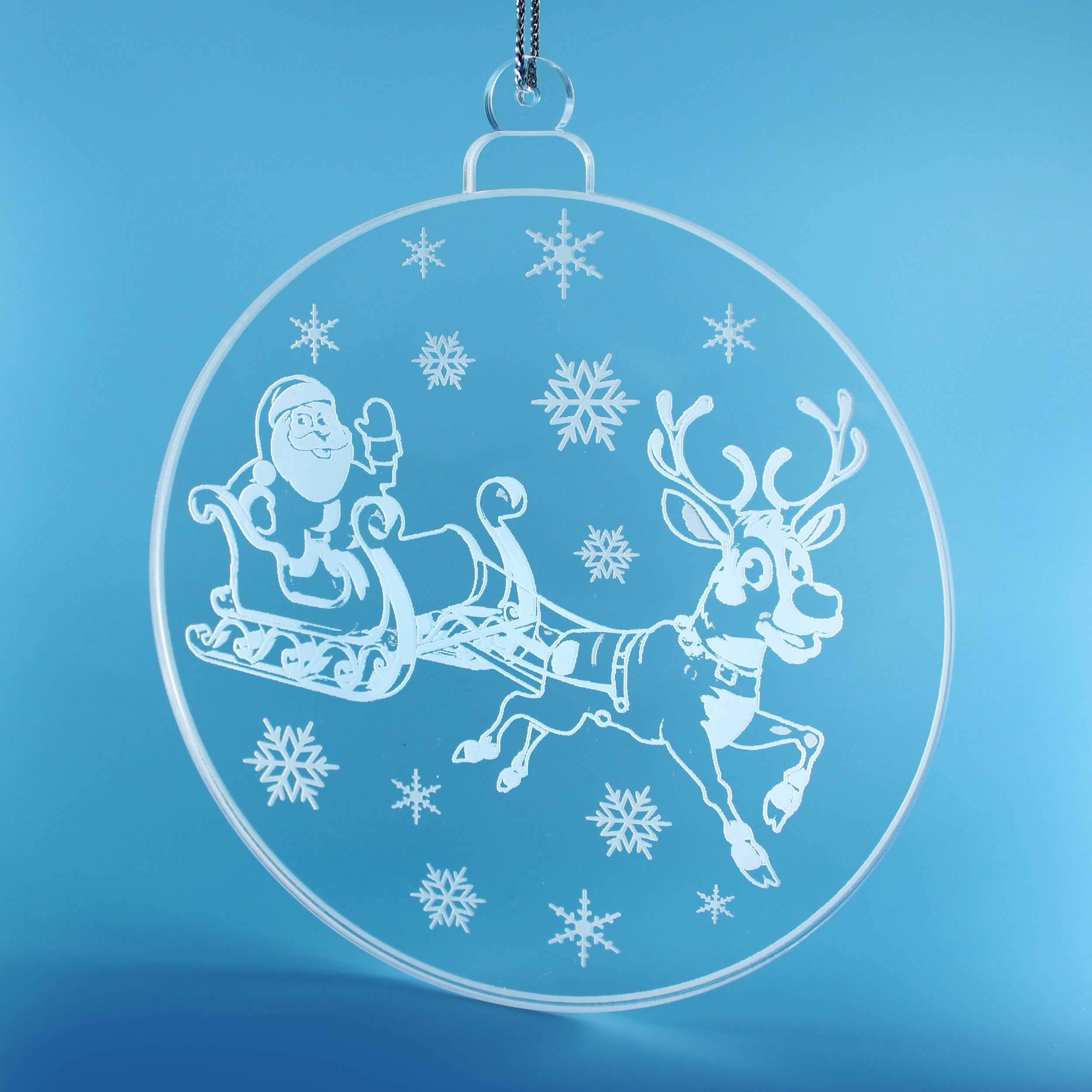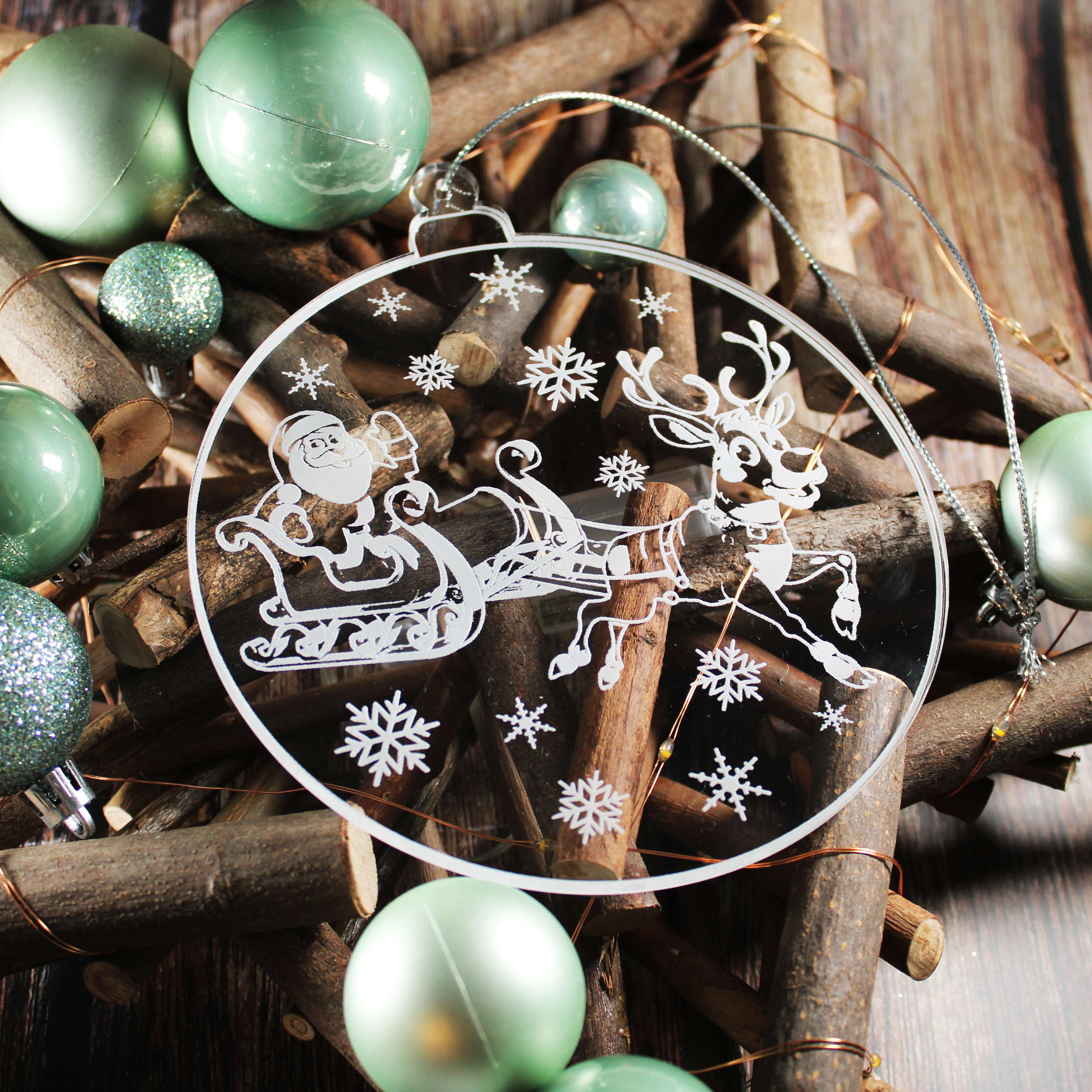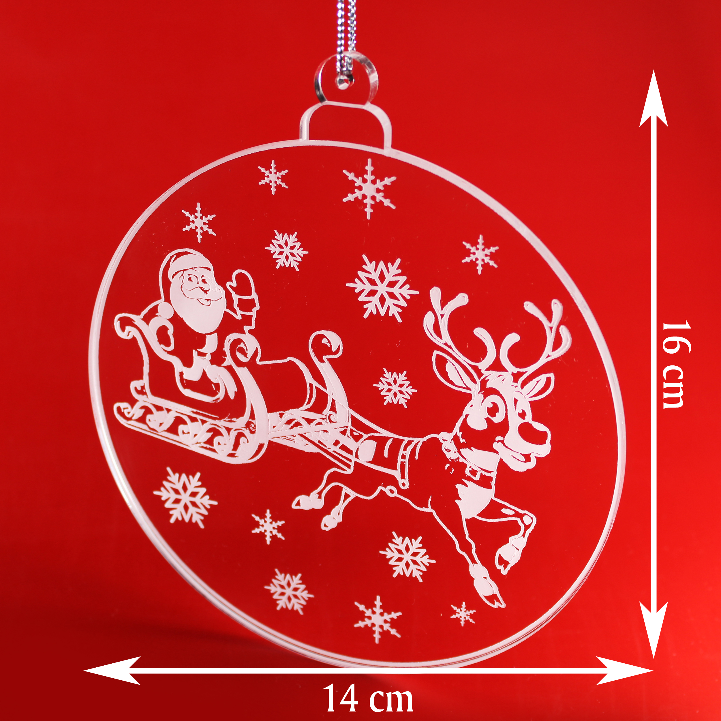 Weihnachtlicher Fensteranhänger aus Acryl – Hochwertige, runde Hängedeko (16 × 14 cm) aus glasklarem Acrylglas mit feiner weißer Gravur. Ideal als festliche Fensterdekoration oder elegante Winterdeko.