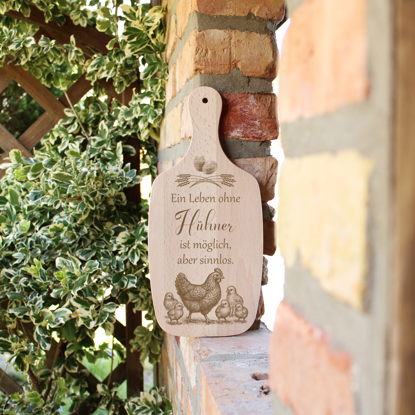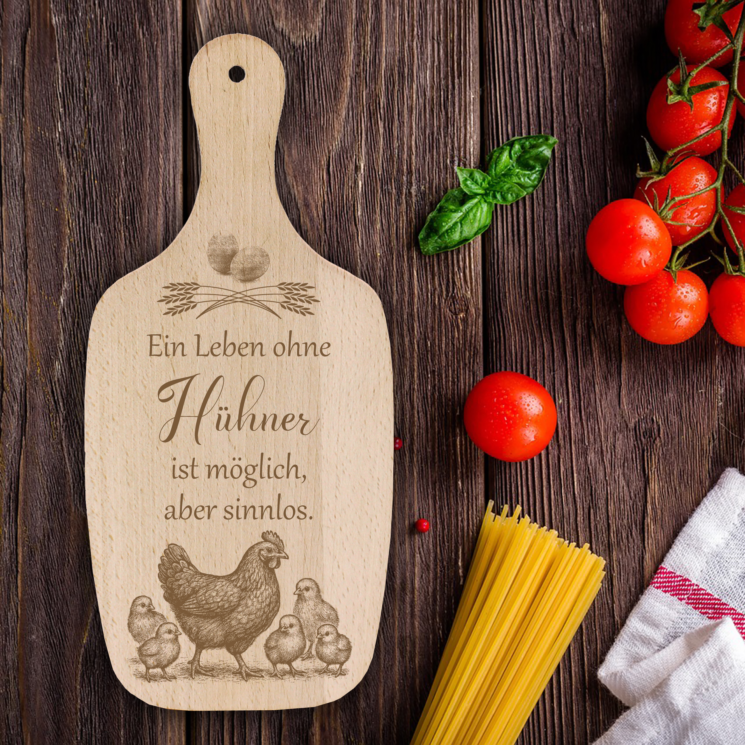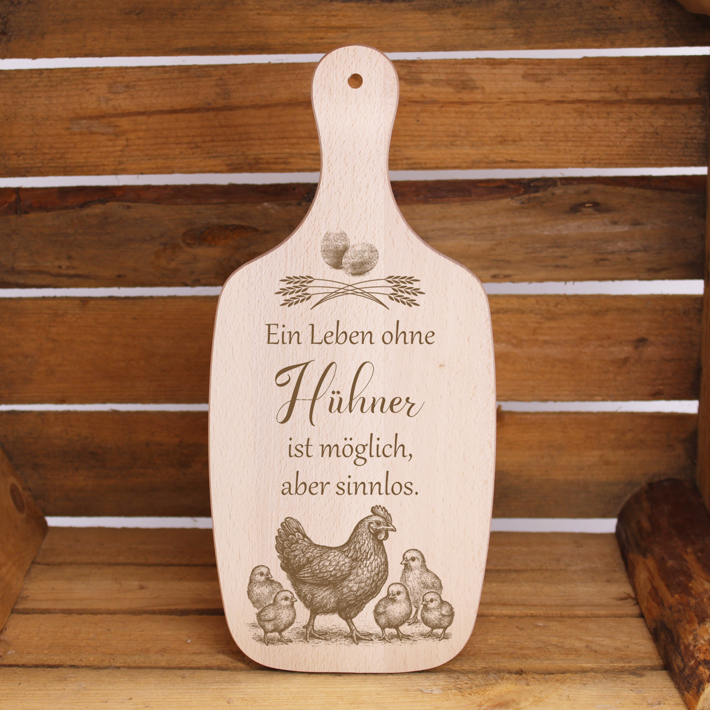 Frühstücksbrett Hühner – Holzbrett 33x15 cm mit Gravur „Ein Leben ohne Hühner ist möglich, aber sinnlos“
