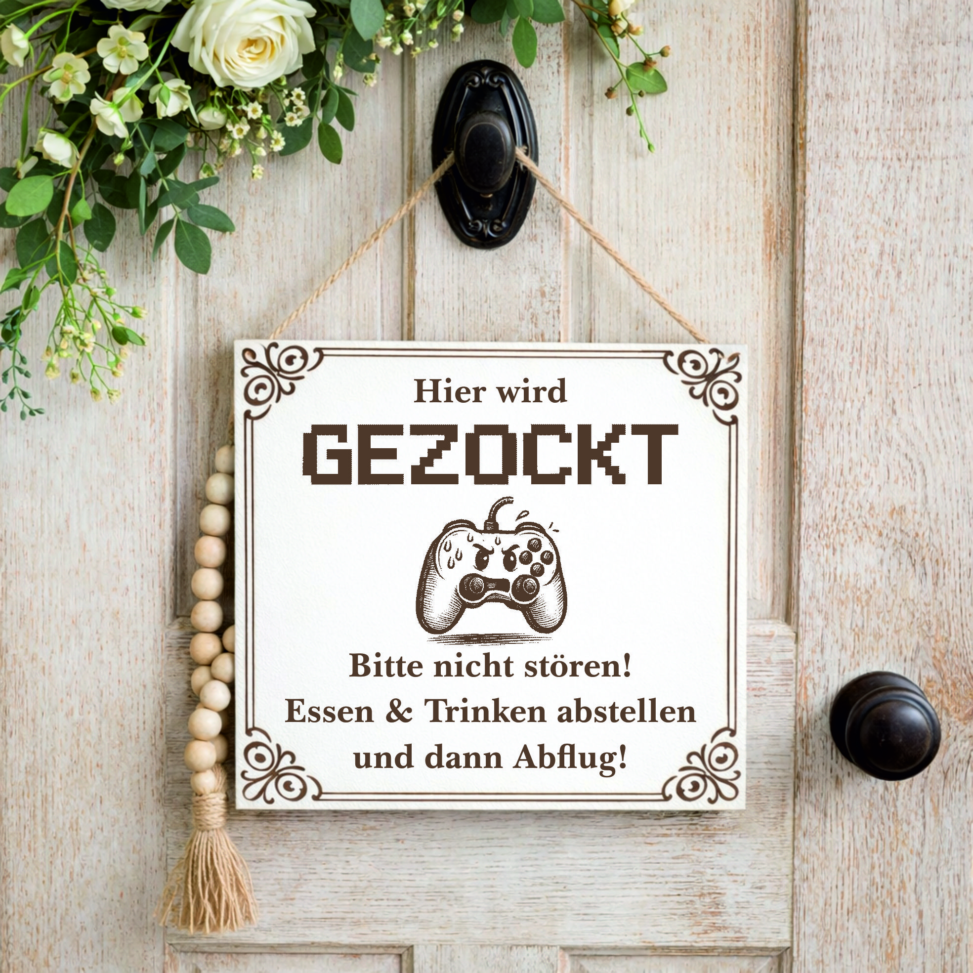 Gefertigt aus stabilem HDF und veredelt mit einer präzisen braunen Lasergravur, überzeugt das Schild durch seine langlebige Qualität und detailreiche Gestaltung. Das Controller-Motiv unterstreicht den Gaming-Charakter und sorgt für eine moderne Optik.