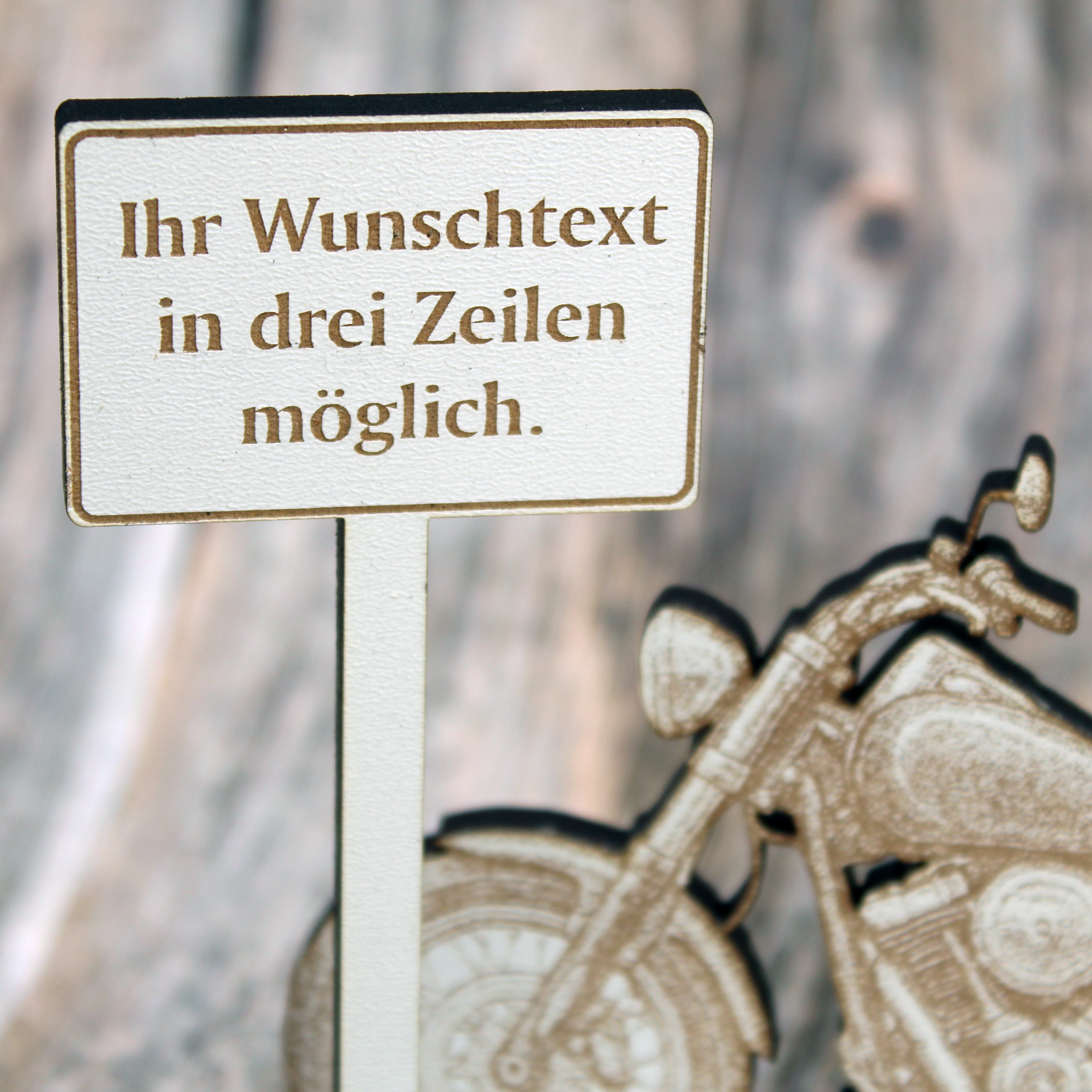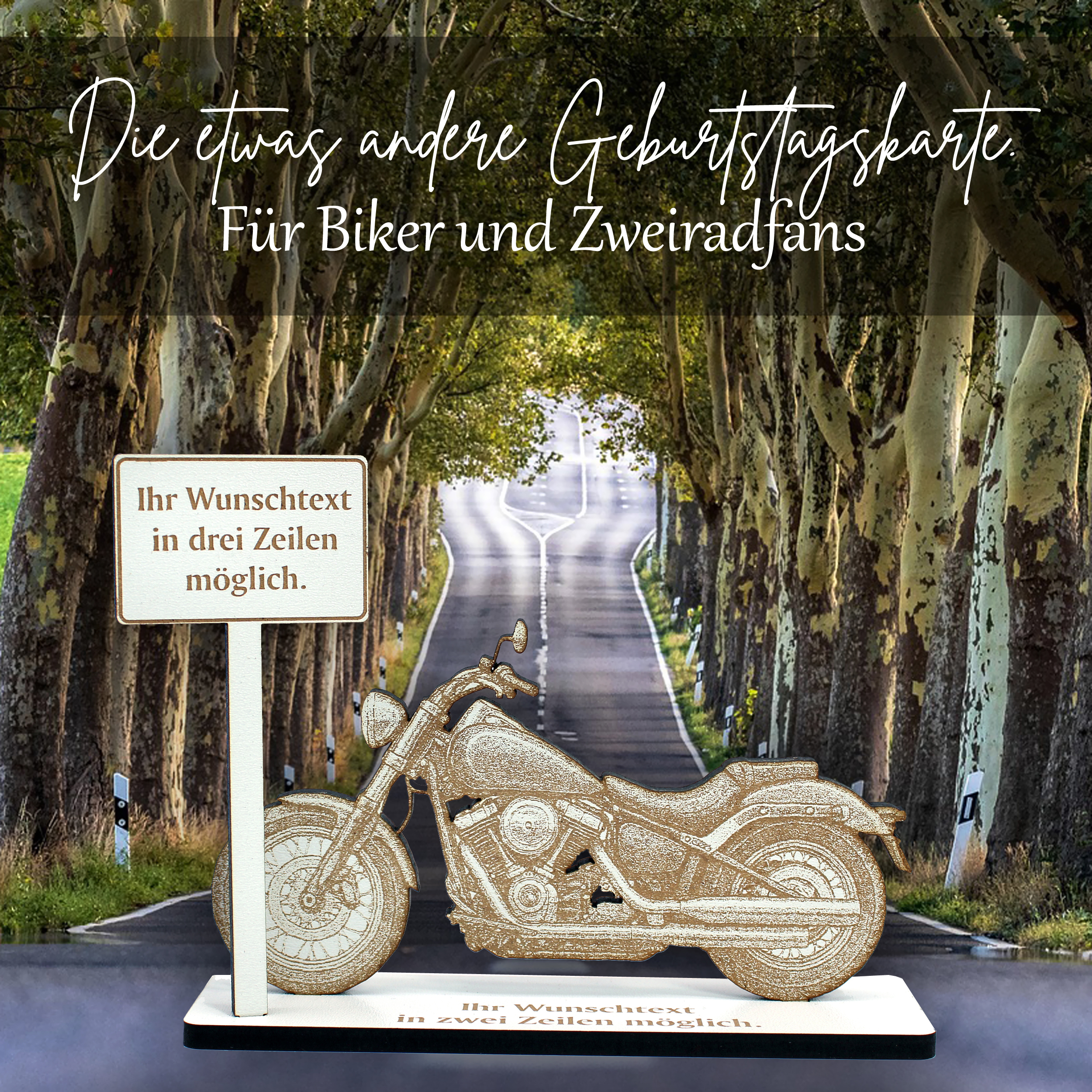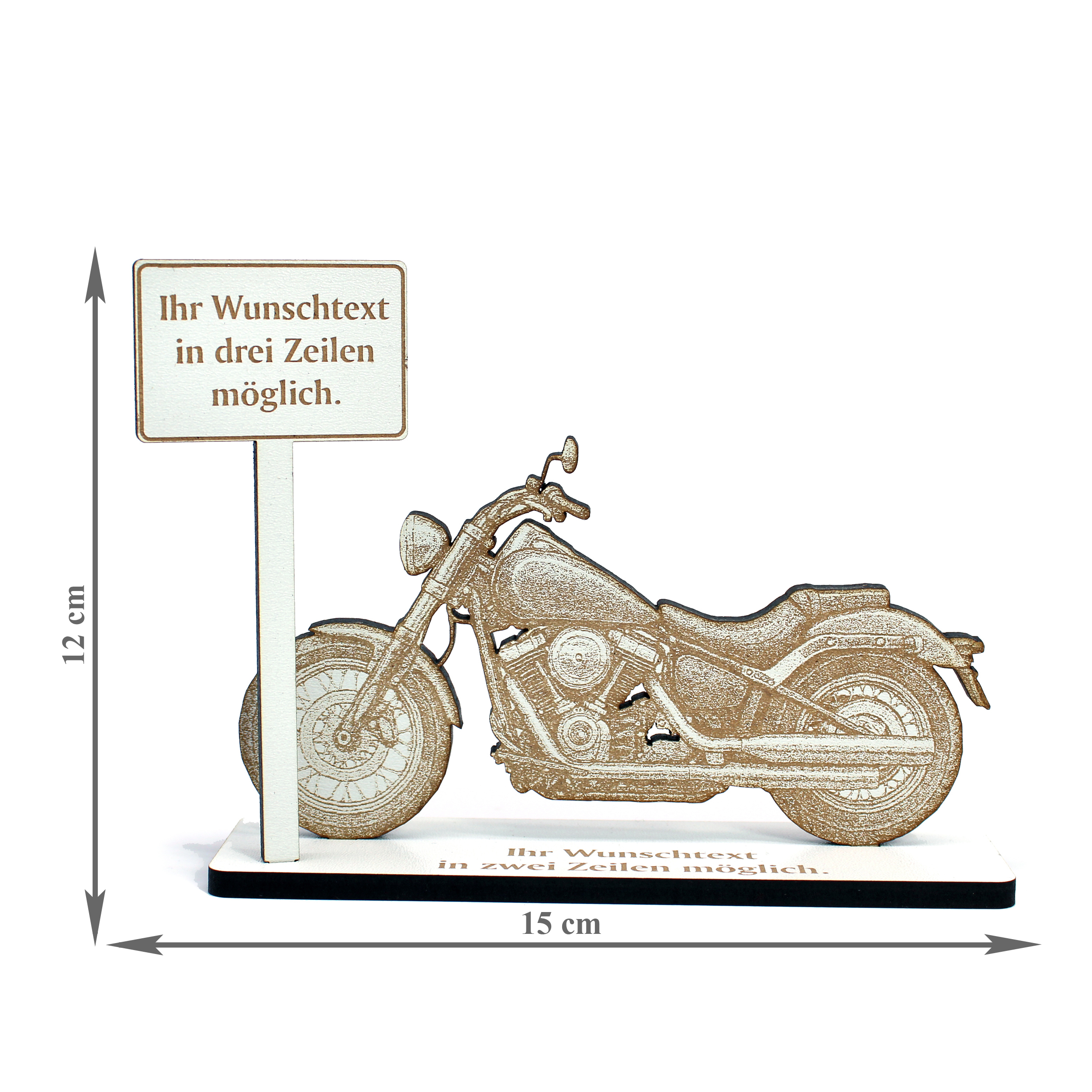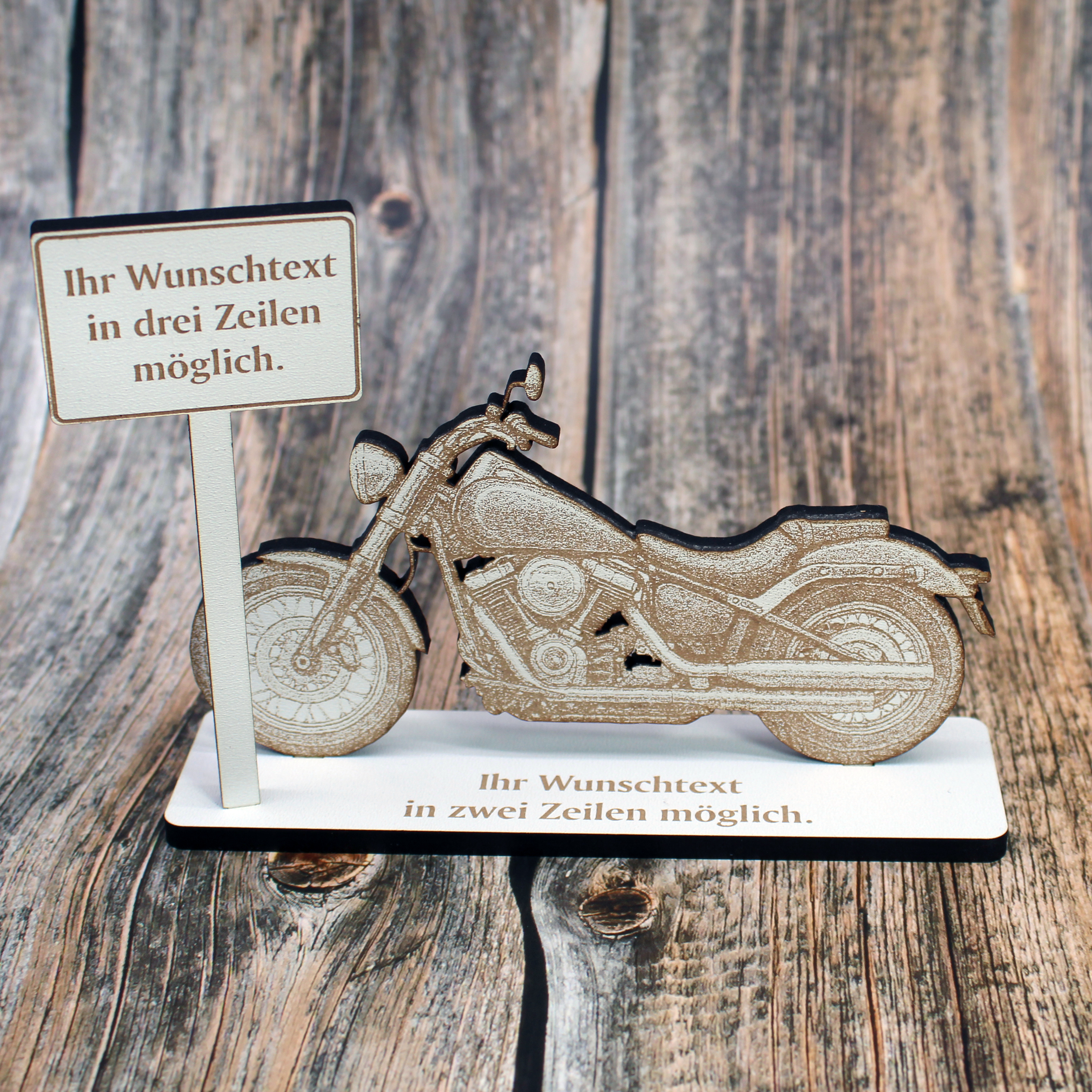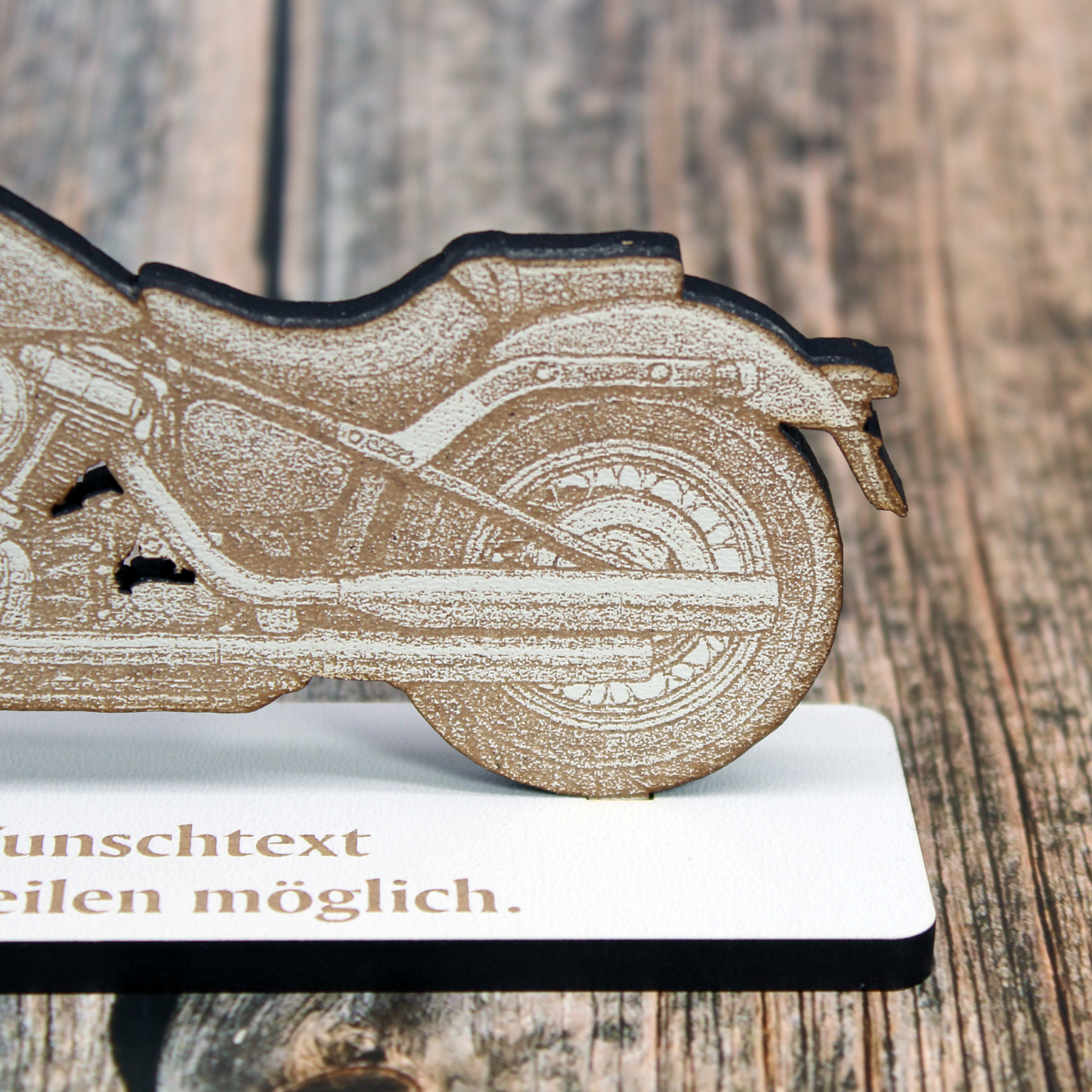 Der Aufsteller, gefertigt aus weiß beschichtetem HDF mit brauner Lasergravur, zeigt neben dem Motorrad ein gravierbares Ortsschild – ideal für den Namen der Lieblingsstrecke, Wohnort oder Jahrestag. Zusätzlich kann der Standfuß personalisiert werden – mit einem herzlichen Spruch, Datum oder Biker-Namen.