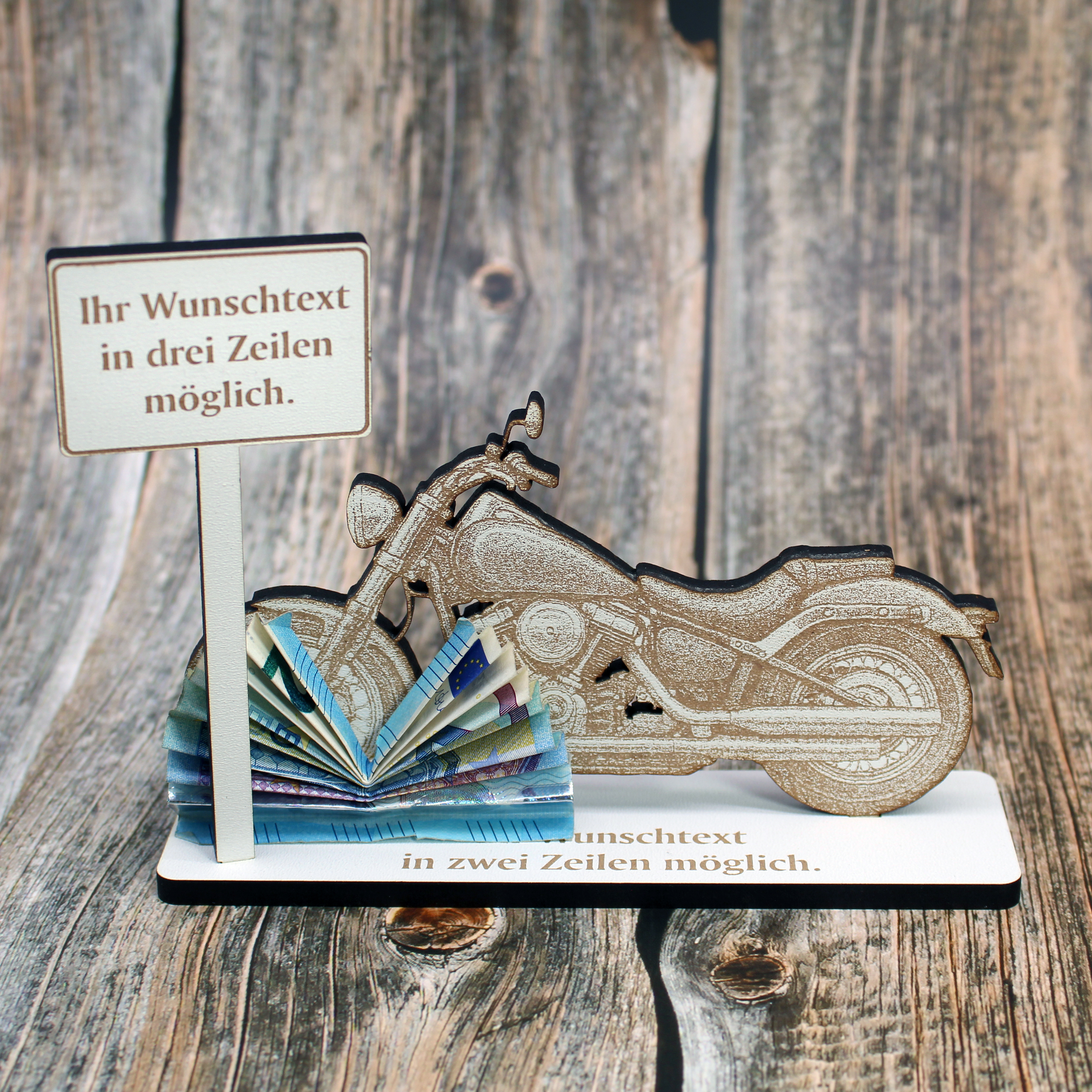 - Chopper Motorrad Aufsteller – Dekorativer Geldgeschenk-Aufsteller mit detailreichem Cruiser Bike / Chopper Motorrad und personalisierbarem Ortsschild – cooles Biker Geschenk für echte Road-Fans.