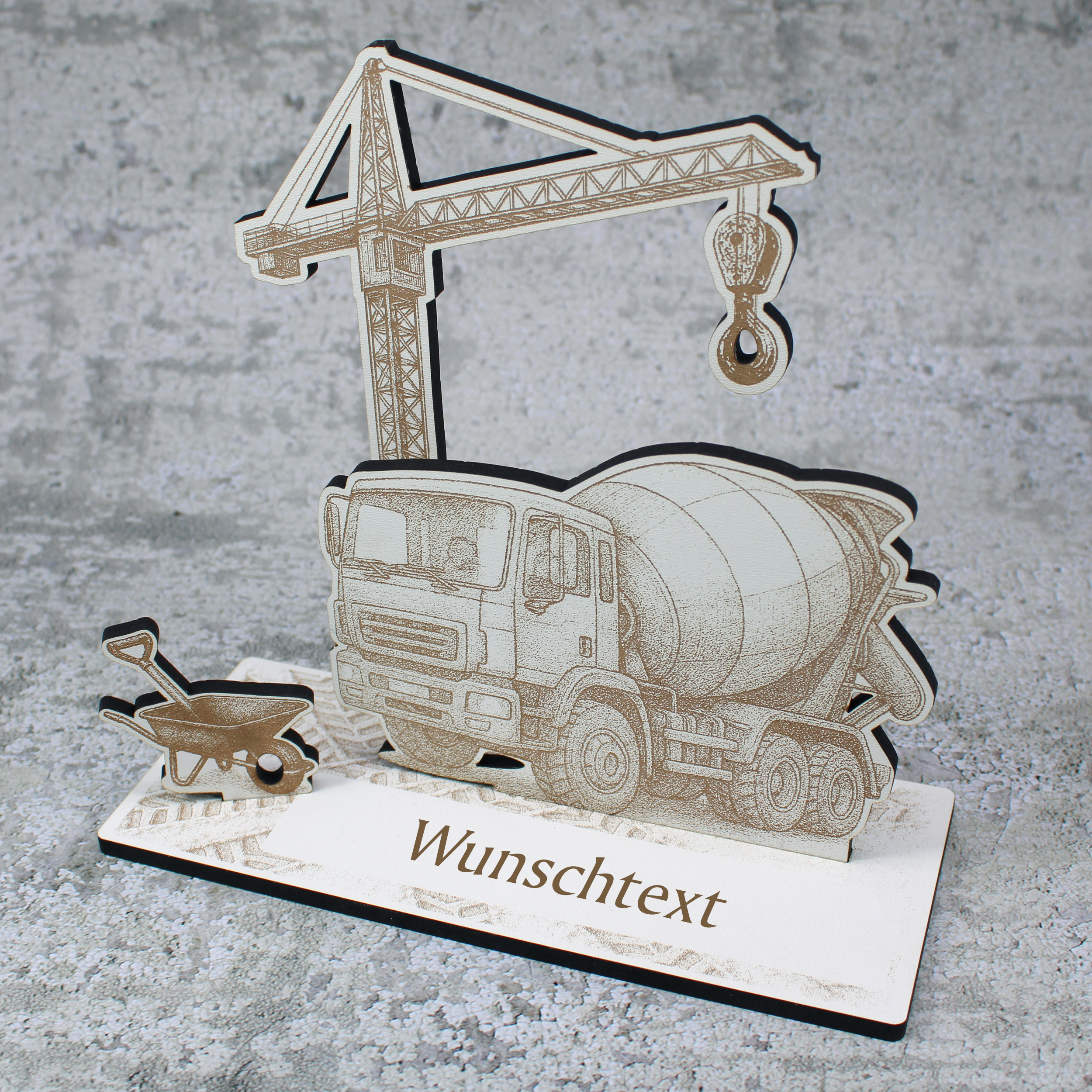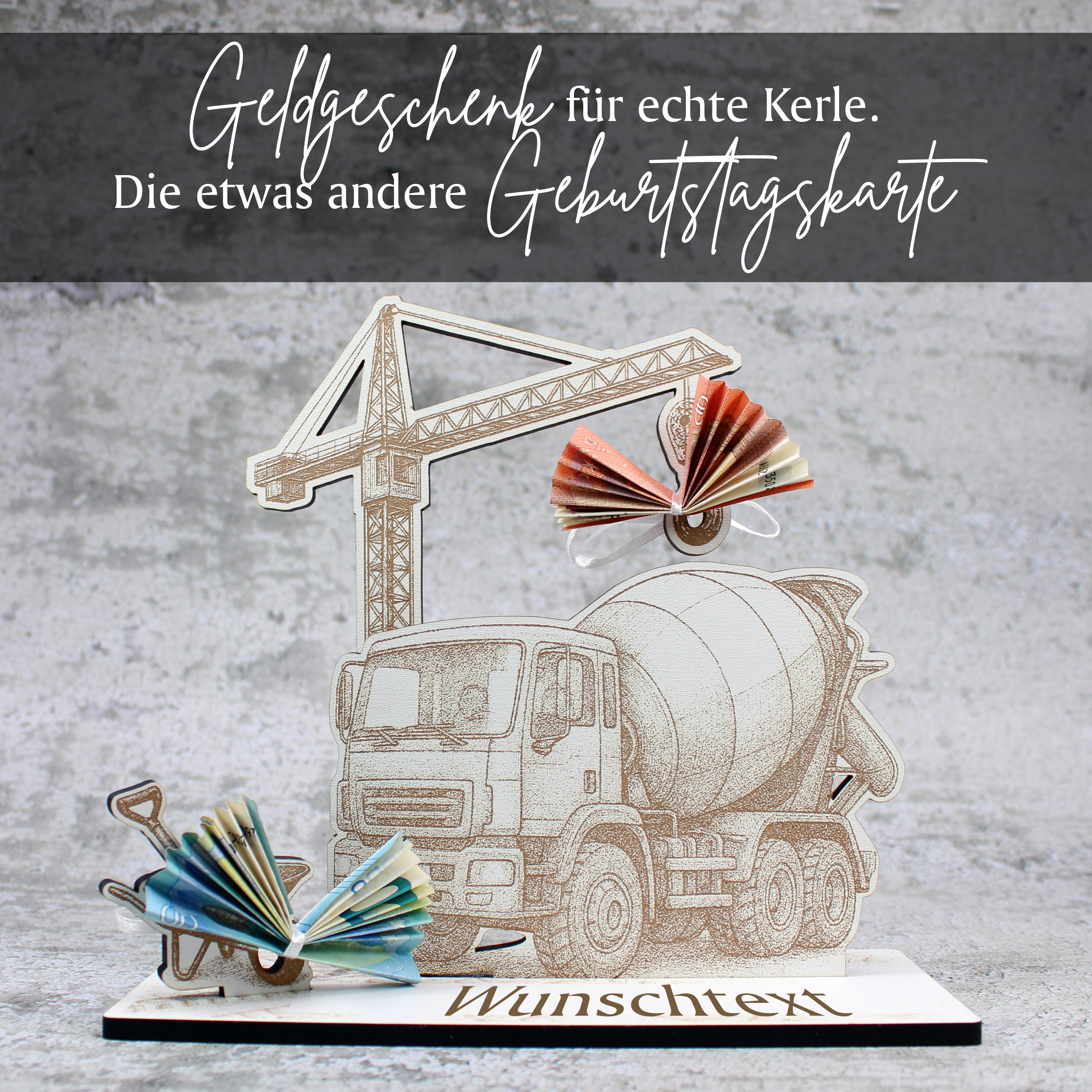 - Geldgeschenk Aufsteller „Mischerfahrer“ – Detailreich gravierter Aufsteller mit Mischer, Kran und Schubkarre, perfekt als originelles Geldgeschenk für Bauarbeiter, Handwerker oder Kollegen vom Bau.