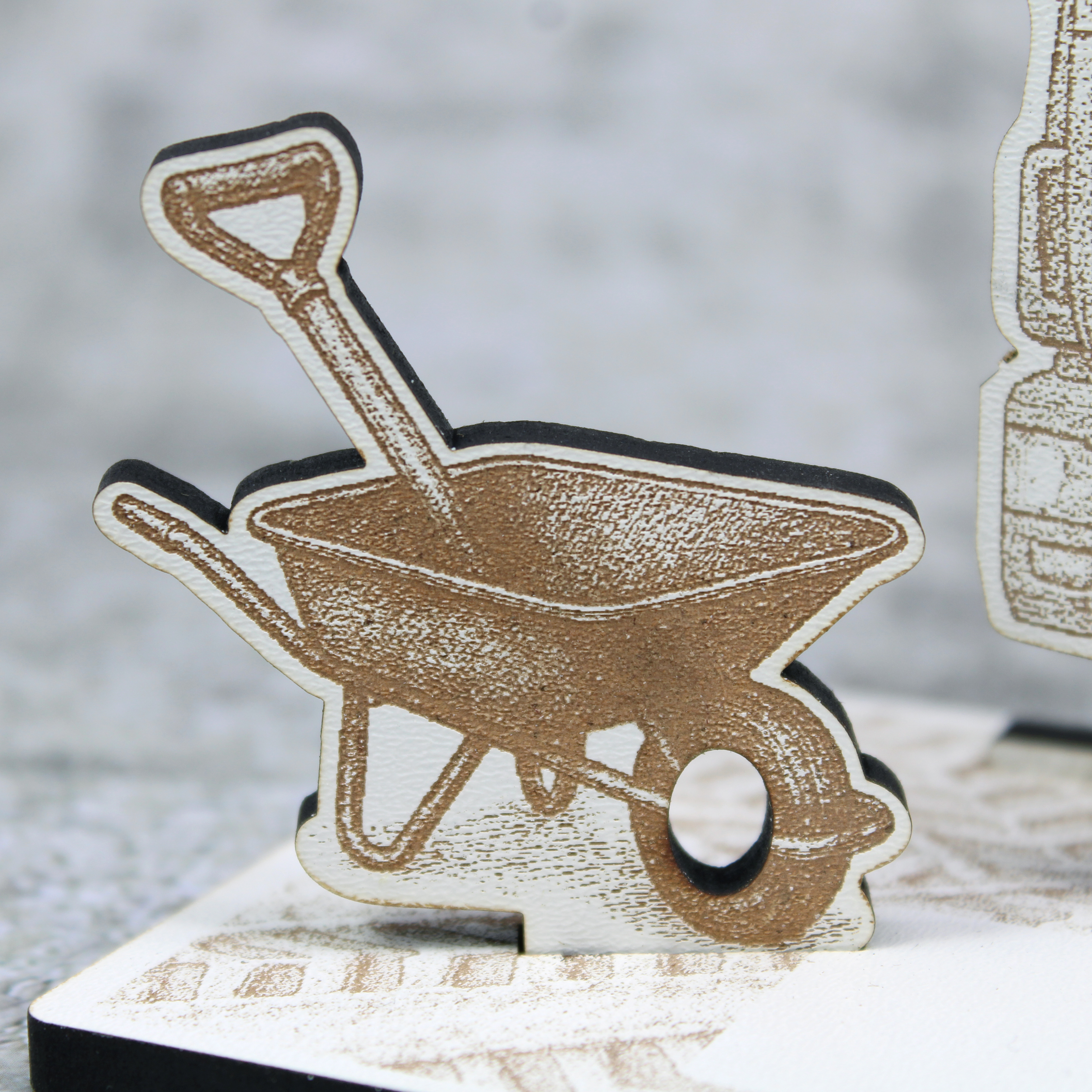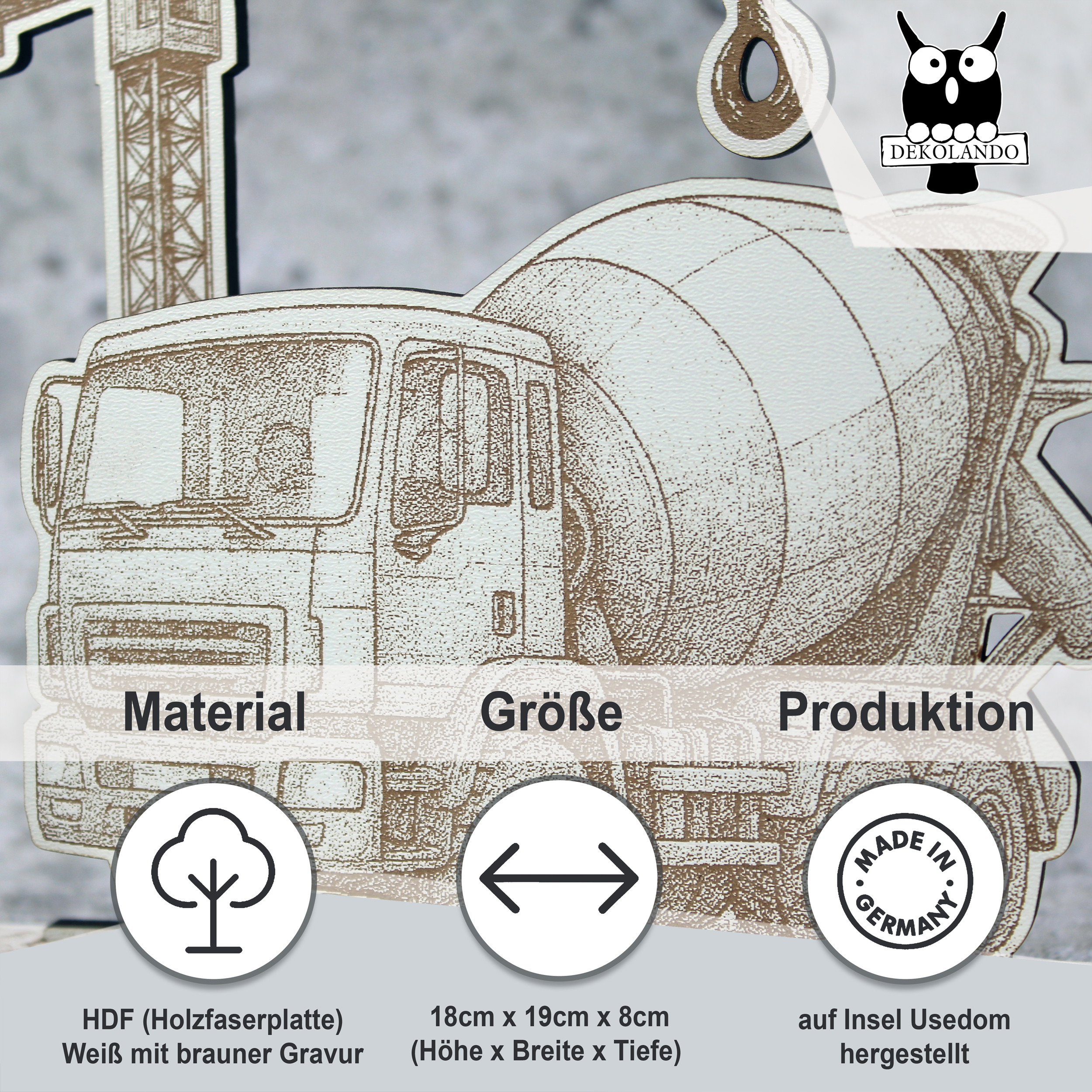 Gefertigt aus weiß beschichtetem HDF mit brauner Lasergravur, überzeugt der Aufsteller durch feine Gravurdetails, klare Linien und eine hochwertige, kontrastreiche Optik. Die warmen Brauntöne harmonieren perfekt mit der weißen Oberfläche und unterstreichen den rustikalen Baustellen-Charme.