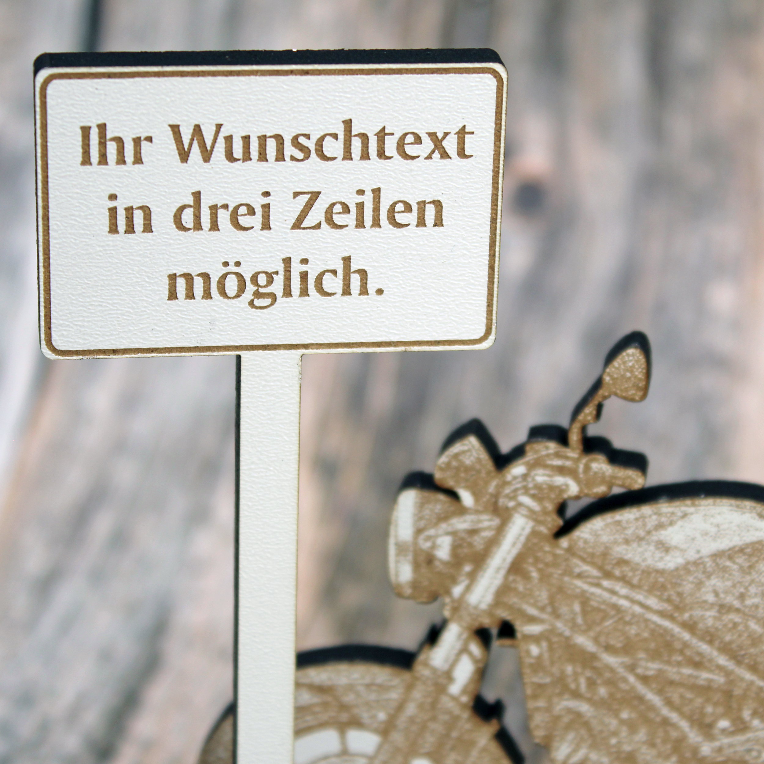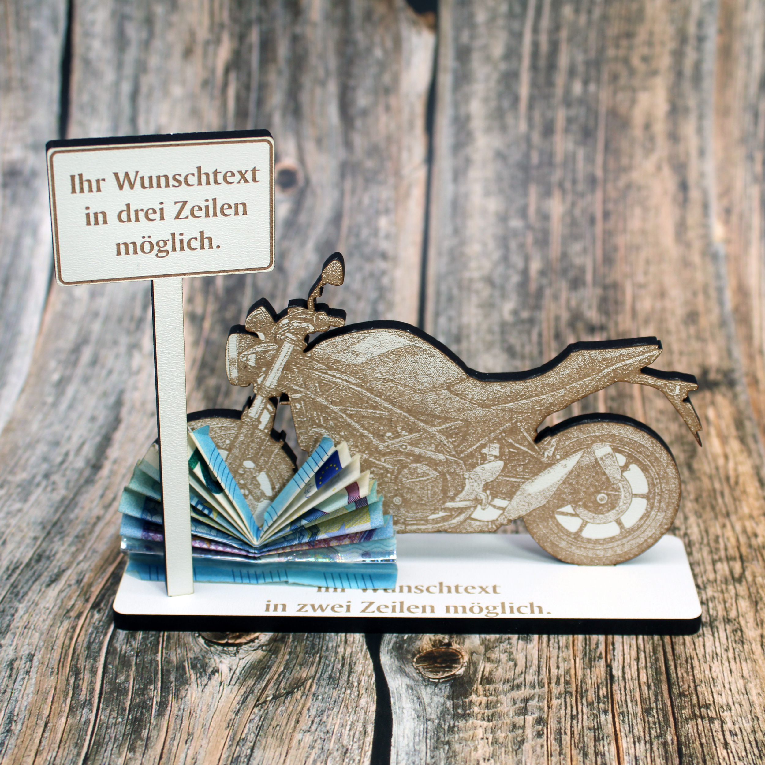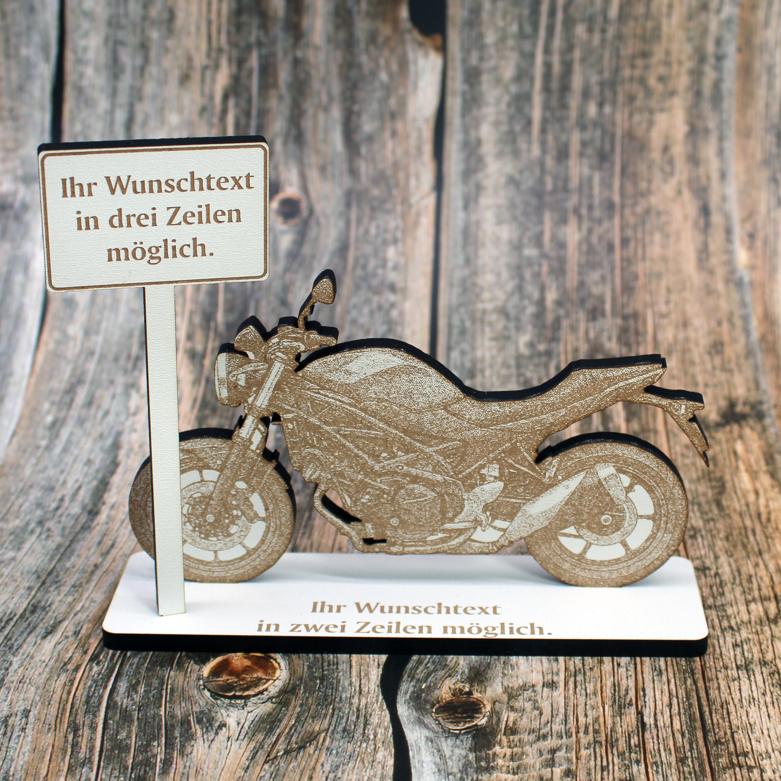 Geldgeschenk Aufsteller „Naked Bike“ – HDF Dekoaufsteller mit Streetfighter Motorrad & personalisierbarem Ortsschild – weiß mit brauner Gravur, 15×12 cm