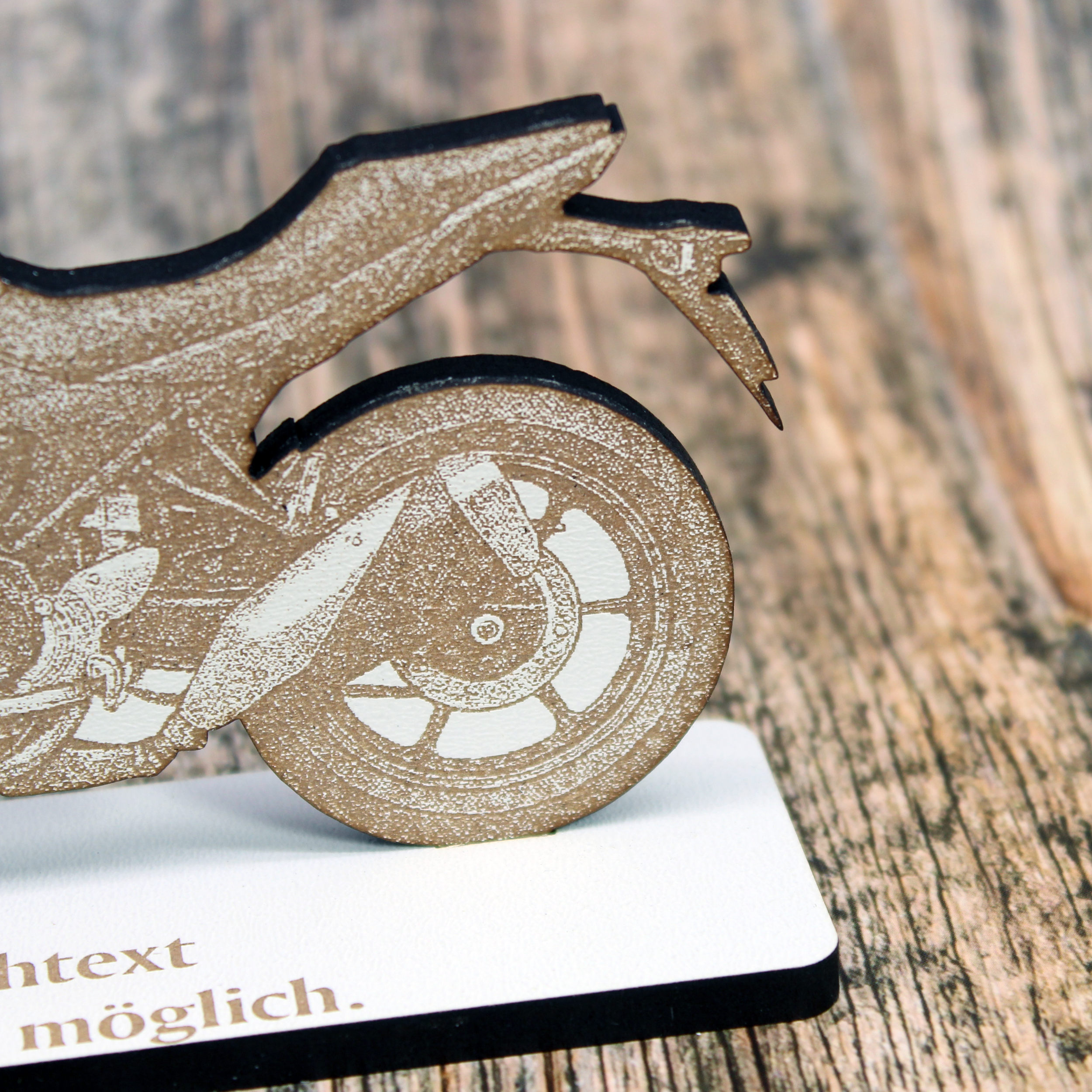 - Hochwertige Gravur & modernes Design – Weiß beschichtetes HDF mit brauner Lasergravur, klare Linien und Details, schwarzer Schnittkanten-Look – edle Deko für Motorrad ohne Verkleidung.