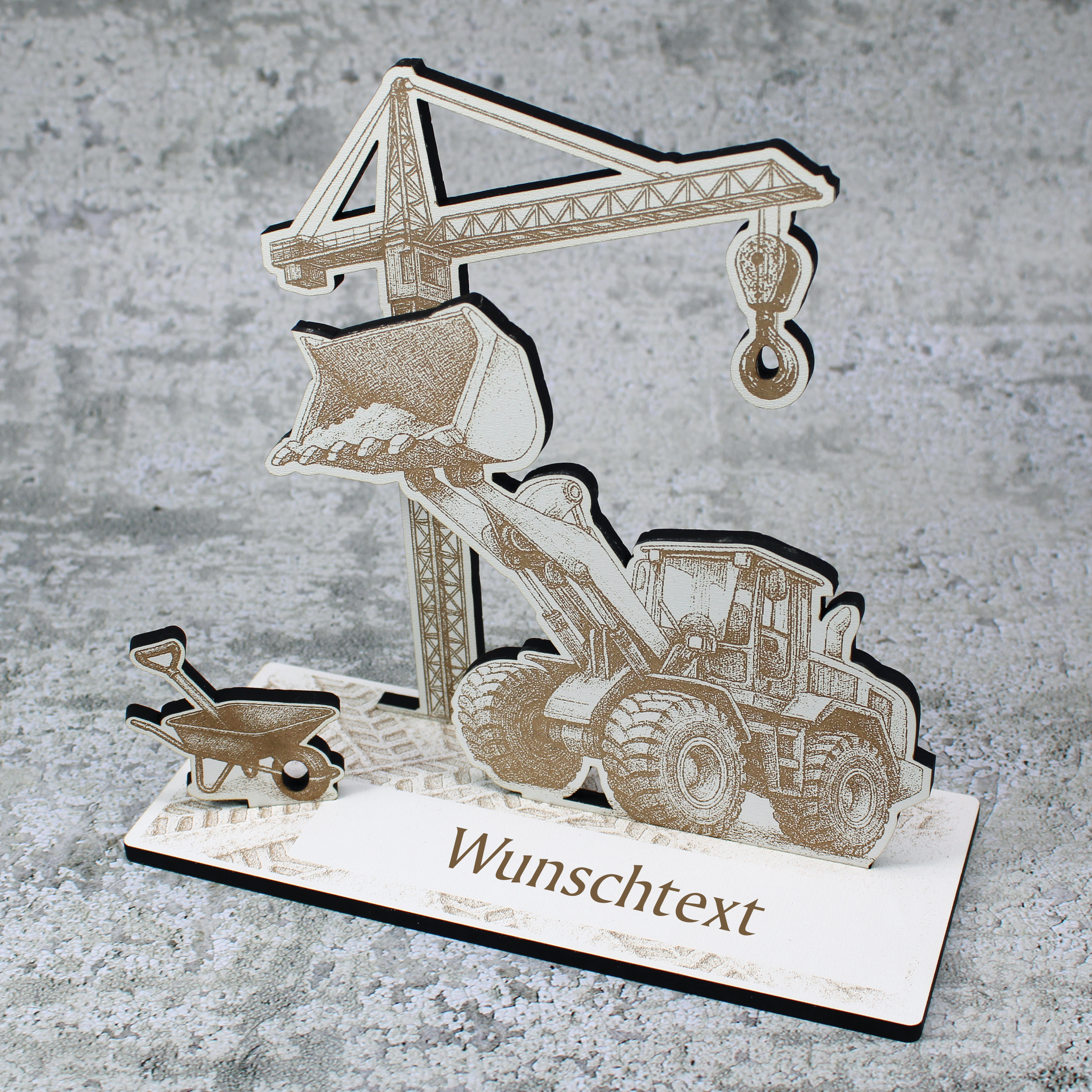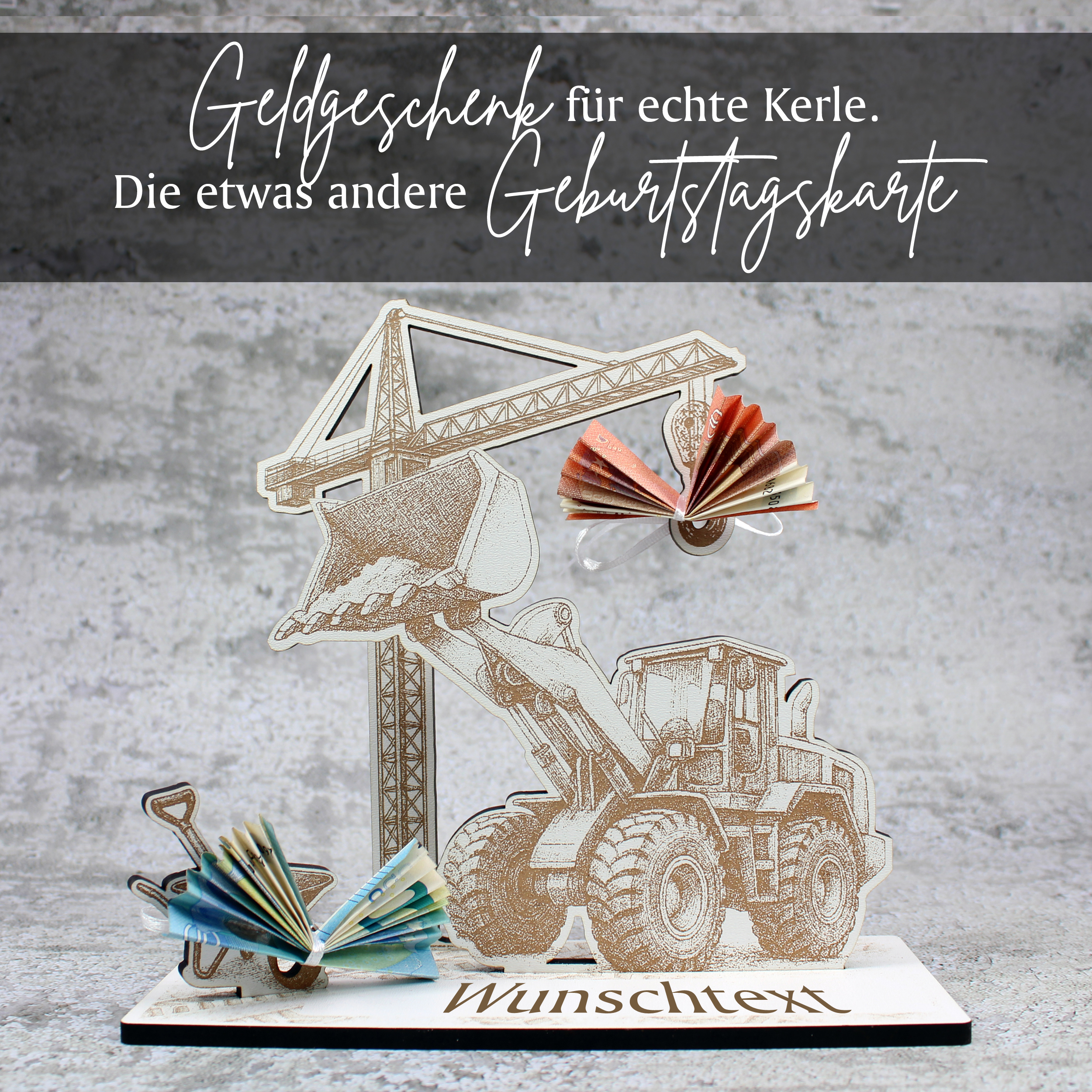 - Geldgeschenk Aufsteller „Radladerfahrer“ – Detailreich gravierter Aufsteller mit Radlader, Kran und Schubkarre, perfekt als originelles Geldgeschenk für Bauarbeiter, Handwerker oder Kollegen vom Bau.