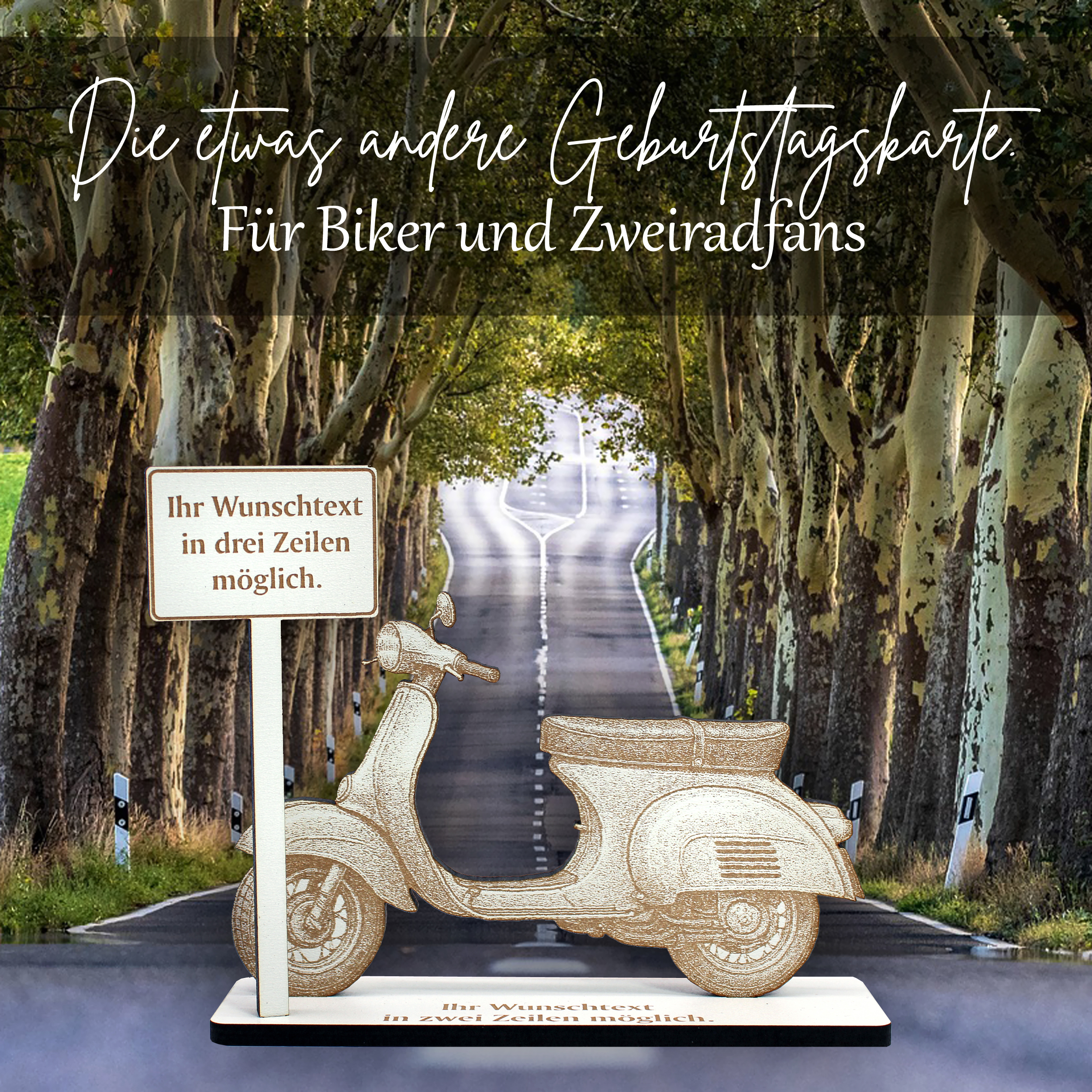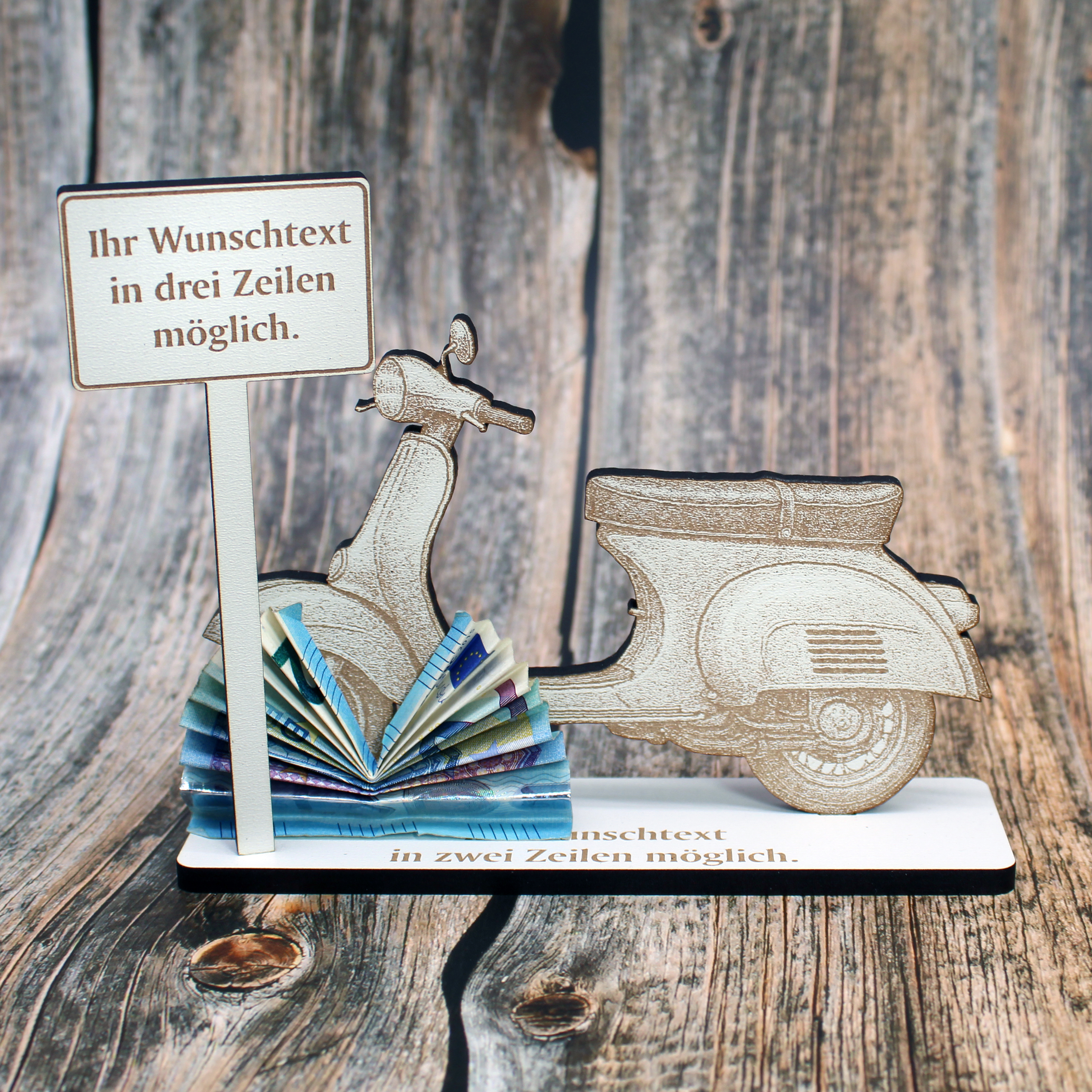 Der freistehende Aufsteller ist ideal als Geldgeschenk oder Gutscheinträger für Rollerfreunde – ob zur bestandenen Rollerprüfung, Geburtstag, Fahrzeugübernahme, Restauration oder als Überraschung zur nächsten Tour.
