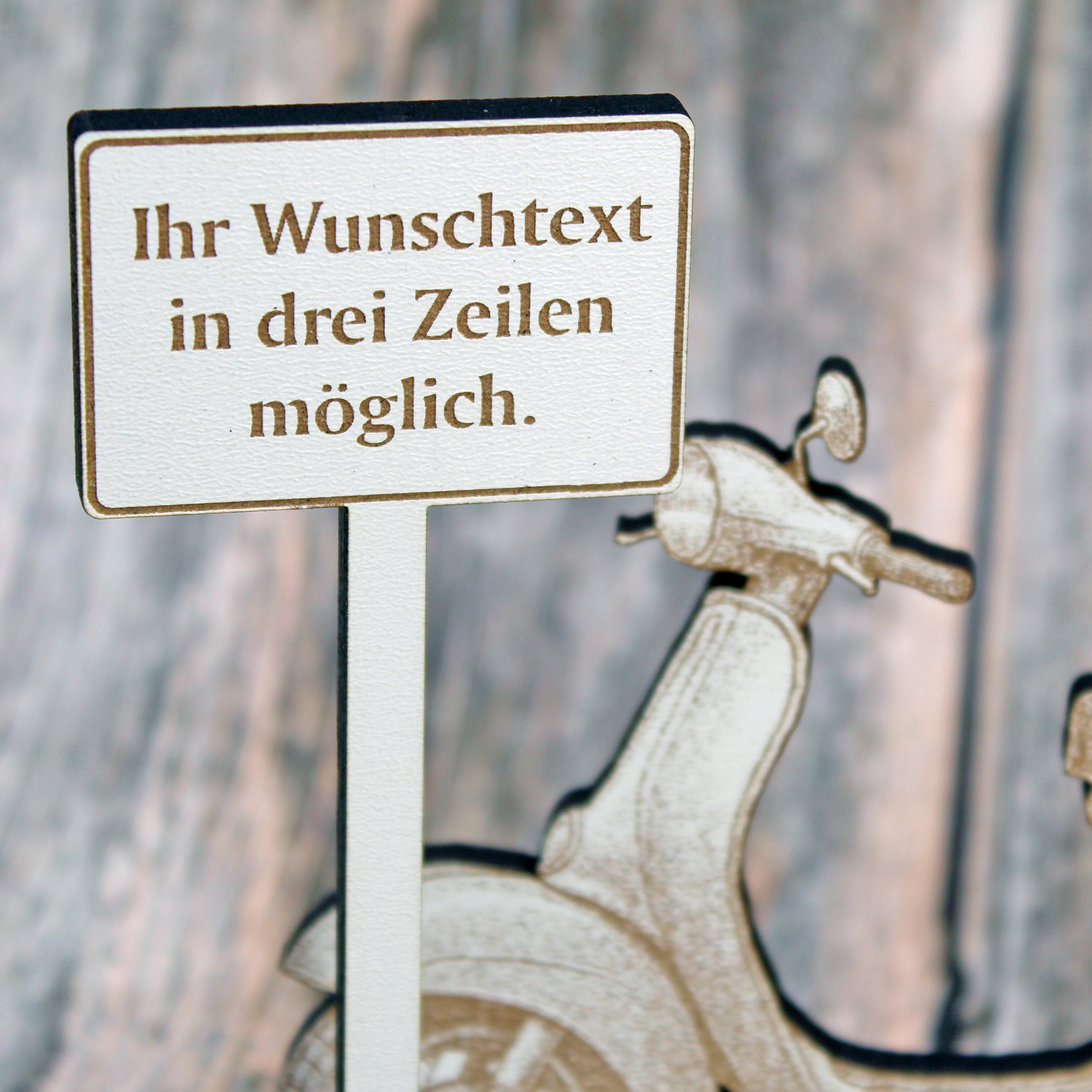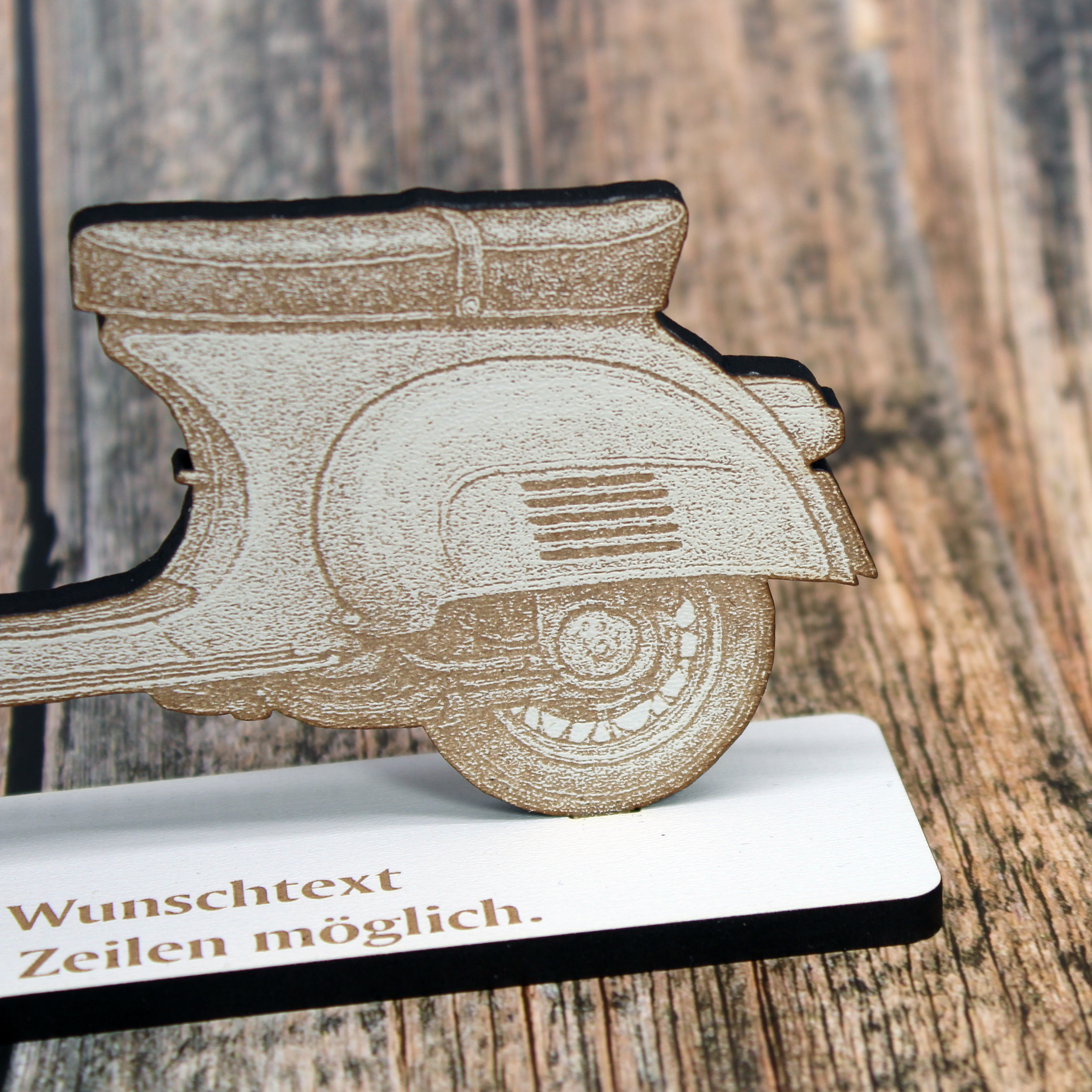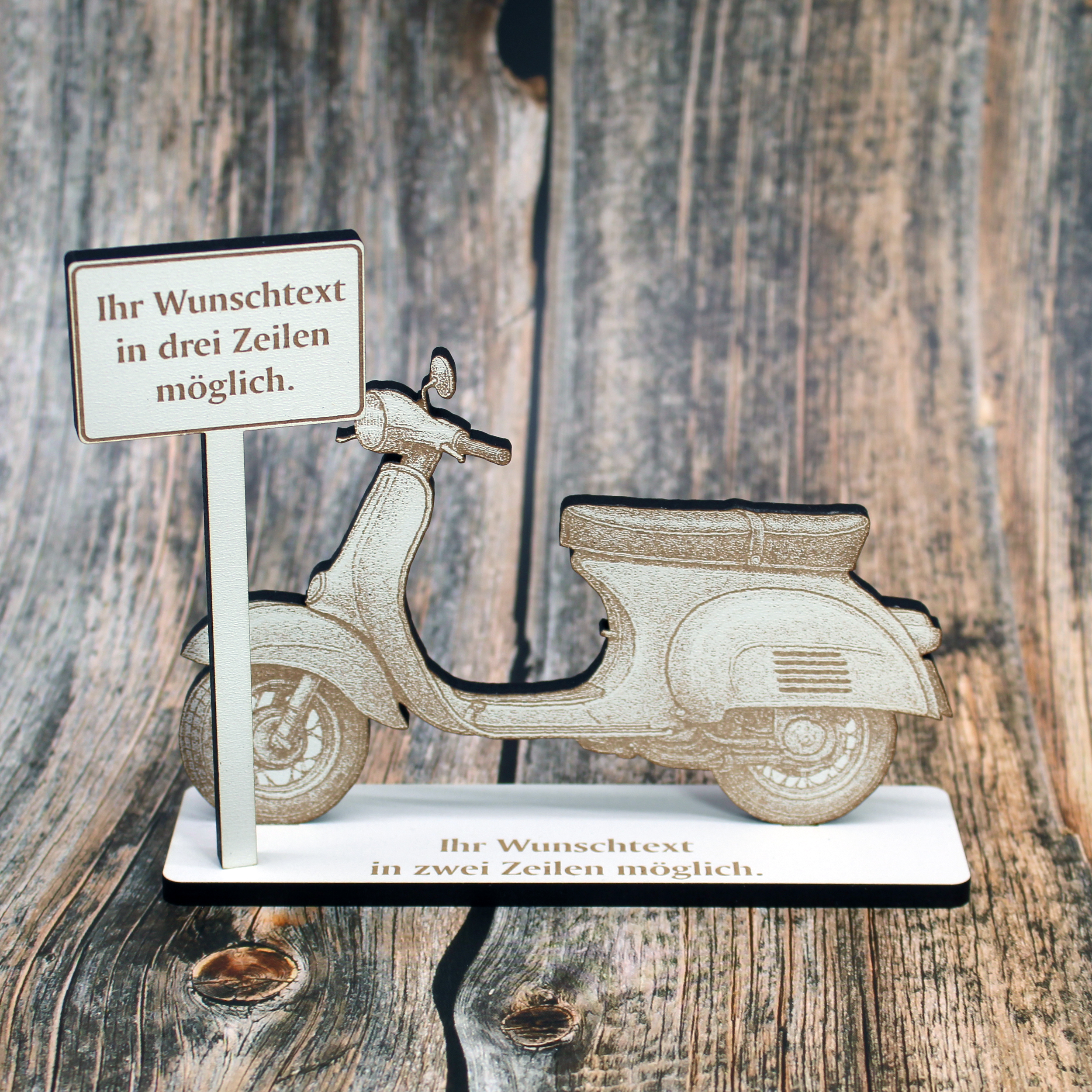 Die weiße HDF Oberfläche mit stilvoller brauner Gravur sorgt für einen markanten Retro-Look und wirkt edel in jeder Umgebung. Der zusätzliche personalisierbare Standfuß mit Wunschtext macht jedes Stück zu einem individuellen Geschenk für Fans von Retro Scooter, Oldtimer Roller oder Kult-Fahrzeugen.