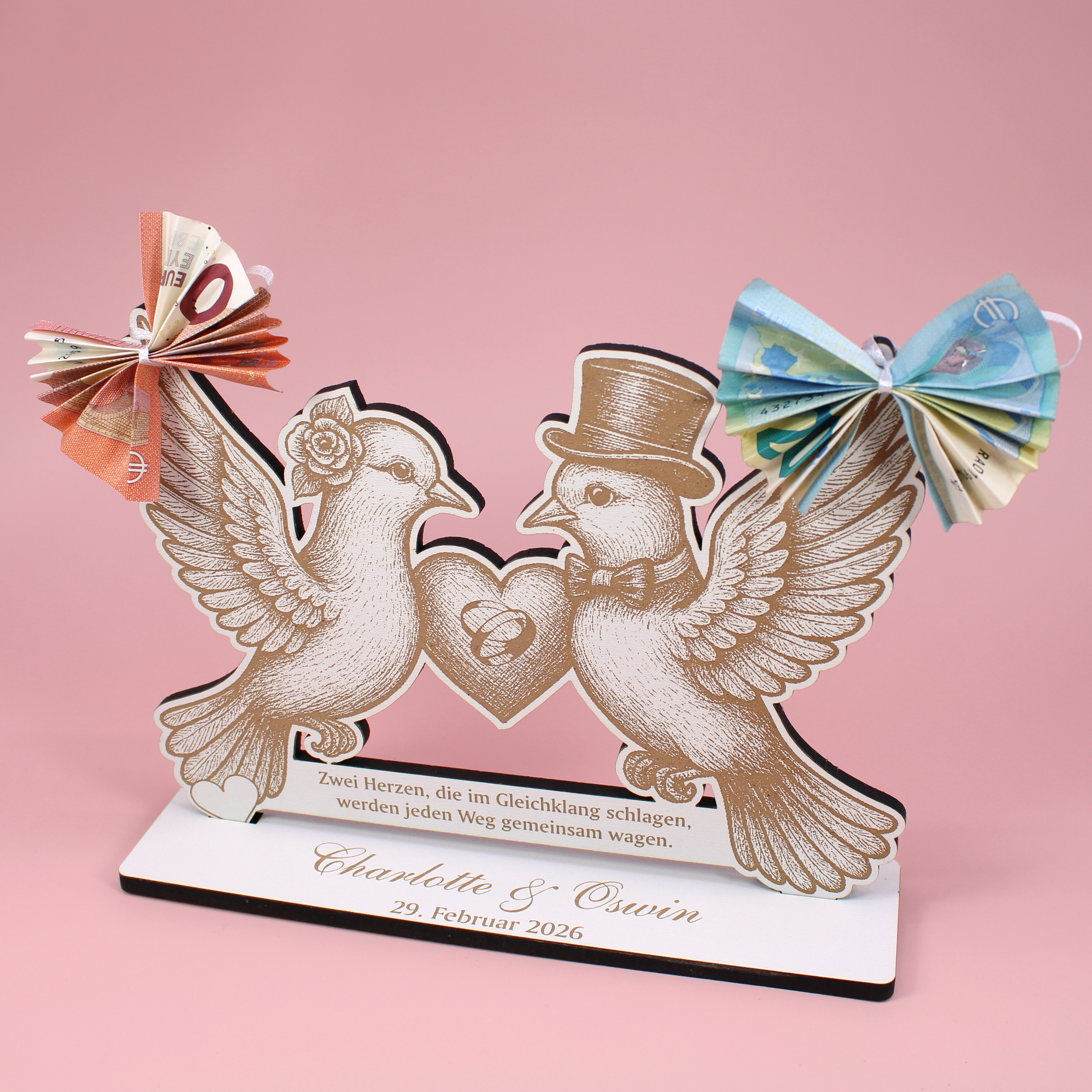 - Dekoaufsteller „Tauben Hochzeit“ – Romantischer Hochzeitsaufsteller mit zwei Tauben, Herz mit Eheringen und Gravur des Spruchs „Zwei Herzen, die im Gleichklang schlagen, werden jeden Weg gemeinsam wagen.“ – perfekt als Geldgeschenk zur Hochzeit.