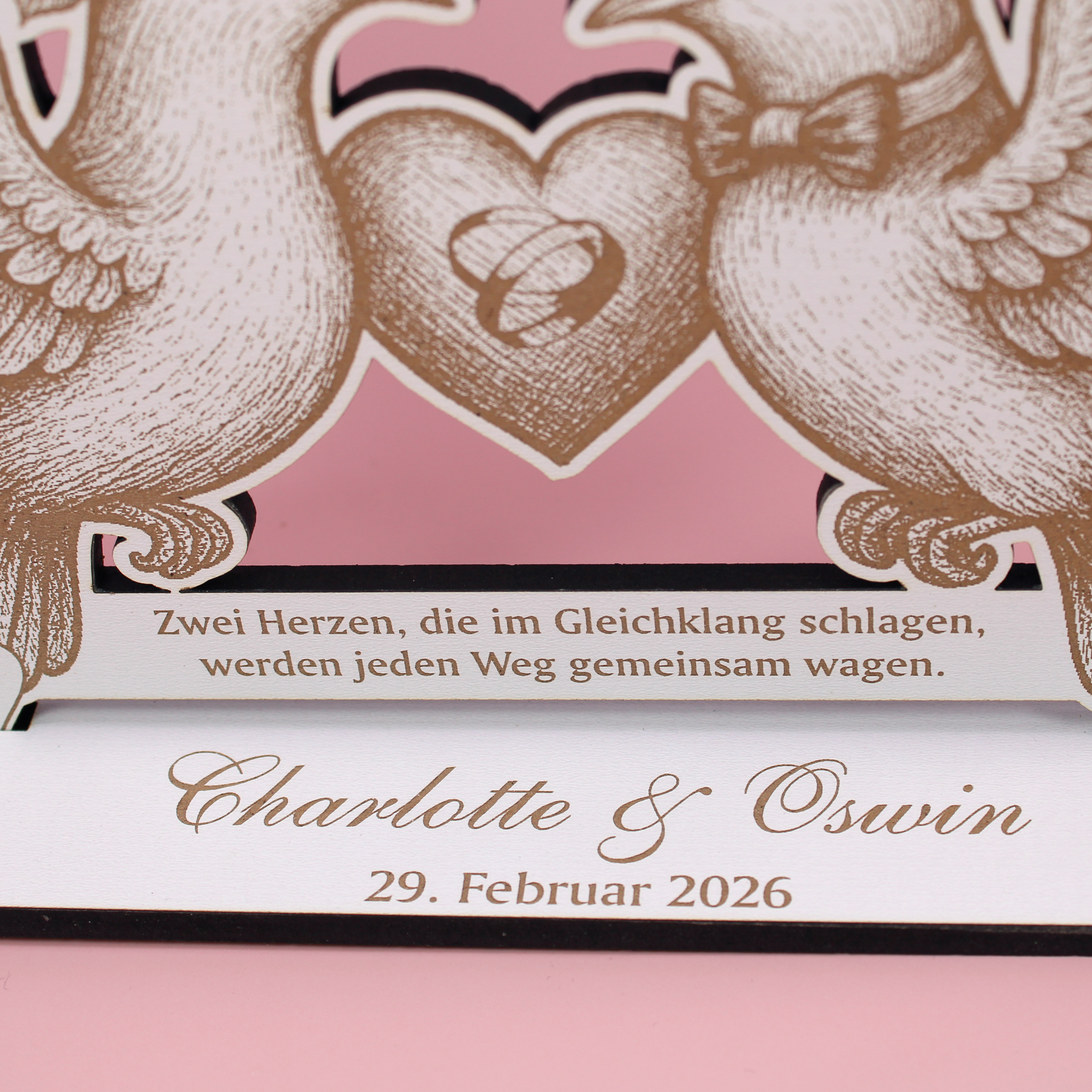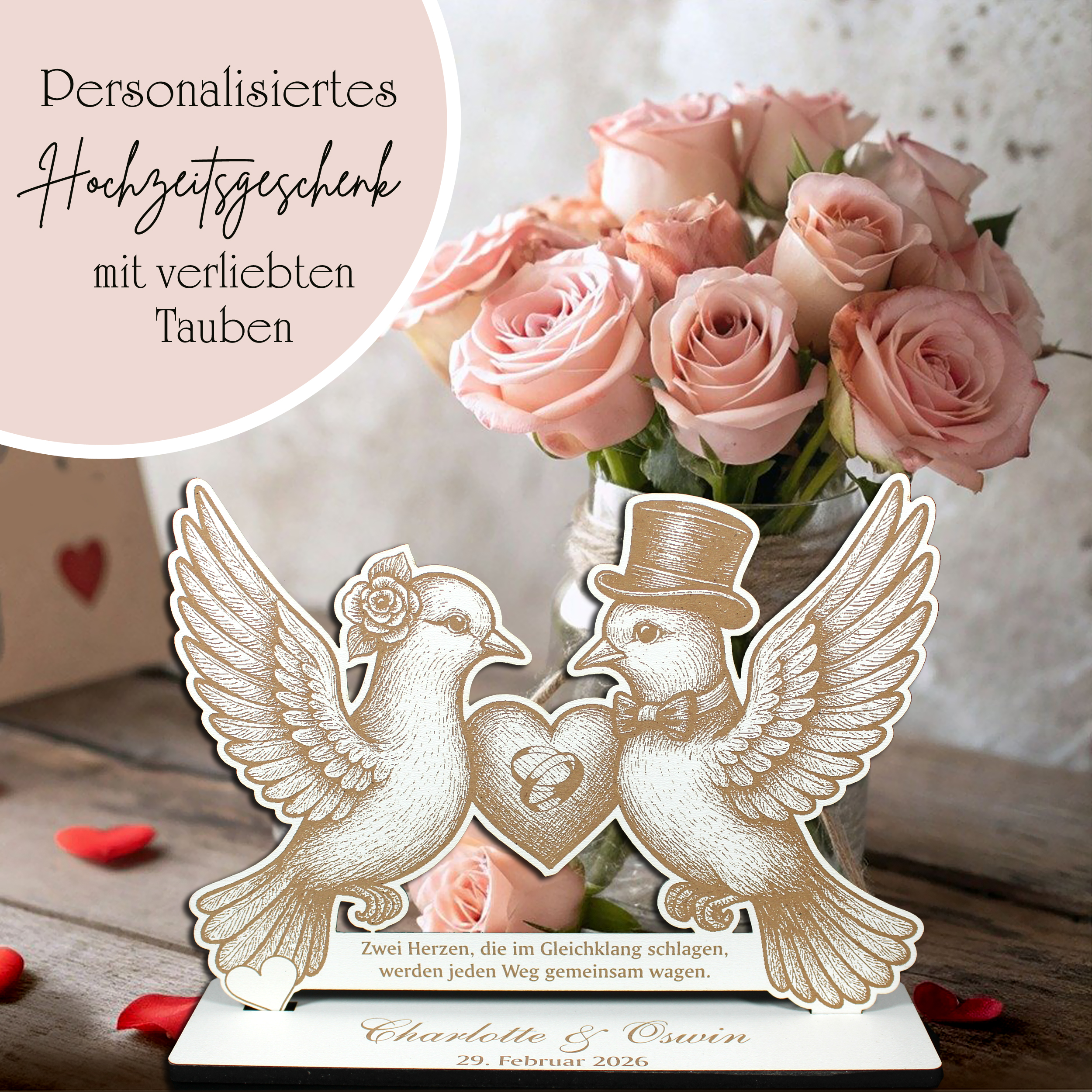 Der Sockel ist personalisierbar – wahlweise mit Namen, Hochzeitsdatum oder Widmung. So wird der Aufsteller zu einem individuellen Erinnerungsstück an den besonderen Tag. Dank der freistehenden Konstruktion eignet er sich perfekt als Tischdeko, Geschenkbeigabe oder Hochzeitsdekoration.