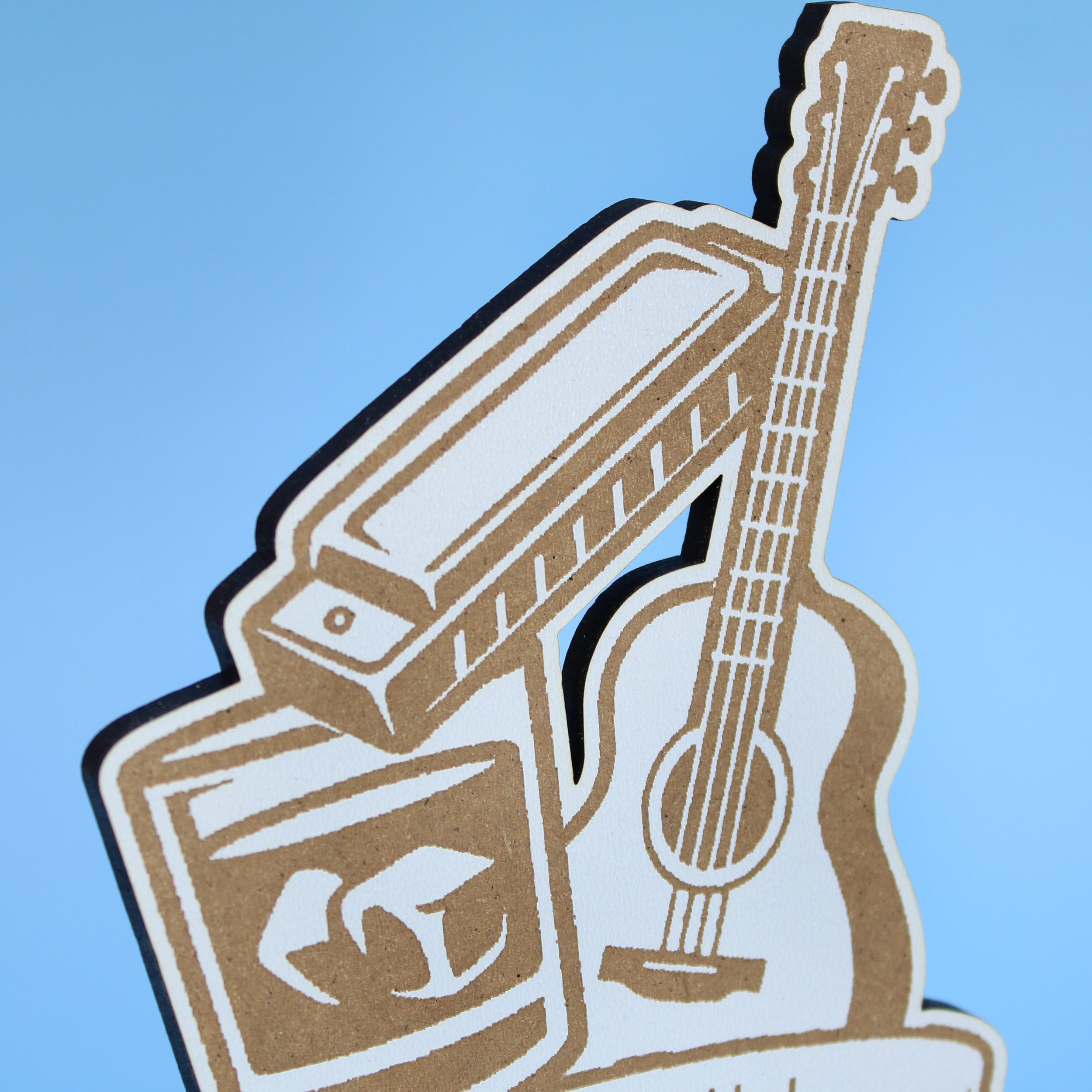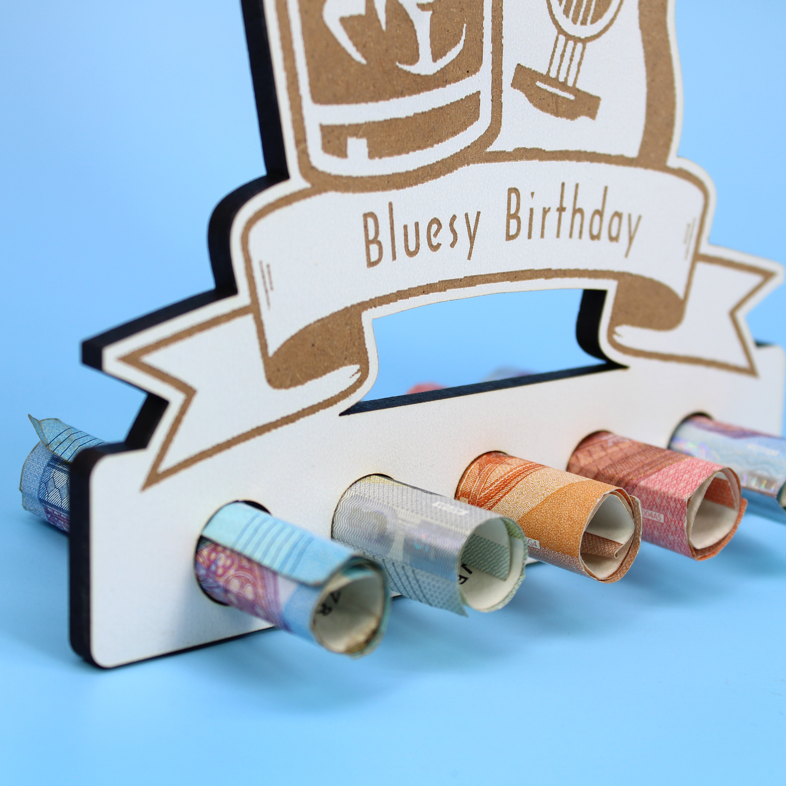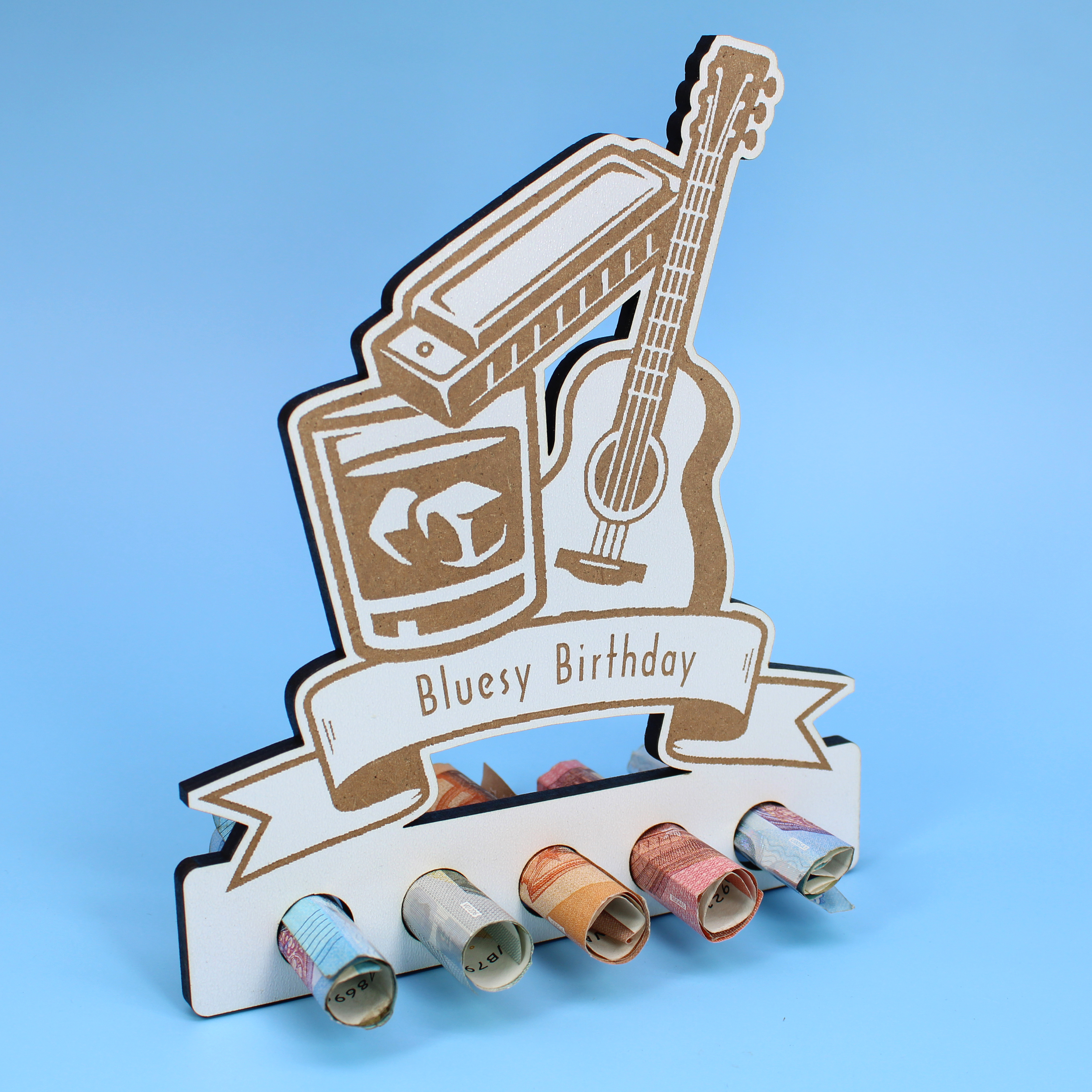 Das Geldgeschenk Blues ist das perfekte Präsent für alle Fans von Bluesmusik und Whiskeykultur. Dieses detailreiche Musikdesign zeigt eine Mundharmonika, eine Akustikgitarre und ein stilechtes Whiskeyglas – liebevoll graviert in weißes HDF mit brauner CO2-Lasergravur. Der Spruch Bluesy Birthday ergänzt das Design und sorgt für stilvolle Stimmung zum Geburtstag.