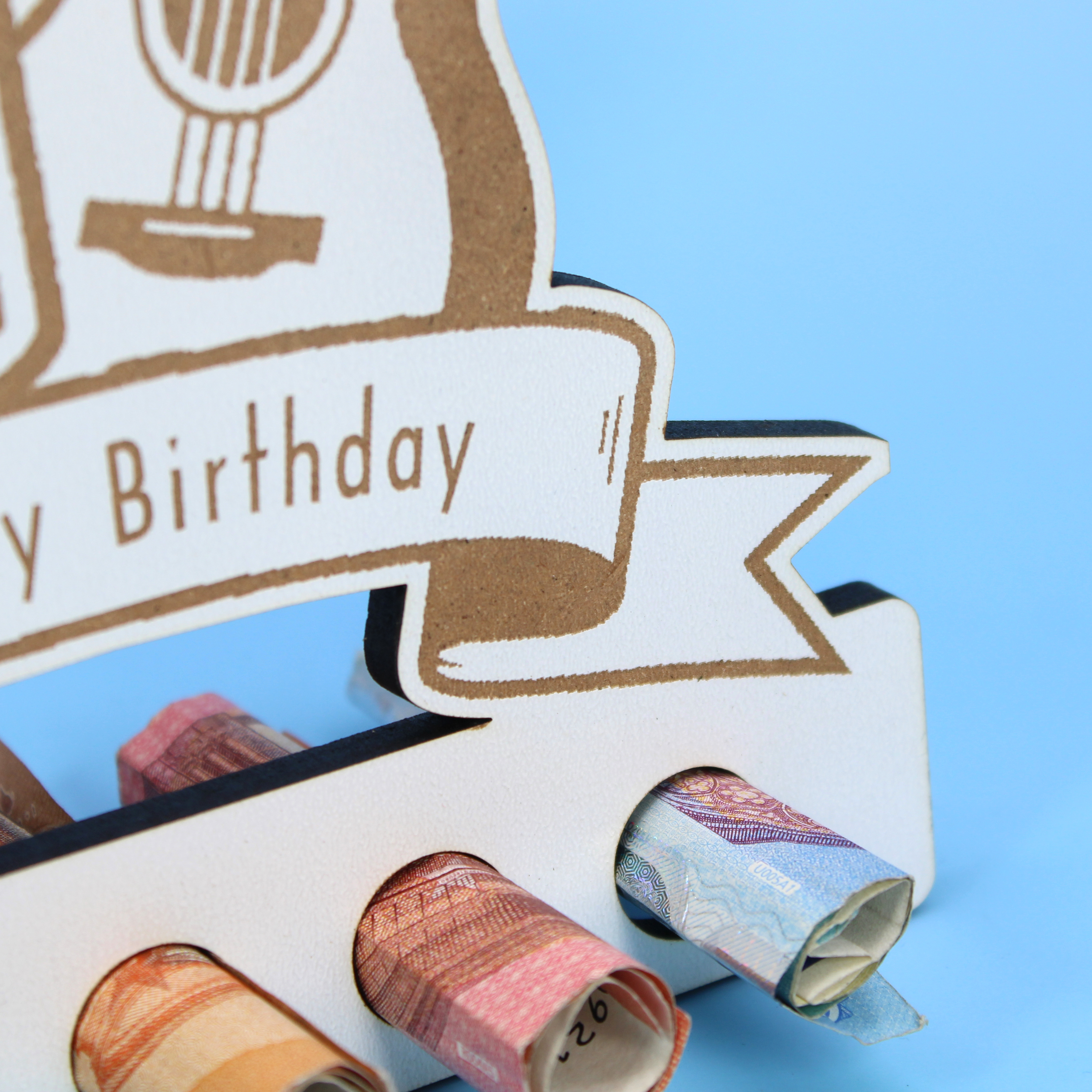 - 5 Geldschein-Halter integriert – Mit fünf runden Aussparungen für eingerollte Geldscheine oder Gutscheine – stilvolle Geschenkverpackung für Musikunterricht, Instrumentenzubehör oder Konzertbesuch.