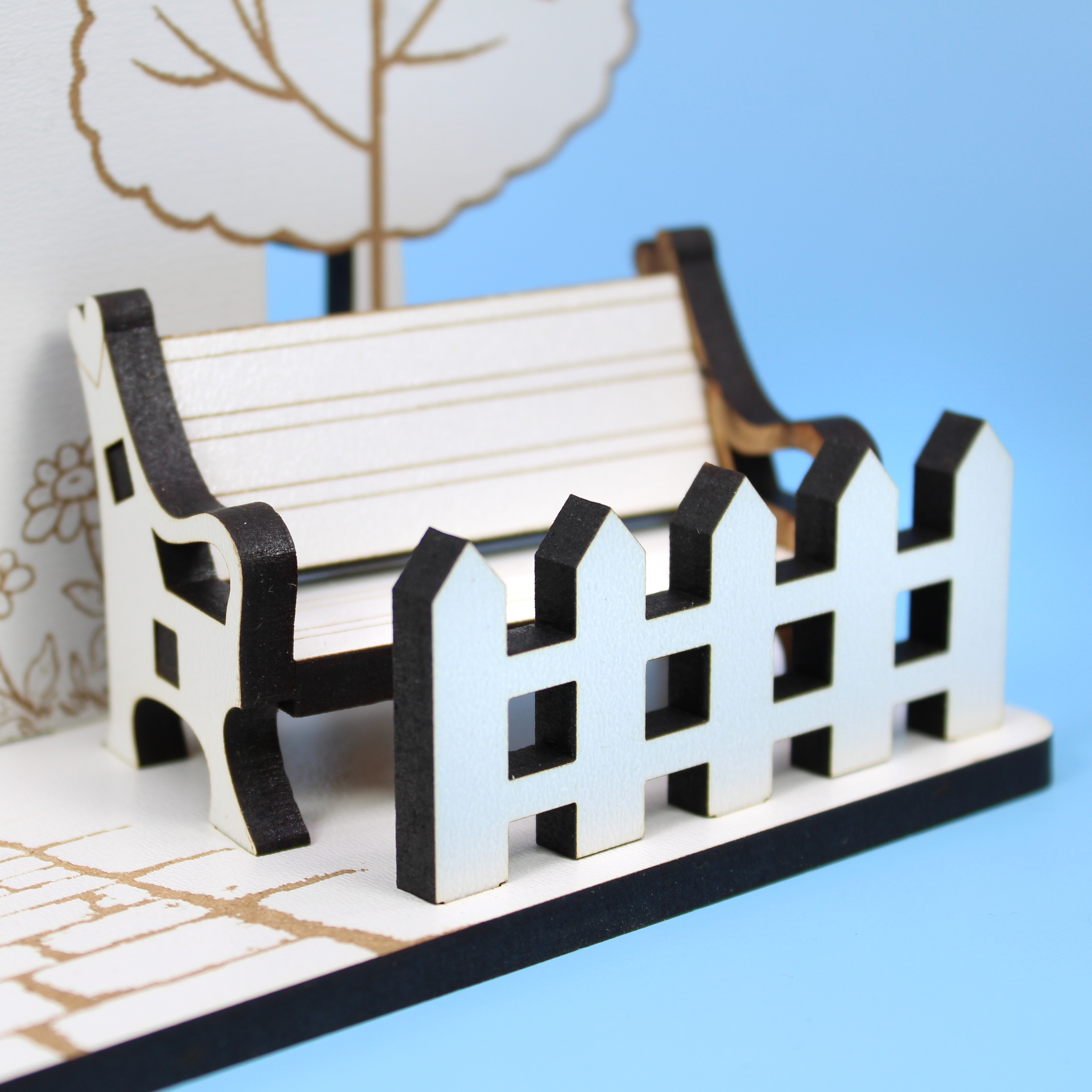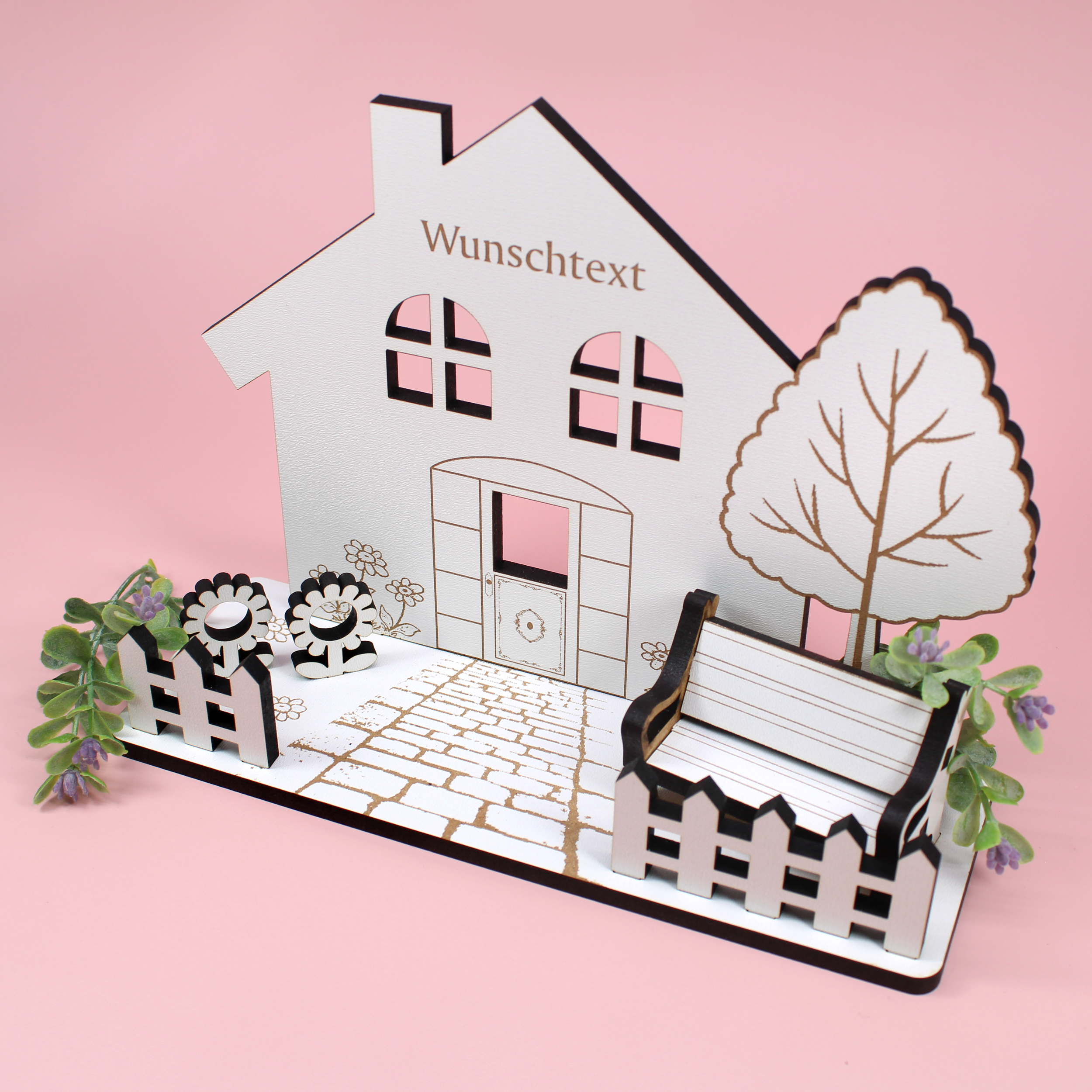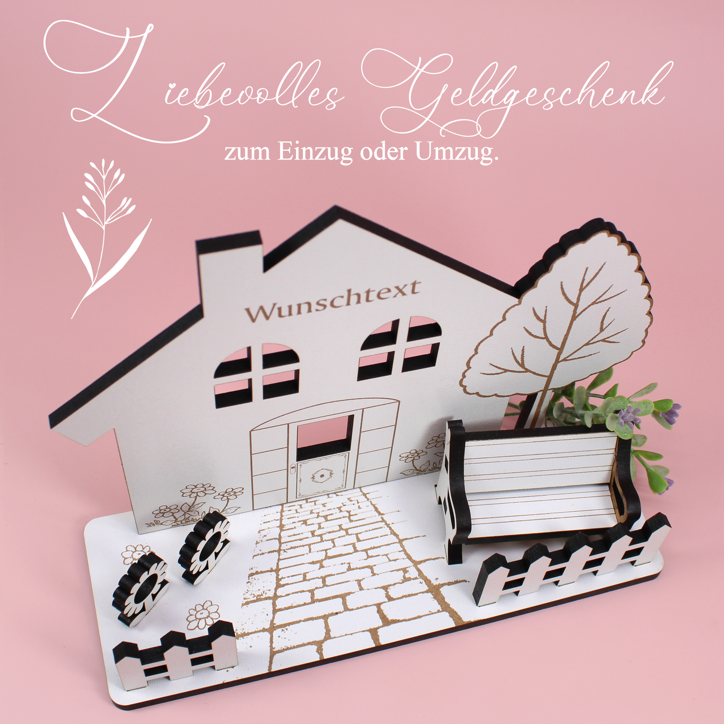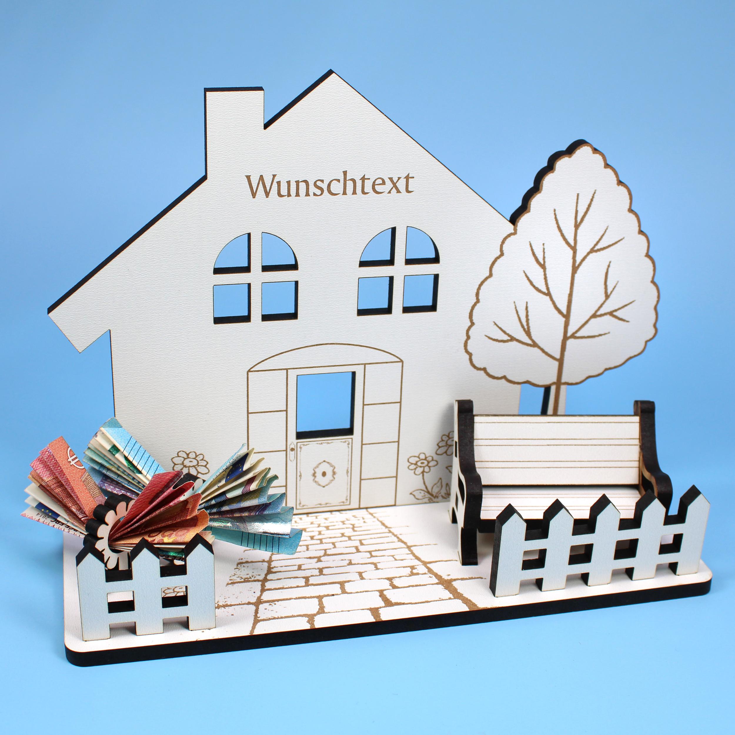 Willkommen im neuen Zuhause! Dieses liebevoll gestaltete Geldgeschenk zum Einzug oder Umzug vereint Symbolik, Design und Handwerkskunst. Das kleine Holzhaus aus hochwertigem HDF steht für Geborgenheit und Neuanfang – mit detailreicher Gravur, Baum, Gartenzaun und einer kleinen Bank wird es zu einer charmanten Miniatur-Szene, die Freude schenkt.