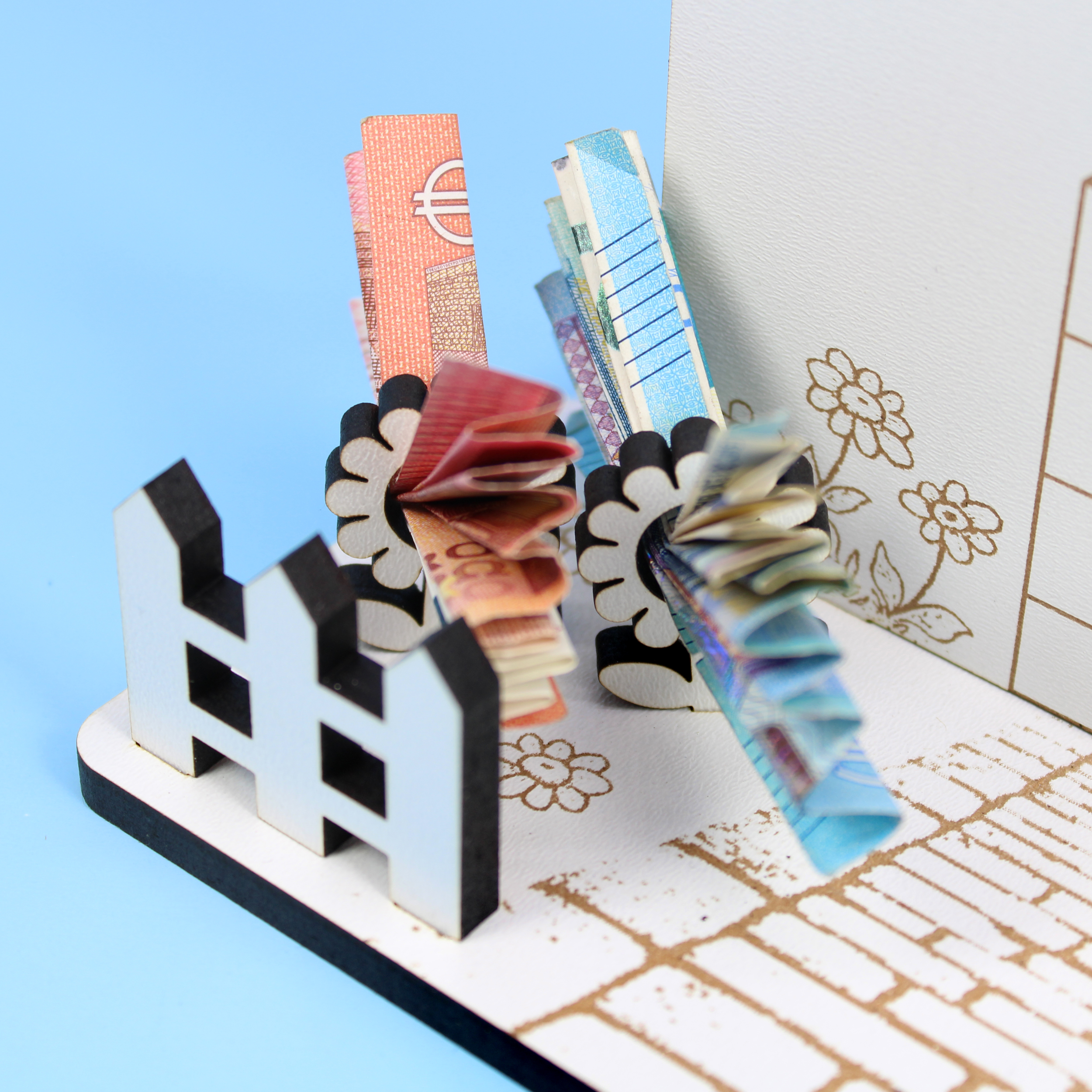 Mit einer Größe von ca. 20 × 14,5 cm lässt sich das Holzhaus perfekt dekorieren, aufstellen oder in eine Geschenkbox integrieren. Die gefalteten Geldscheine können kreativ platziert werden – für ein liebevolles und zugleich praktisches Präsent, das garantiert in Erinnerung bleibt.