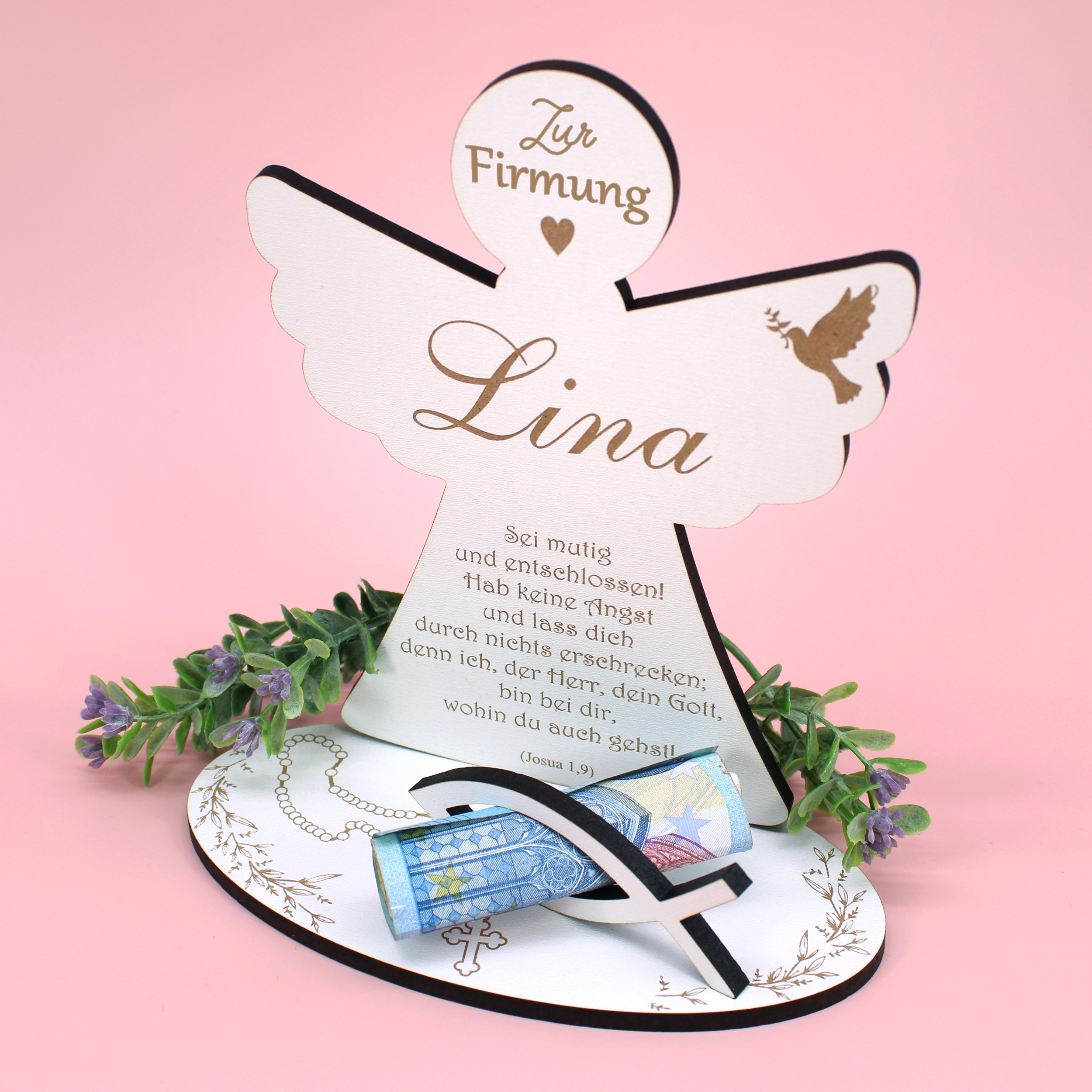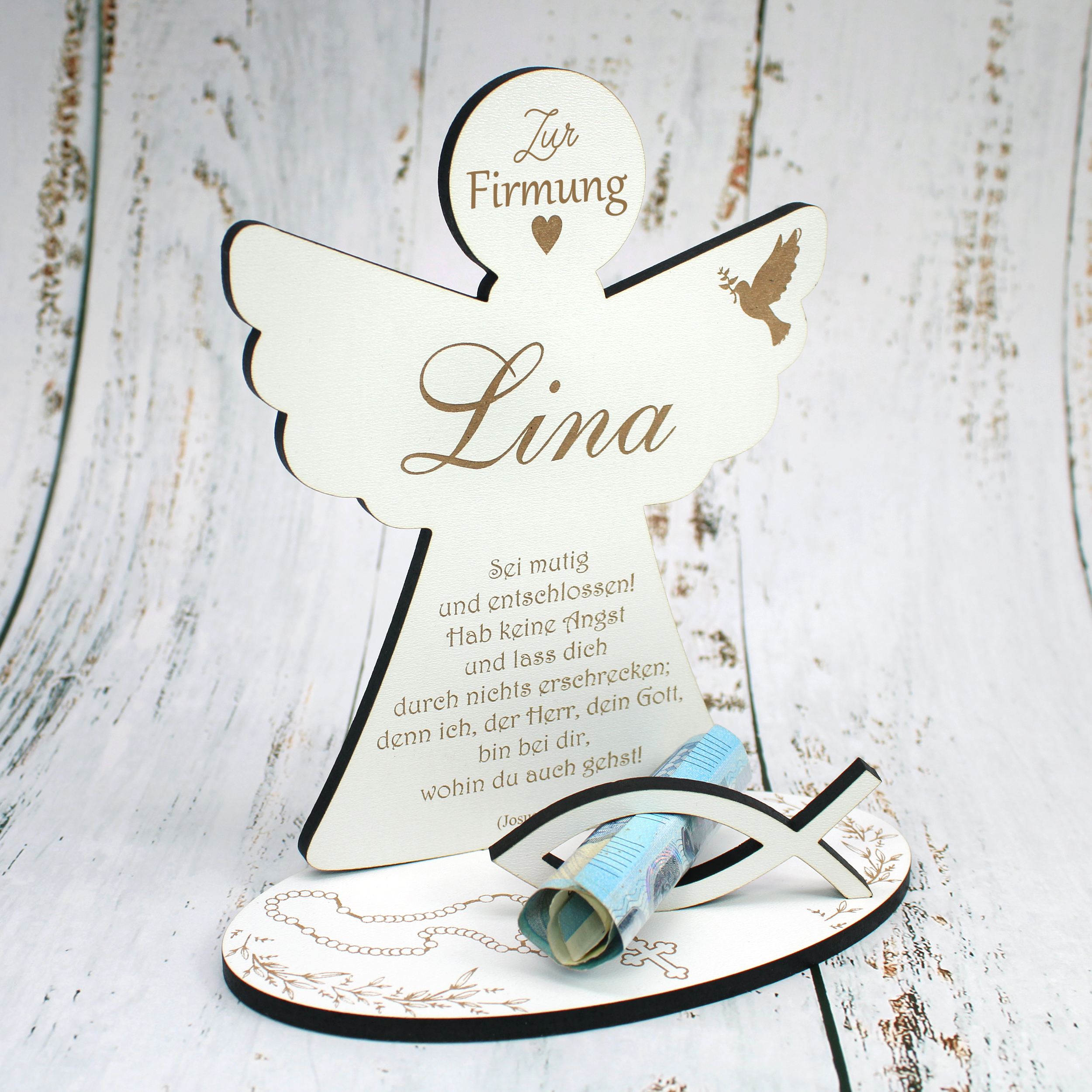 Der Engel aus HDF steht für Stärkung, Schutz und Begleitung auf dem weiteren Lebensweg. Durch die Personalisierung mit dem Namen wird jedes Geschenk individuell und einzigartig. Geldscheine oder Gutscheine können dekorativ integriert werden und machen das Geschenk besonders vielseitig.