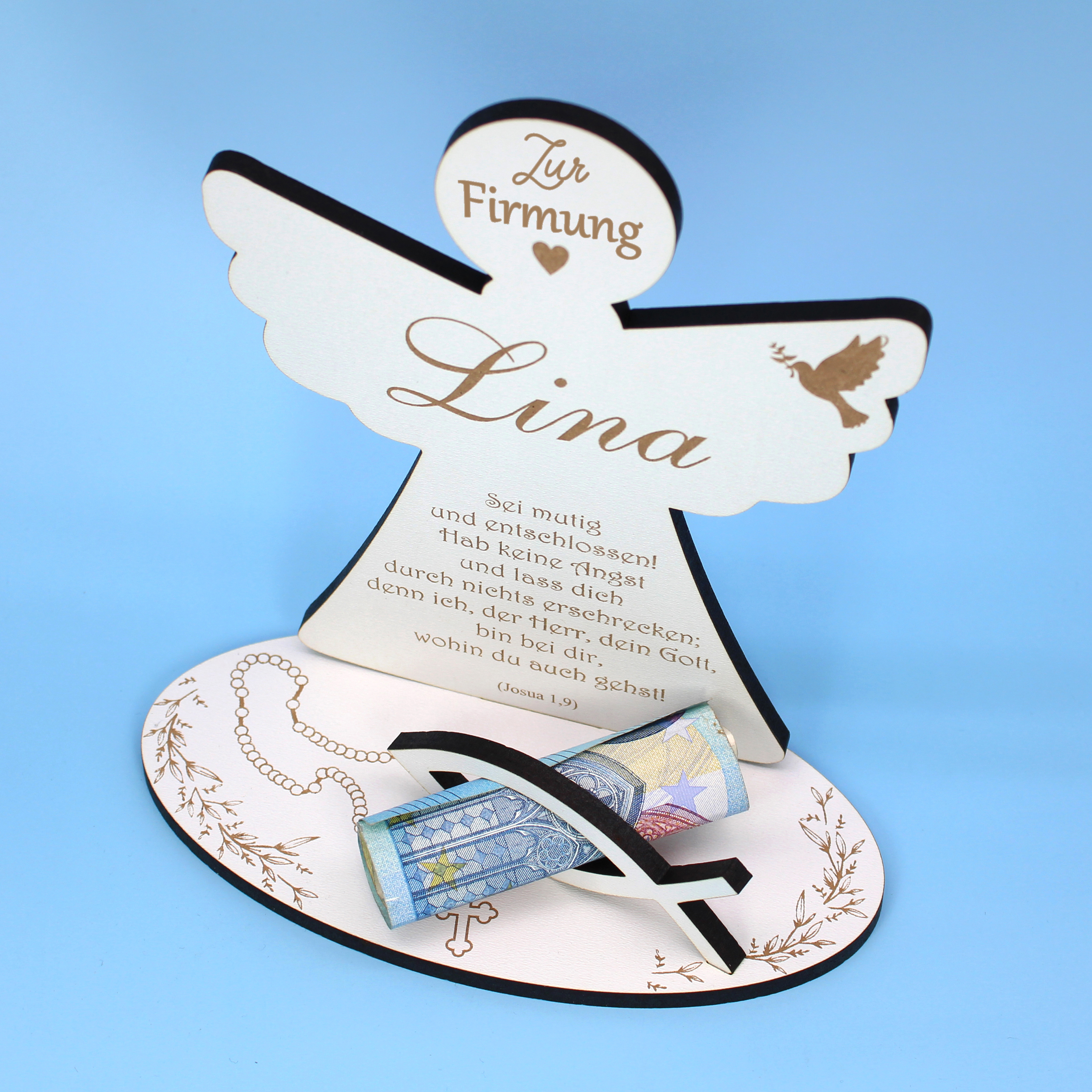 Personalisiertes Geldgeschenk zur Firmung: Dieses stilvolle Geldgeschenk zur Firmung wird individuell mit dem Namen des Firmlings personalisiert. So entsteht ein persönliches Unikat, das den besonderen Anlass würdevoll unterstreicht.