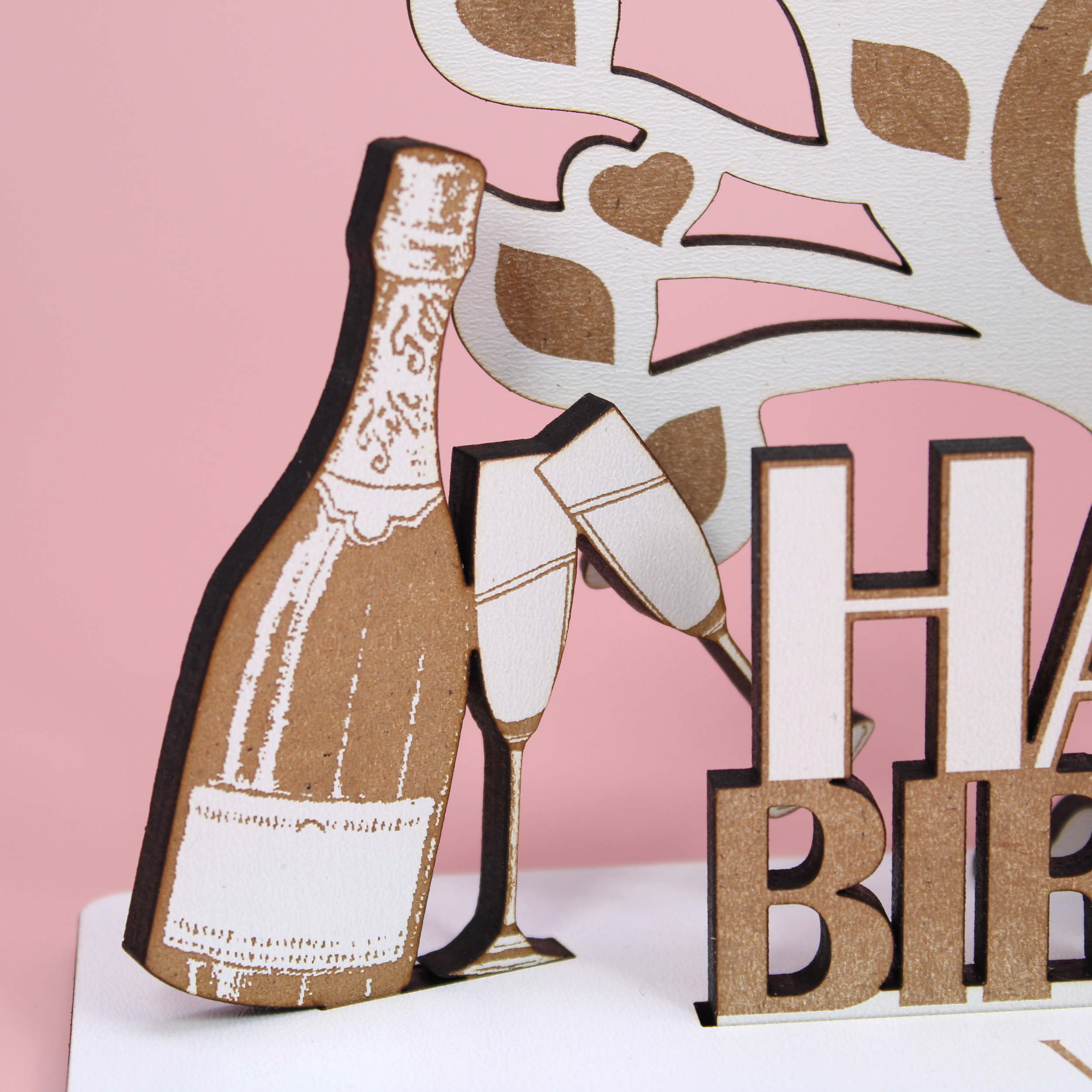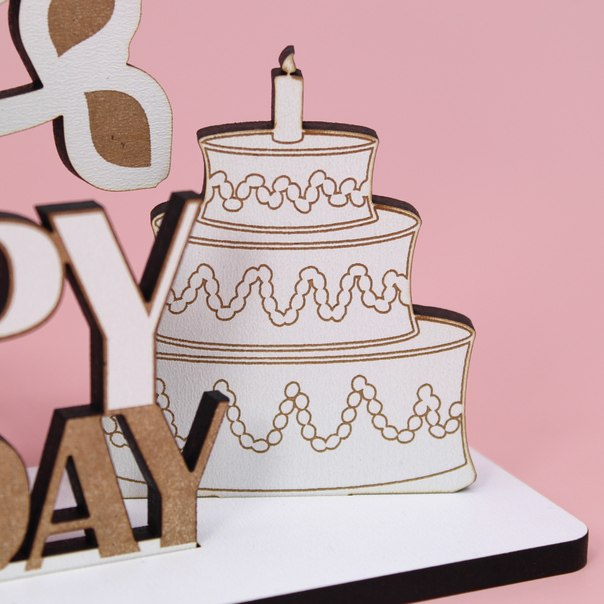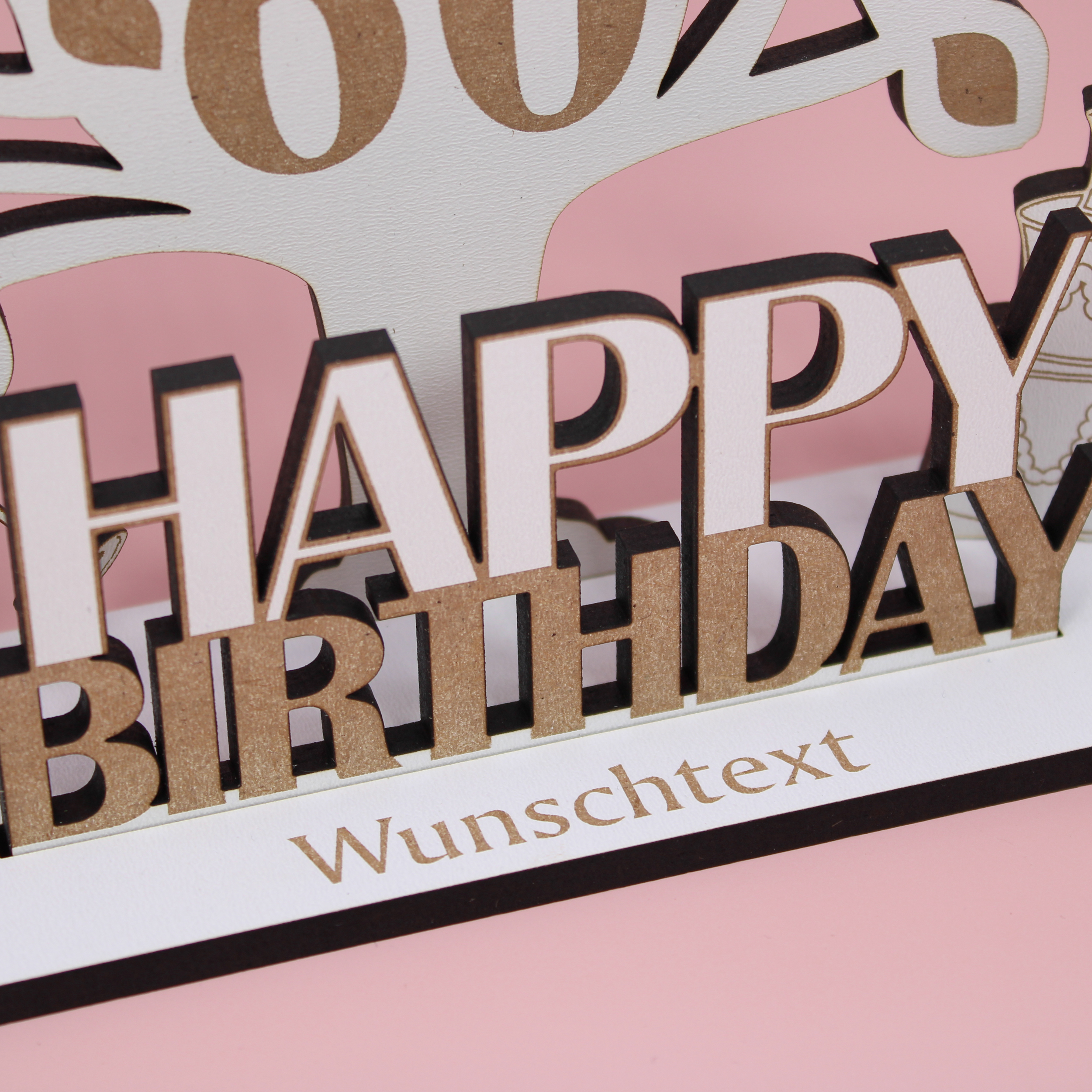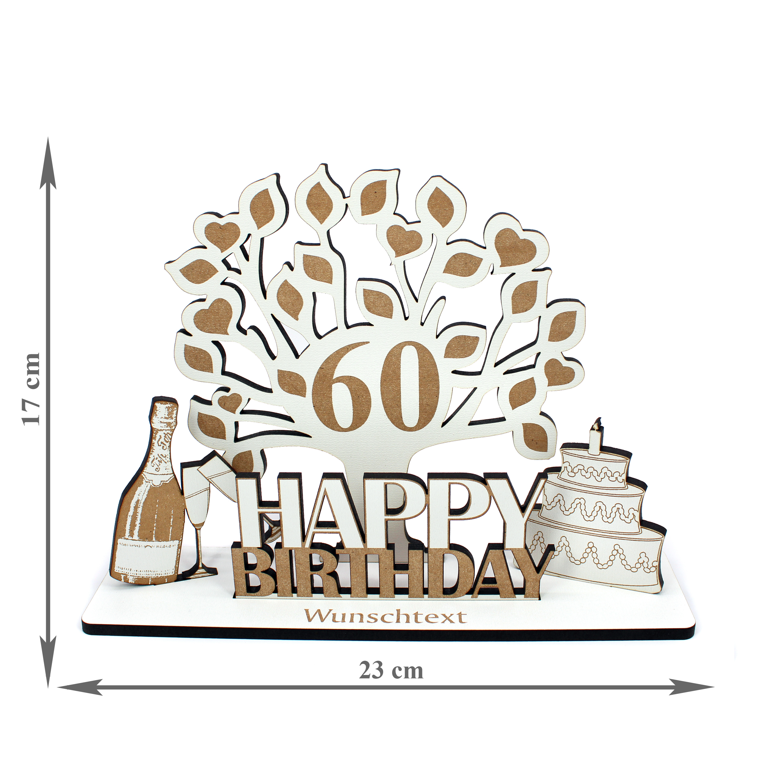 Das Geschenk wird aus stabilem HDF gefertigt und überzeugt durch hochwertige Verarbeitung sowie liebevolle Details wie Happy-Birthday-Schriftzug und dekorative Motive wie Torte und Sekt. Durch die Personalisierung mit Wunschzahl und Wunschtext entsteht ein individuelles Präsent, das perfekt auf das Geburtstagskind abgestimmt ist.