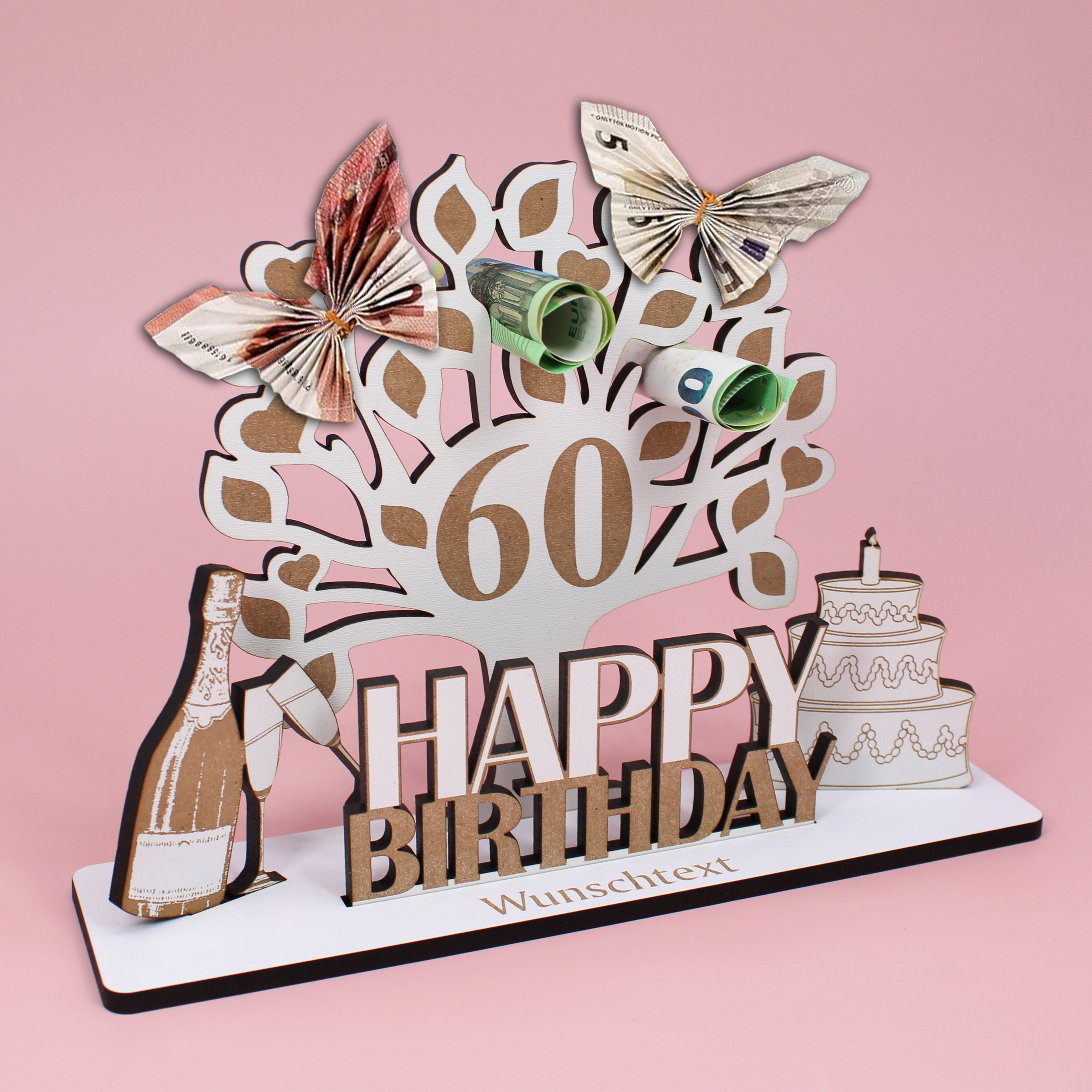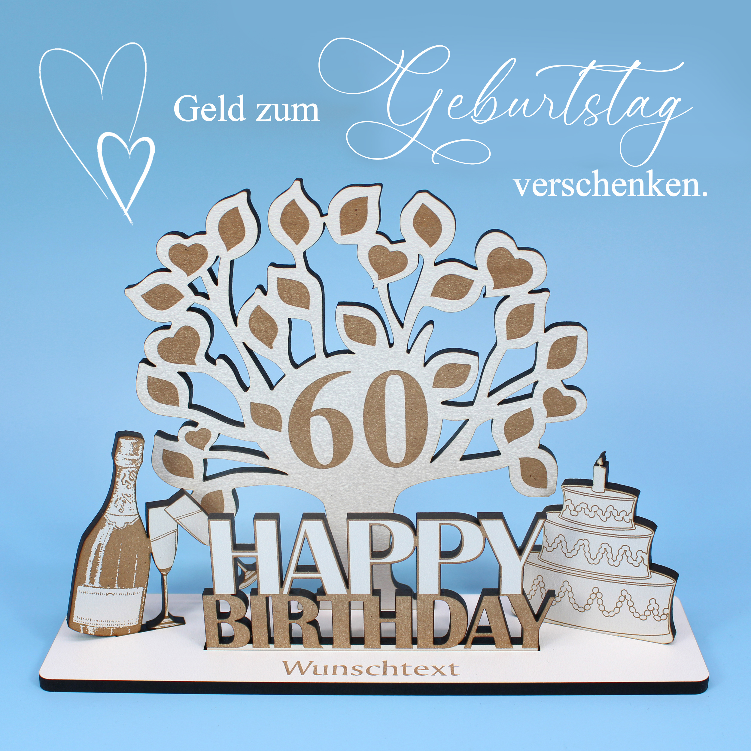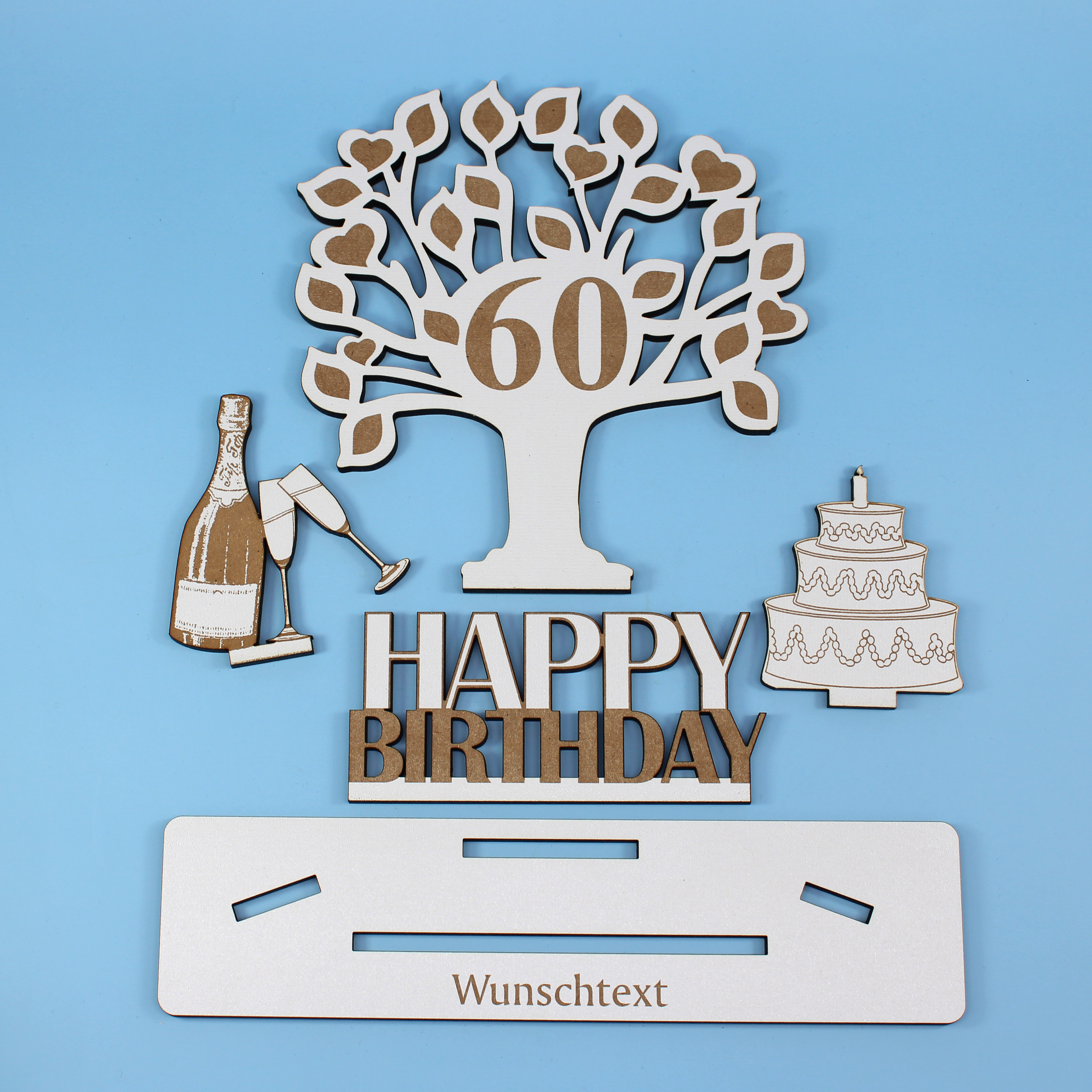 Geldgeschenk Geburtstag personalisiert - Zahl & Wunschtext - Lebensbaum Torte Sekt - Schild für Geld Gutschein 23x17 cm