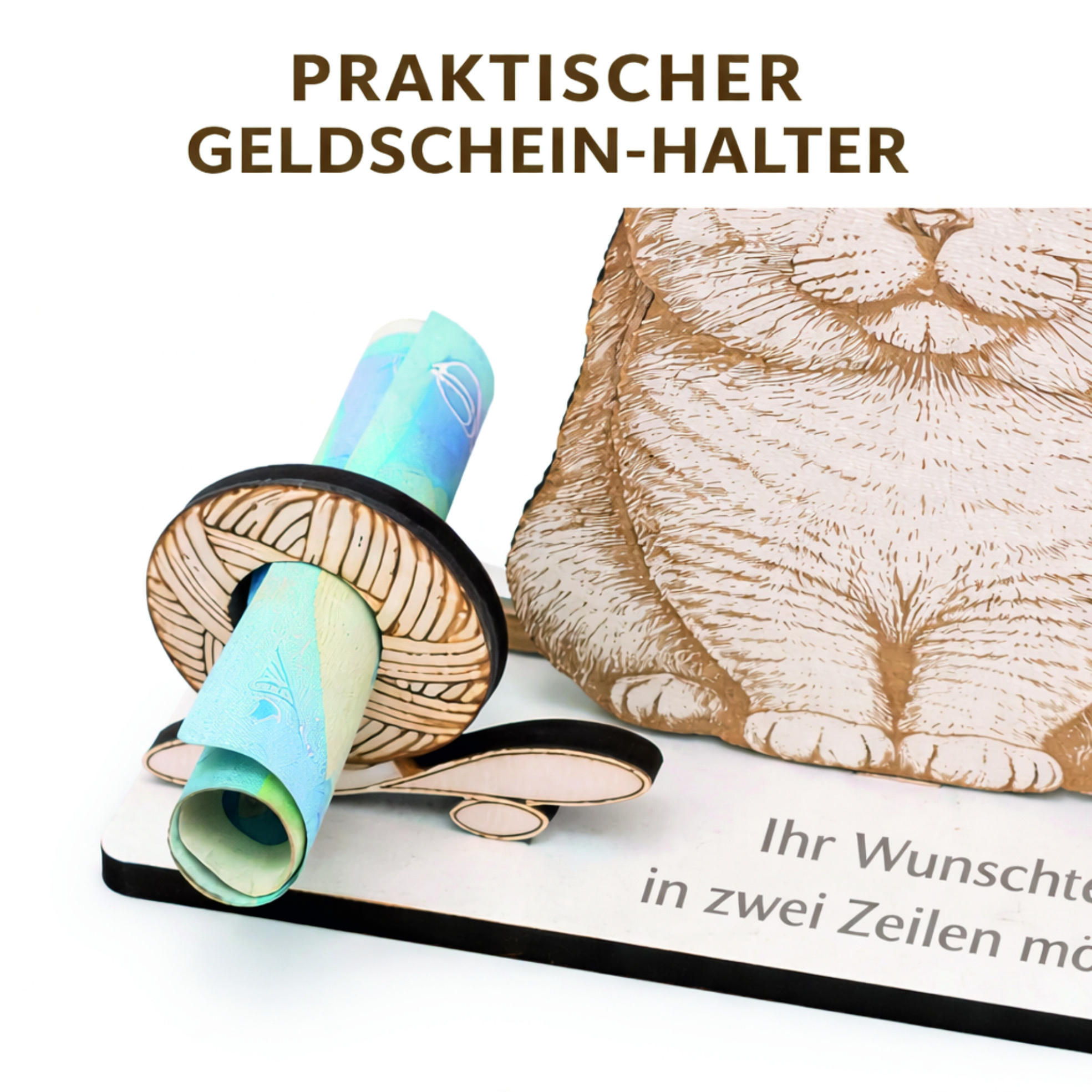 Ob zum Geburtstag, zum Einzug, zu Weihnachten oder einfach als kleine Überraschung: Der dekorative Aufsteller verbindet praktischen Nutzen mit emotionalem Wert. Geldscheine lassen sich stilvoll integrieren und werden Teil des Designs.