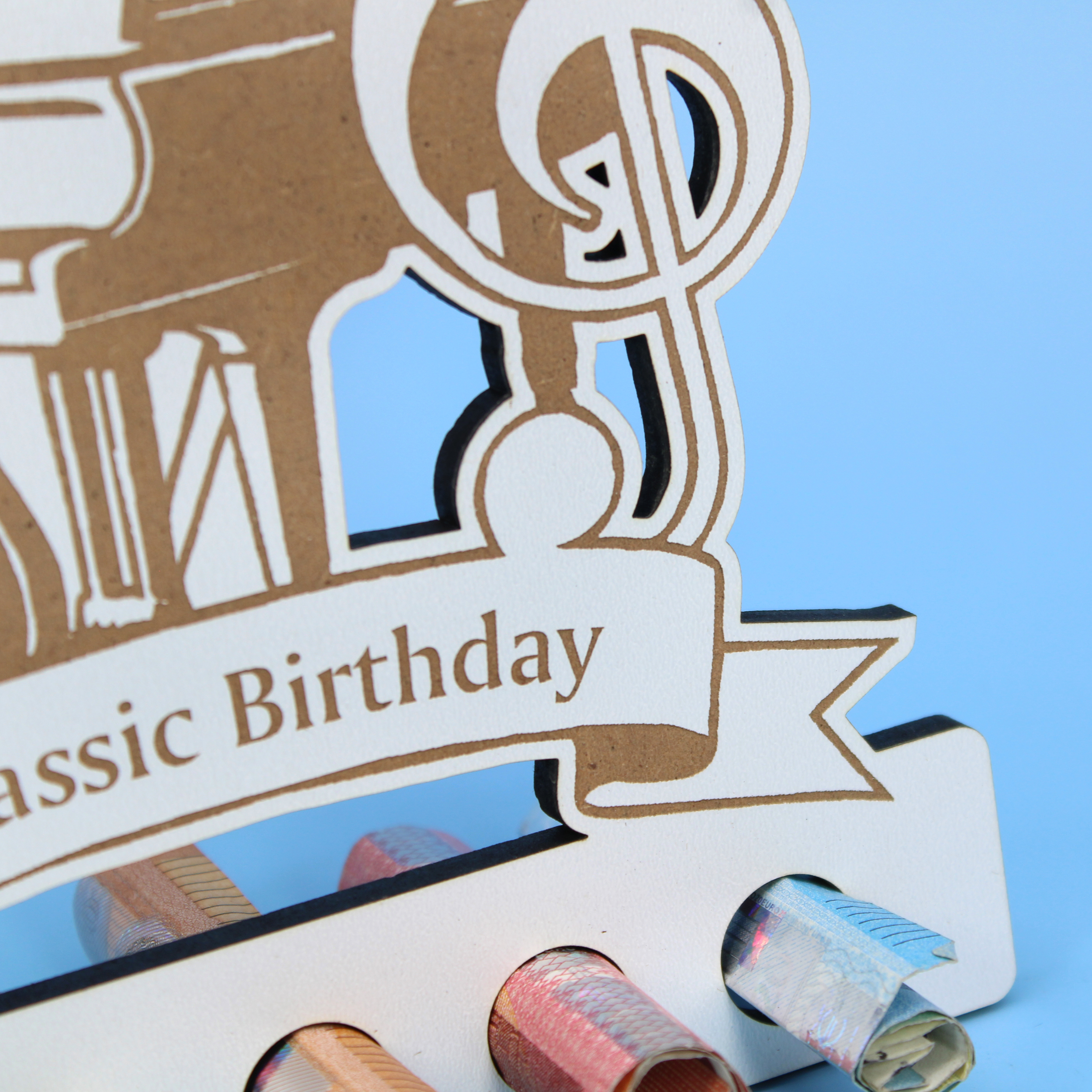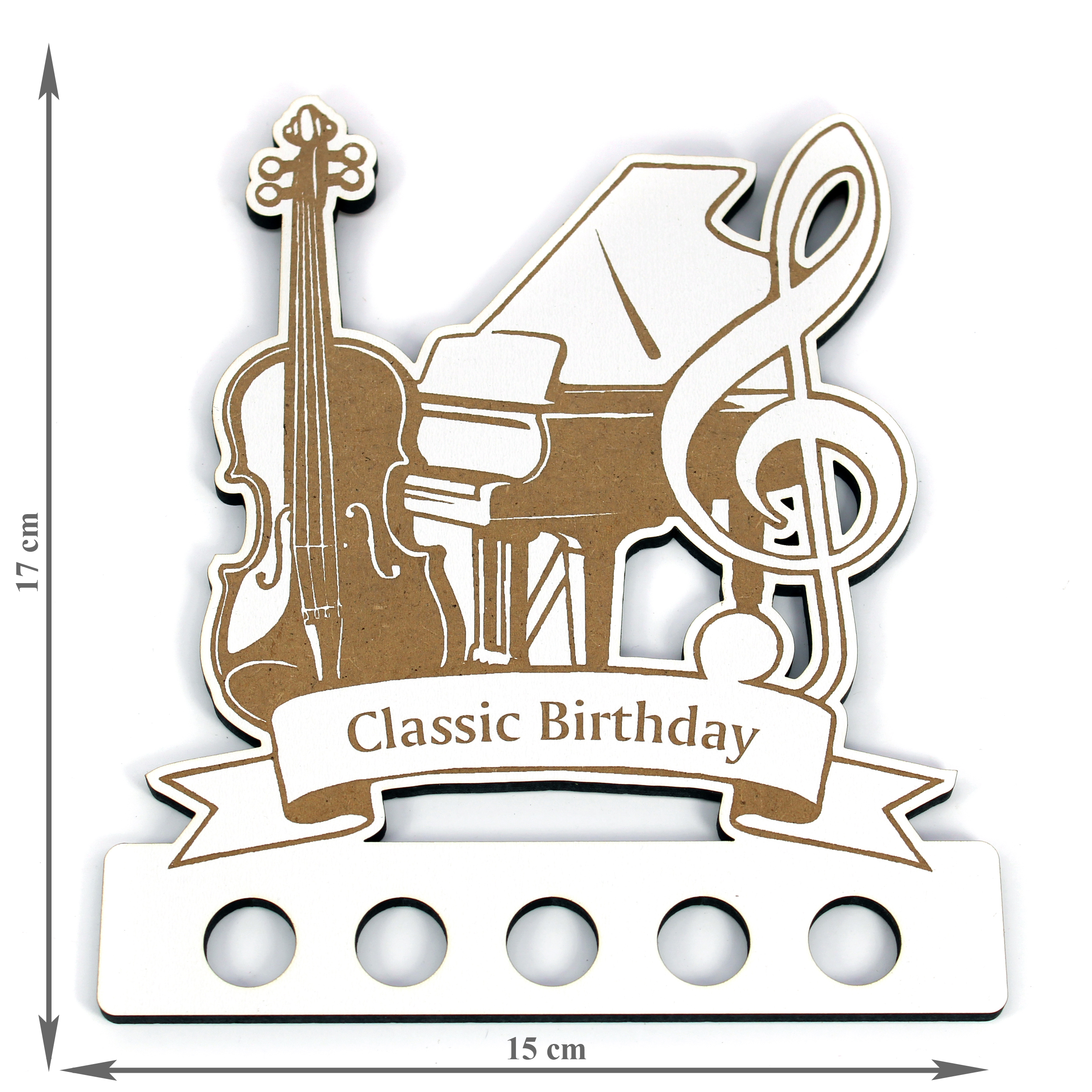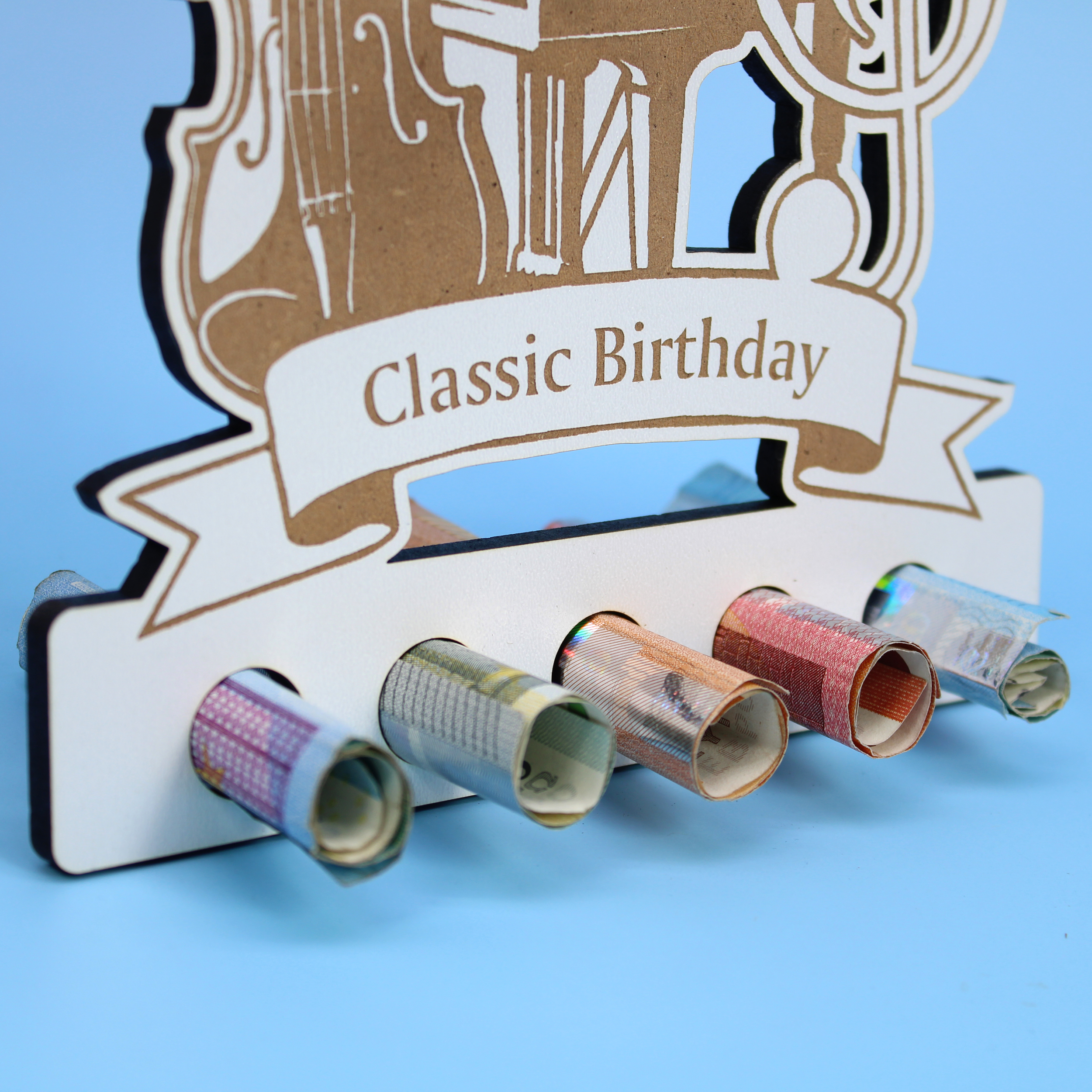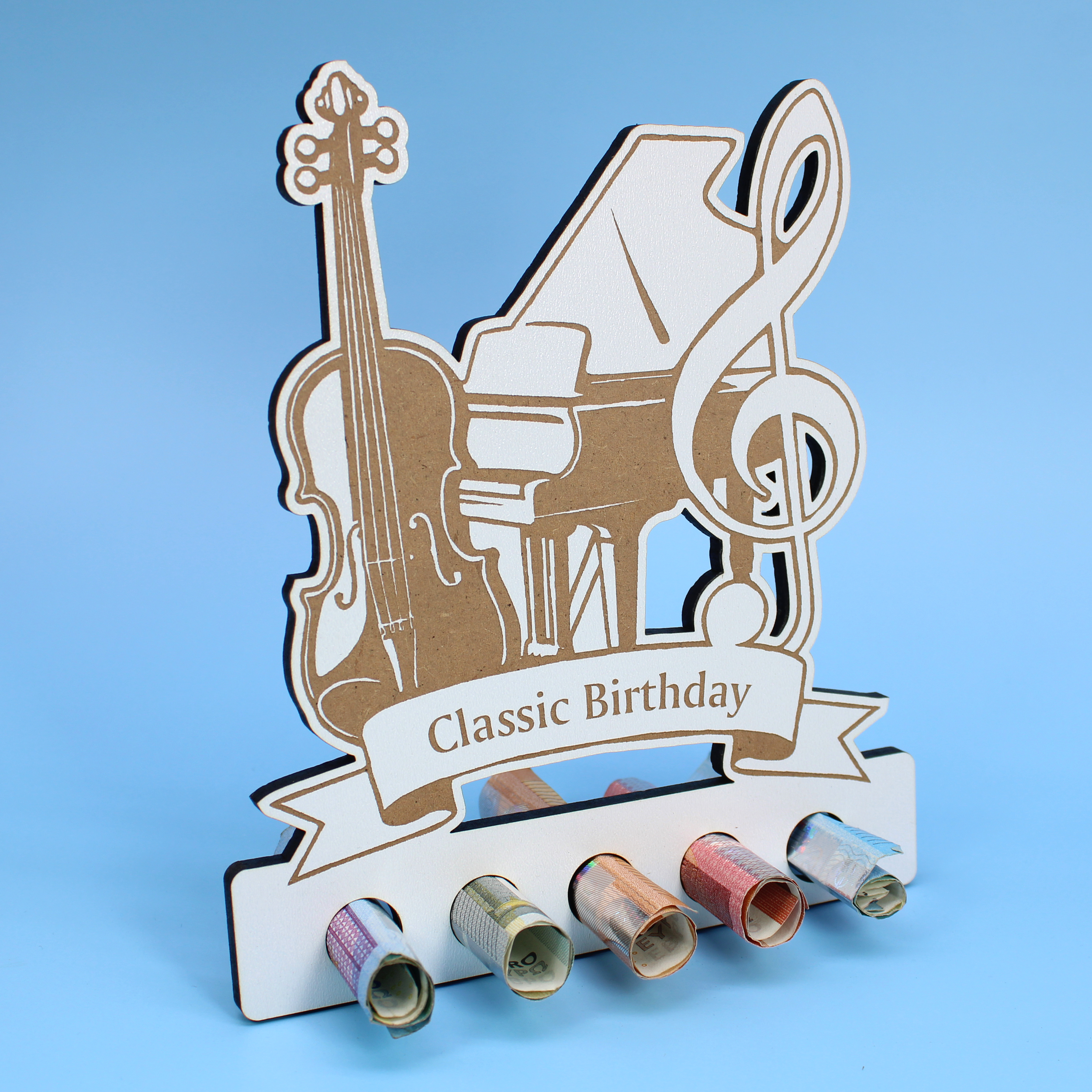 Aus weiß beschichtetem HDF mit brauner Lasergravur gefertigt, überzeugt das Design durch feine Konturen, klare Linien und hochwertige Verarbeitung. Fünf integrierte Halterungen bieten Platz für eingerollte Geldscheine oder kleine Gutscheine – perfekt für musikalische Geburtstagsüberraschungen, Konzertbesuche oder Unterrichtsstunden.