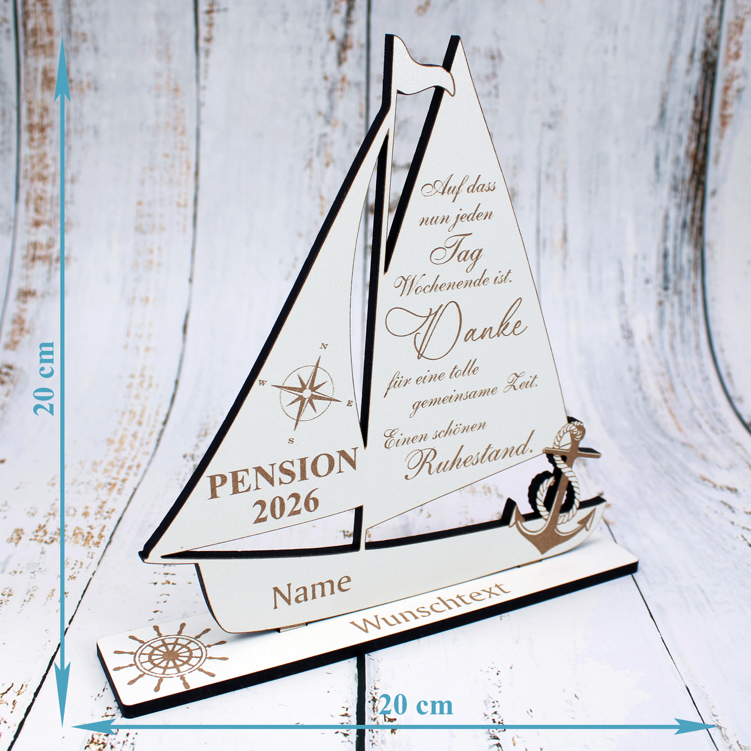Personalisiert mit Name, Zahl & Wunschtext: Das Segelboot wird individuell mit Namen sowie Ihrem persönlichen Wunschtext graviert. So entsteht ein einzigartiges Erinnerungsstück an einen besonderen Meilenstein.