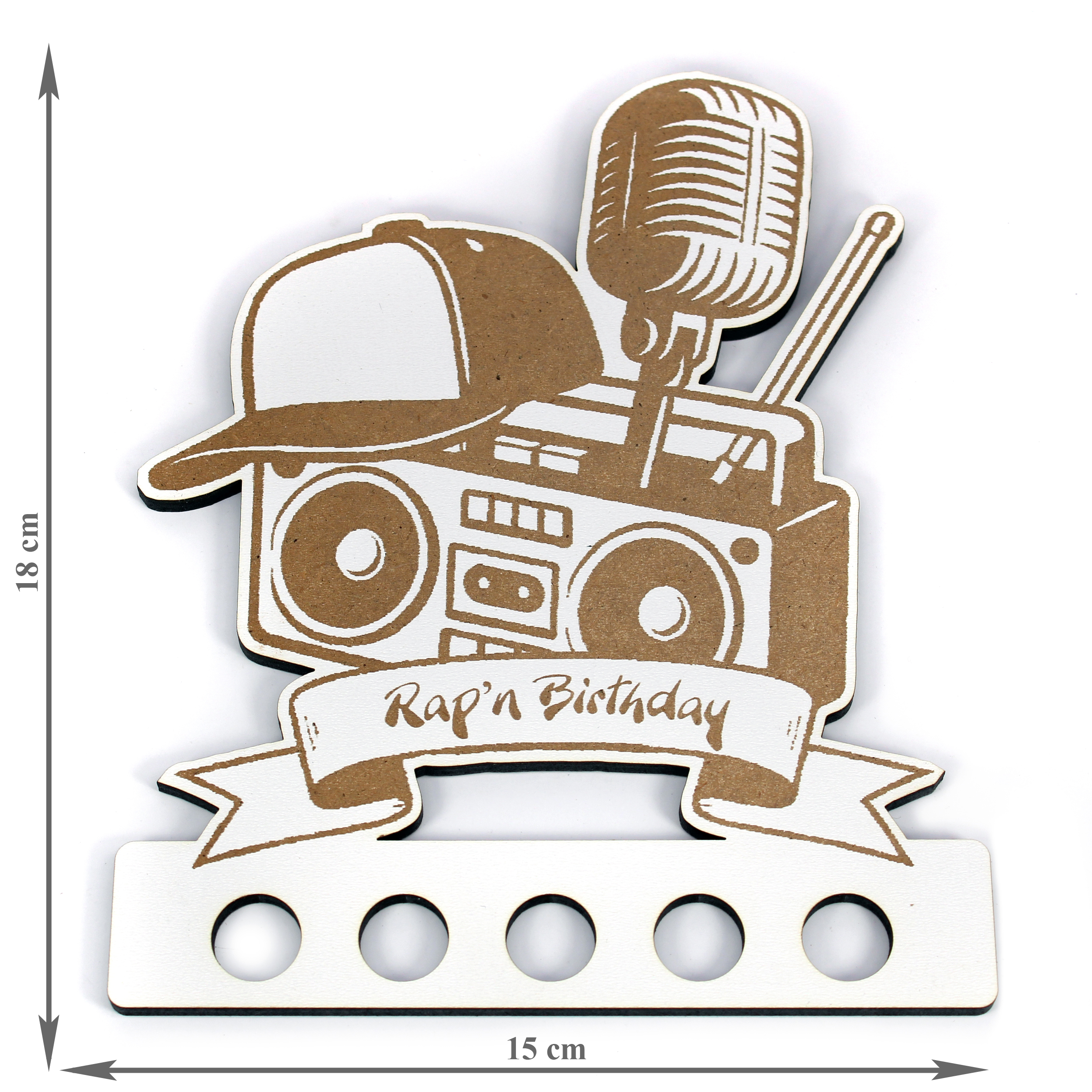 Das Motiv zeigt zentrale Hip-Hop Symbole: Mikrofon, angesagte Cap und ein klassischer Ghettoblaster – alles fein und hochwertig in brauner CO₂-Lasergravur auf weißem HDF ausgearbeitet. Der eingravierte Spruch Rap’n Birthday bringt den urbanen Vibe perfekt auf den Punkt und verleiht dem Geschenk eine persönliche Botschaft.