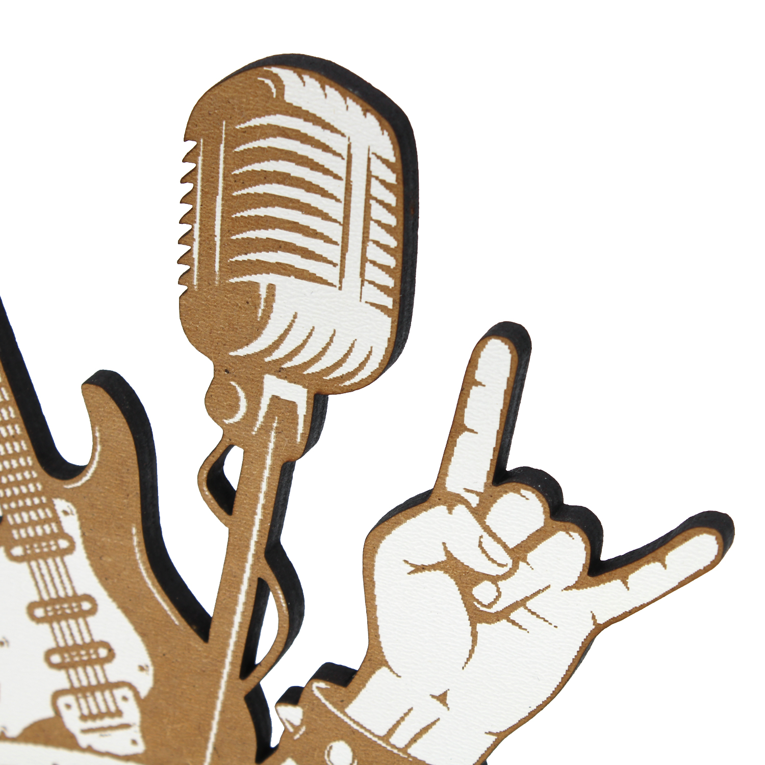 - Material aus Holz: HDF (hochdichte Faserplatte) sorgt für Stabilität und eine edle Optik. Die präzise Gravur hebt jedes Detail - Gitarre, Mikrofon & Rockerhand - wunderbar hervor.