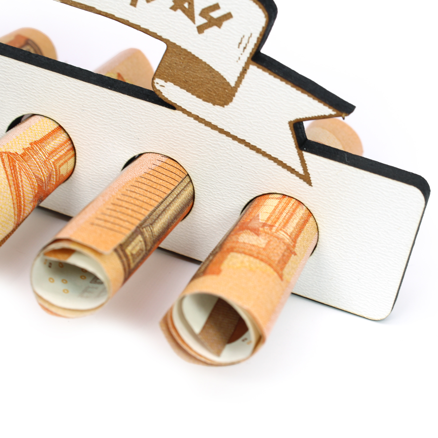 Geldscheine oder Gutscheine können einfach zusammengerollt in die Halterung gesteckt werden. So wird aus einem einfachen Geldgeschenk ein absoluter Hingucker mit persönlichem Charme.