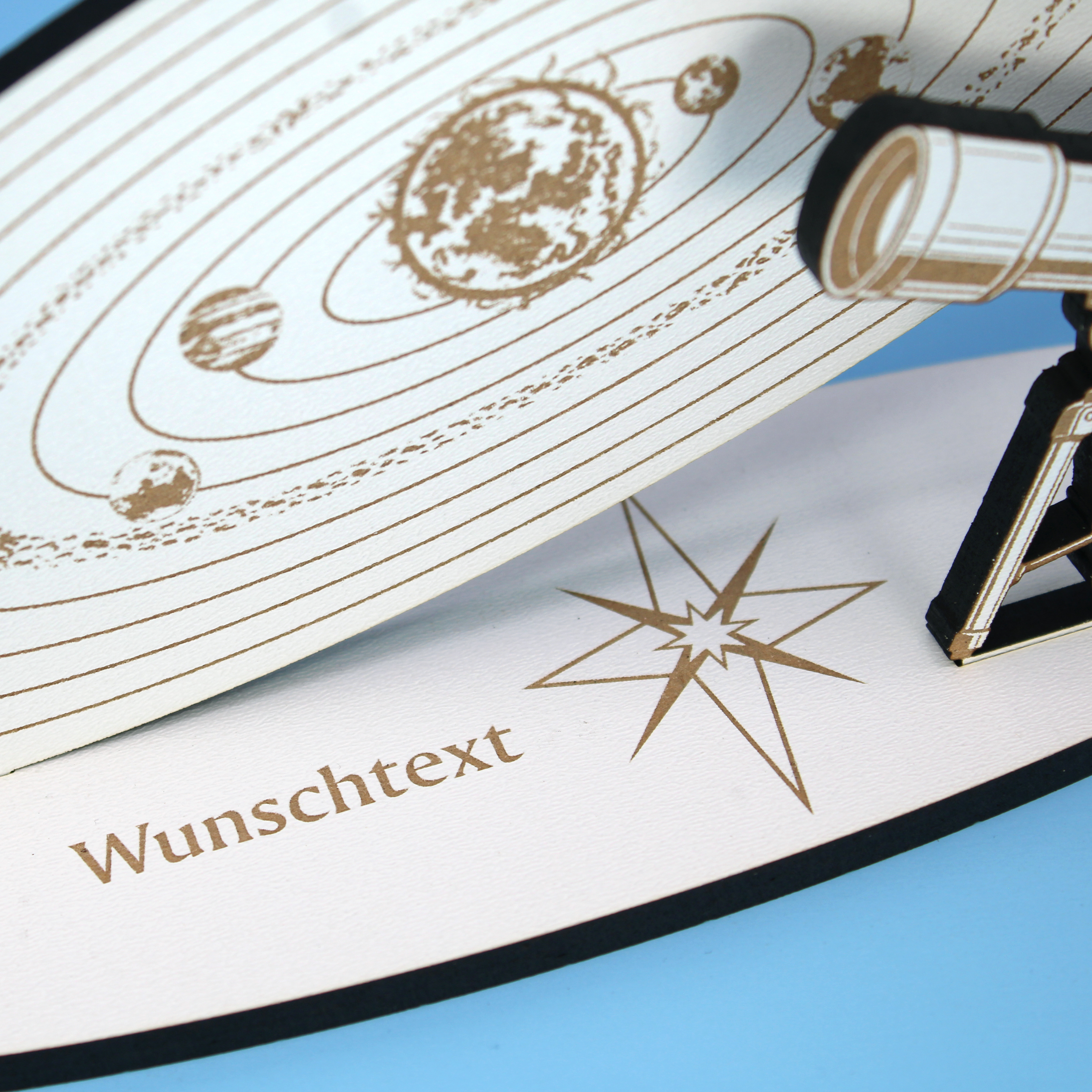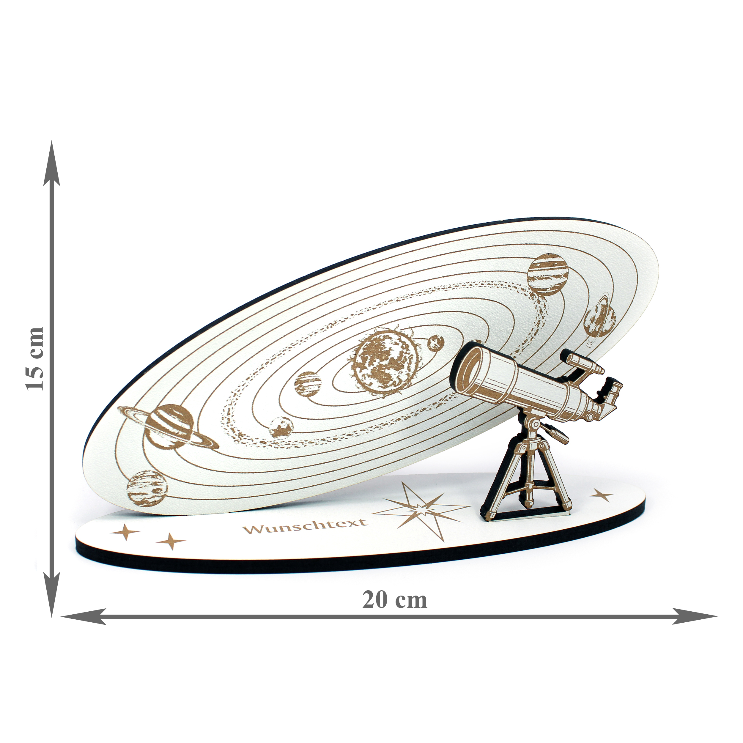 Produktinformationen "Geldgeschenk Sonnensystem – Deko Aufsteller 20x10 cm mit brauner Gravur, Teleskop & personalisierbarem Sockel – Geschenkidee für Astronomie, Weltraum & Wissenschaft"